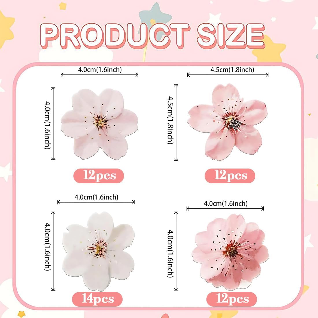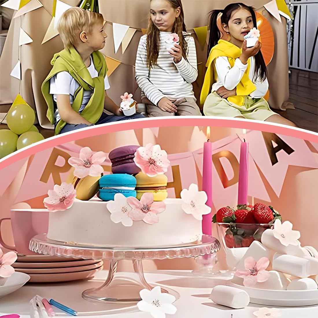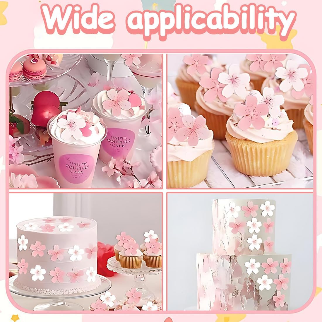 Decorazioni per Cupcake a Forma di Fiori Commestibili:Decorazioni per cupcake a forma di fiore: contiene 50 decorazioni per cupcake, comode da conservare e utilizzare. Quantità sufficiente per soddisfare le vostre diverse esigenze decorative. Decorazione per Torta a Forma di Fiori di Ciliegio:La decorazione è realizzata in carta di alta qualità, non facile da stropicciare, atossica, indeformabile e riutilizzabile. La decorazione può essere incollata direttamente sulla torta, il che la rende bella e resistente! Decorazione per Torta a Forma di Fiore:Queste decorazioni per cupcake a forma di fiore no commestibile sono utilizzate principalmente per la decorazione e rendono le torte creative e attirano l'attenzione di molte persone, rendendo la tua festa di compleanno più attraente e divertente, soddisfacendo i requisiti di decorazione di diverse occasioni Decorazioni per Torte a Forma di Fiori di Ciliegio Rosa:Le decorazioni per torte a forma di fiori di ciliegio sono facili da usare. Basta toglierli dalla scatola e posizionarli sulle torte e sui dessert che si desidera decorare. Dopo aver aperto la scatola e aver rimosso i fiori di riso glutinoso, coprirla per evitare che entri acqua Ampia Applicazione:Le decorazioni per cupcake con fiori no commestibili sono bellissime. Le decorazioni per torte a forma di fiori di ciliegio rosa possono essere utilizzate per decorare piatti da dessert, dolci, biscotti, torte, frutta, brownies, gelati e altro ancora, e per esprimere la vostra fantasia. Decorazioni floreali per torte per compleanni, feste a tema floreale, feste in giardino, feste primaverili, anniversari e altre occasioni