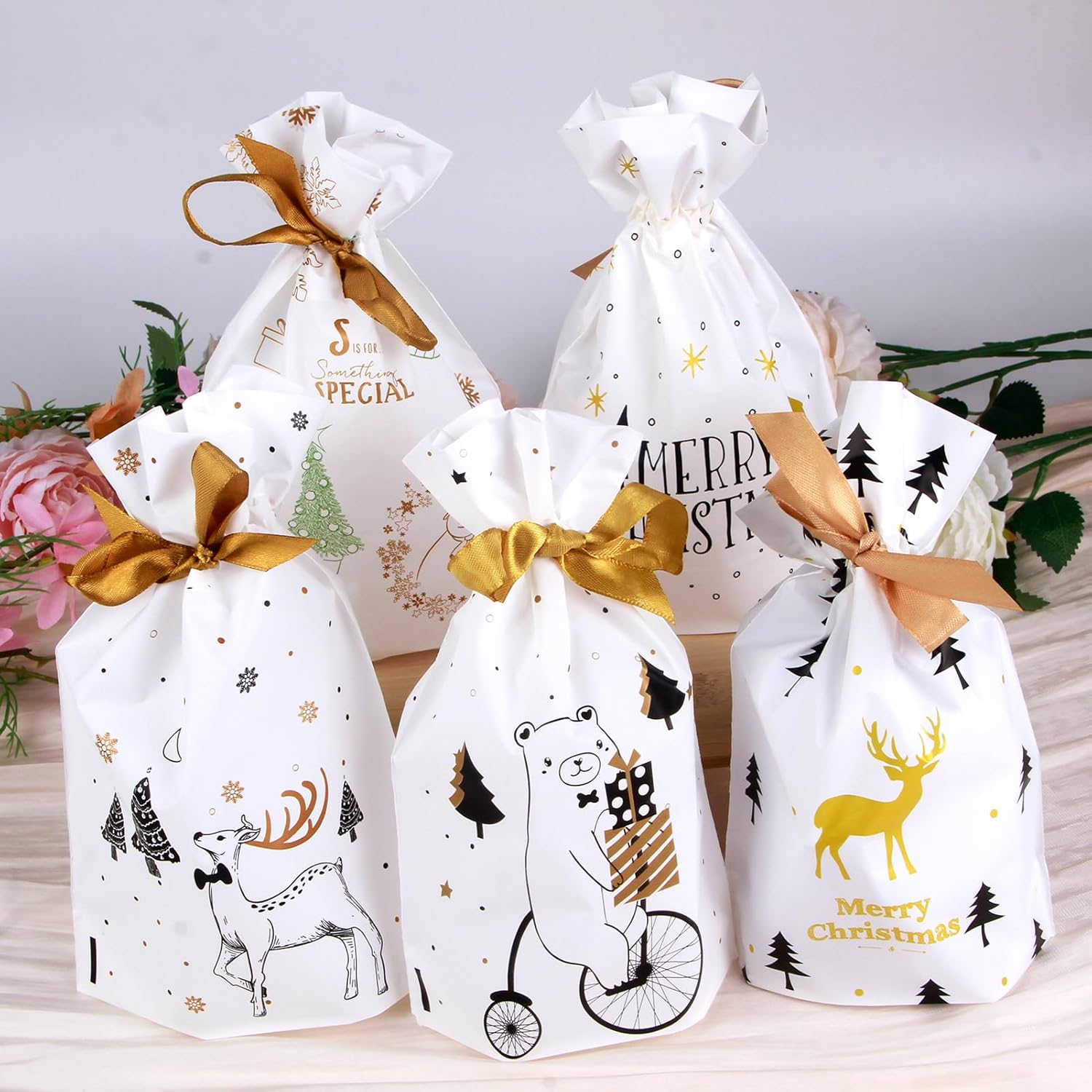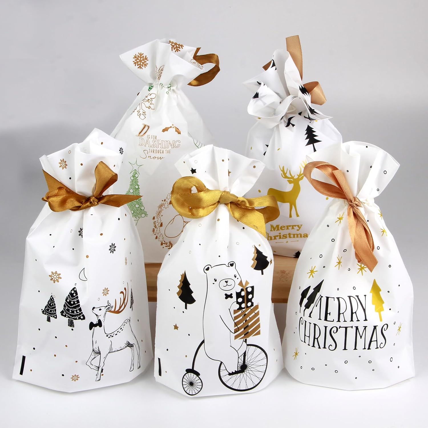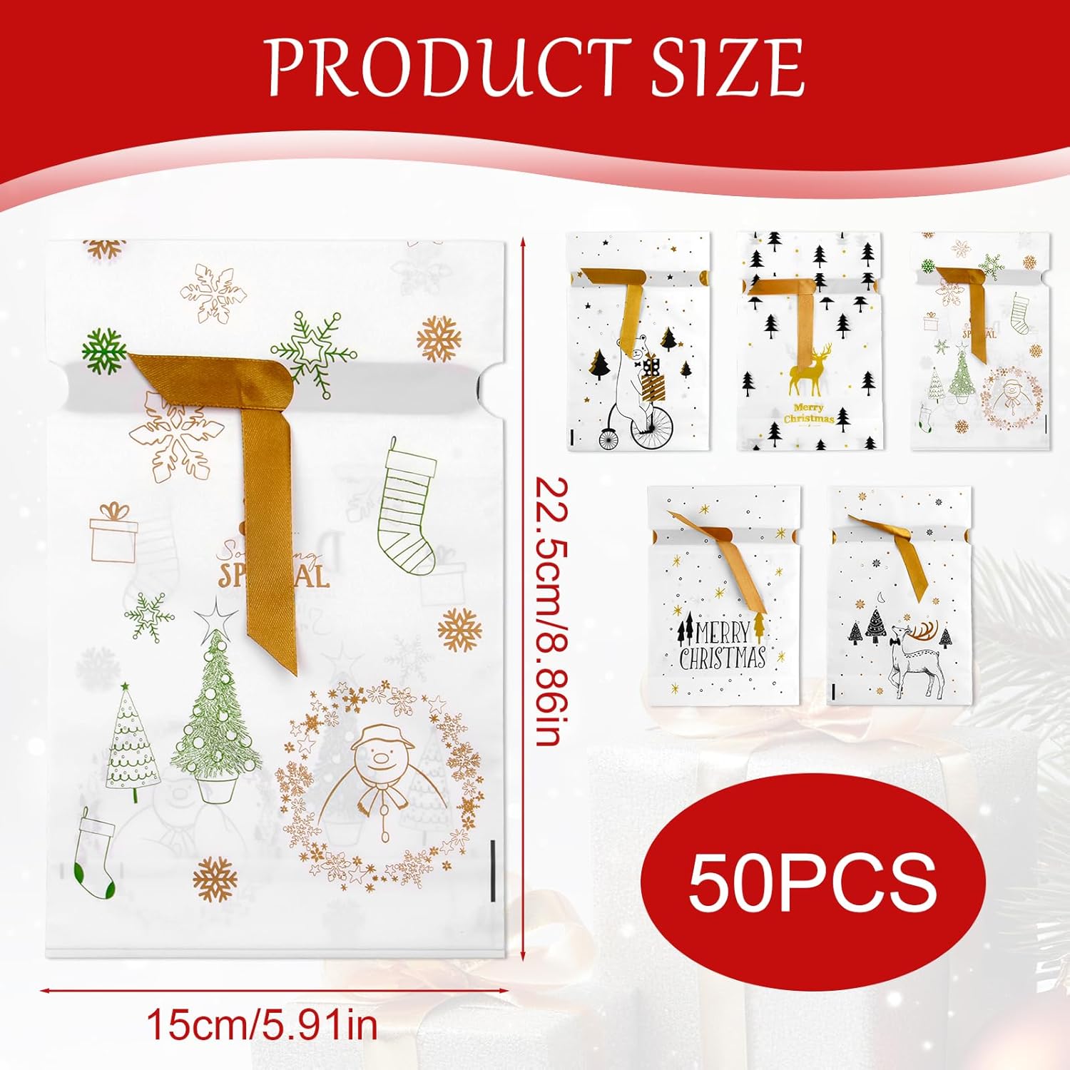 Materiali di alta qualità: i nostri sacchetti regalo di Natale sono realizzati con materiali sicuri e durevoli, non tossici e riutilizzabili. Garantiscono la freschezza dei tuoi dolcetti e prevengono fuoriuscite indesiderate. Vari motivi natalizi: ogni borsa è progettata con un motivo natalizio unico, come alberi di Natale, fiocchi di neve e altro ancora. Questi motivi donano alla tua decorazione festiva un'atmosfera colorata e allegra. Pratica coulisse: i sacchetti regalo sono dotati di un pratico cordoncino che facilita la chiusura e l'apertura dei sacchetti. Ciò mantiene i tuoi dolcetti freschi e sicuri. Applicazione versatile: le nostre borse sono perfette per avvolgere caramelle, biscotti, prodotti da forno e altri piccoli regali. Sono ideali per feste di Natale, calendari dell'Avvento, scambi di regali e altro ancora. Soddisfazione del cliente garantita: attribuiamo grande importanza alla soddisfazione dei nostri clienti. Se hai domande o dubbi, saremo felici di aiutarti e offrirti una soluzione soddisfacente.