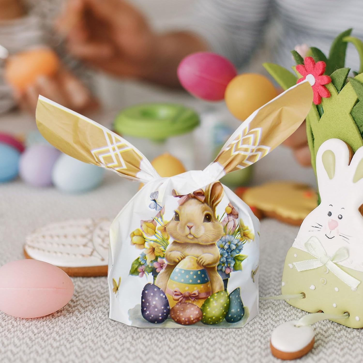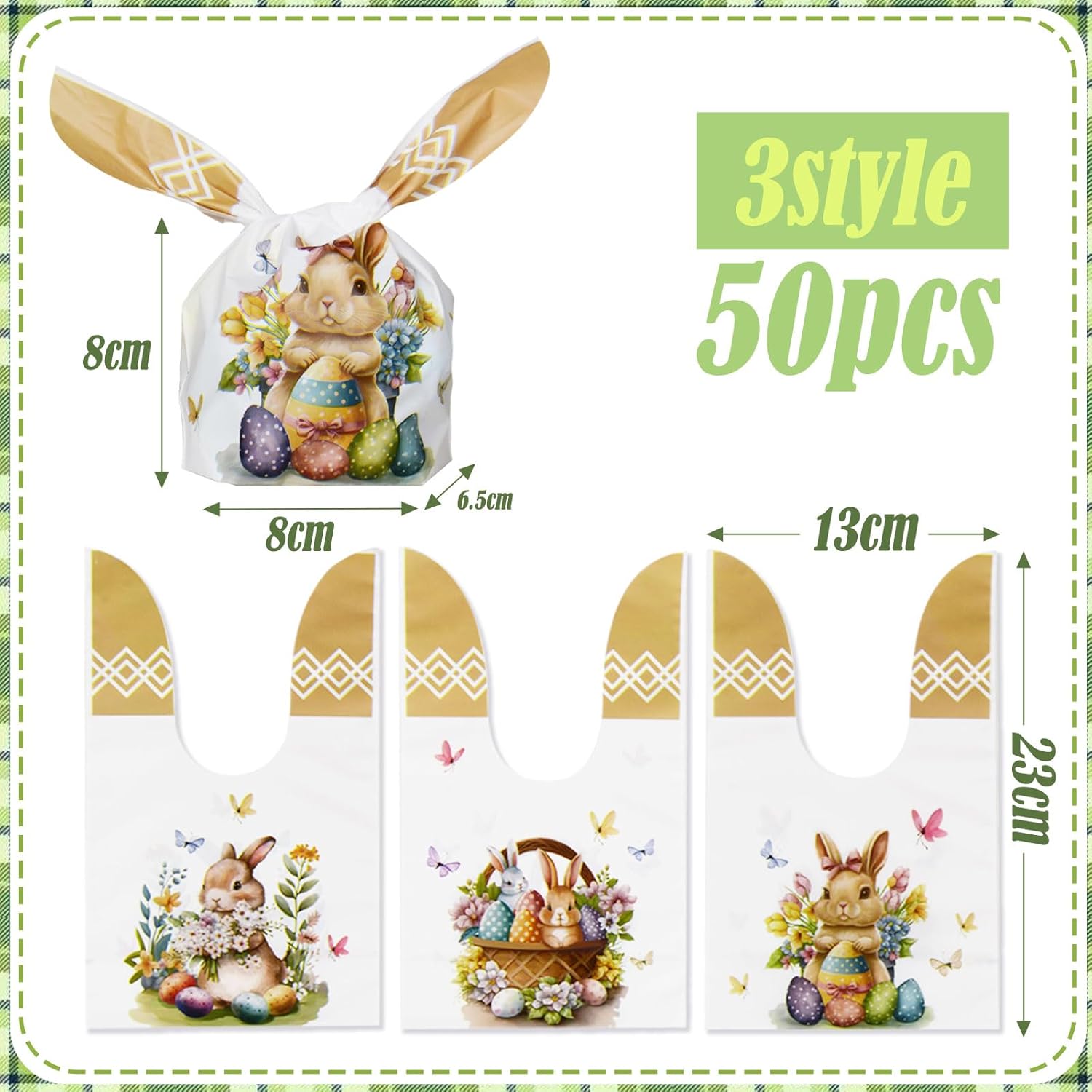 Borse pasquali: riceverai 50 sacchetti regalo pasquali in 3 modelli diversi. Goditi la tua buona Pasqua con questi bellissimi sacchetti di caramelle pasquali. Misura corretta: i sacchetti pasquali misurano 23 x 14 cm e il fondo è largo 3 cm. Assicurati che questa taglia sia adatta a te prima dell'acquisto. Bellissimo materiale: realizzati in plastica, i sacchetti pasquali sono leggeri, resistenti e facili da usare. Design con orecchie da coniglio: queste borse da festa di Pasqua sono progettate con due graziose orecchie da coniglio, che sono pratiche e divertenti. I colorati motivi pasquali stampati sulle borse come pulcini e coniglietti porteranno tanto divertimento. Ampie applicazioni: queste borse per feste di Pasqua sono adatte per caramelle, biscotti, ciambelle, cioccolatini o piccoli regali. Metti dentro le tue caramelle o i tuoi regali per fare una grande sorpresa ai tuoi bambini.