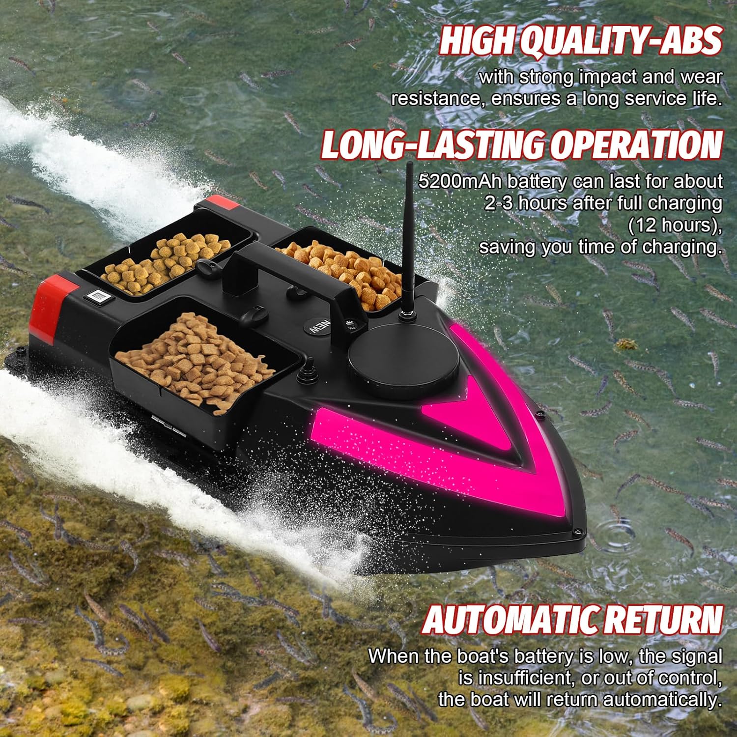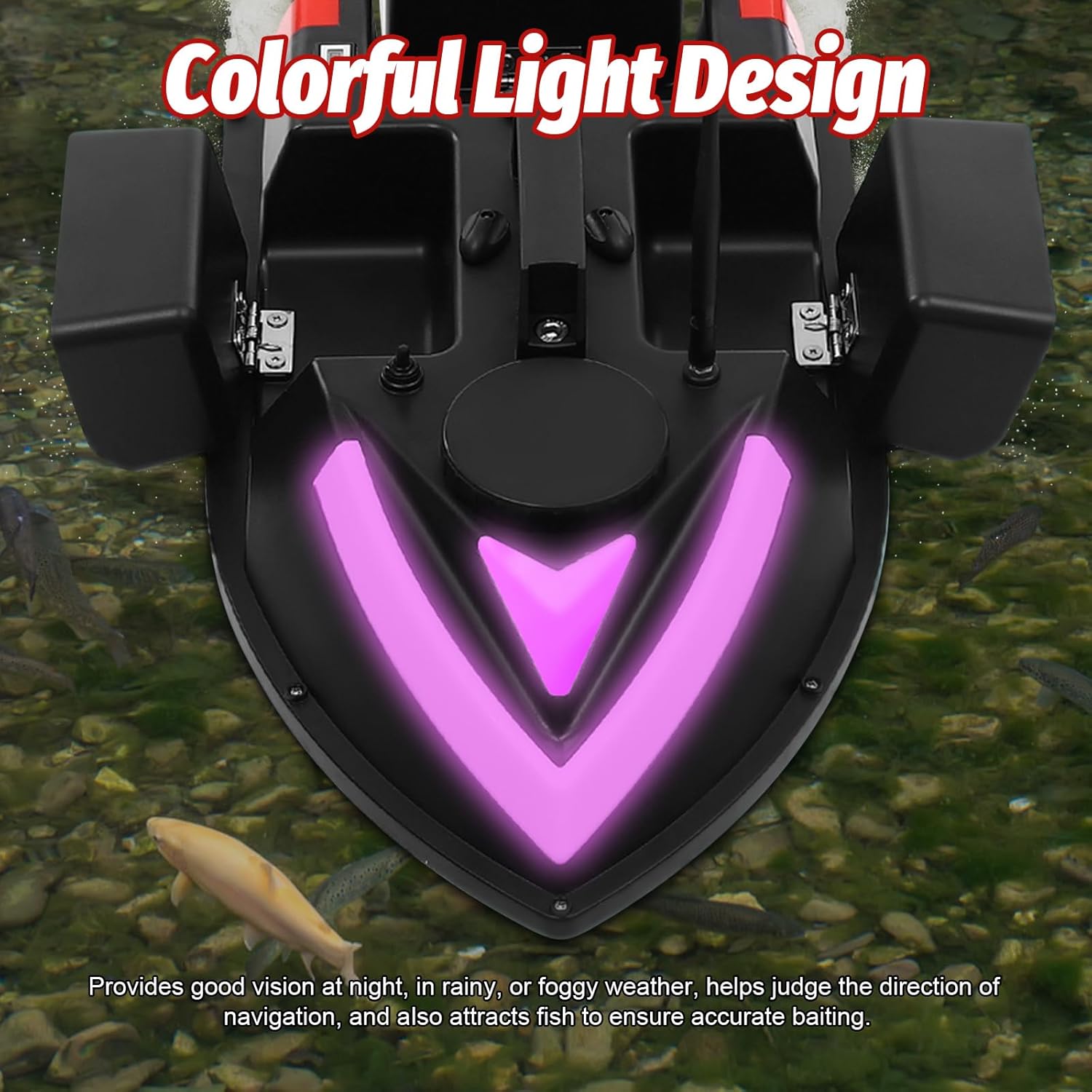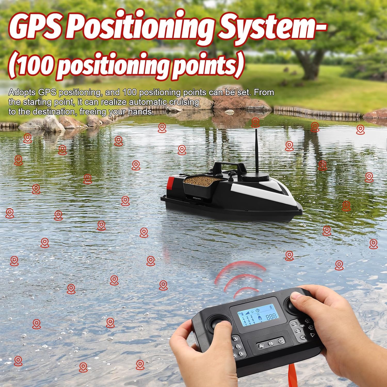 Alta durata: ABS di alta qualità con forte resistenza agli urti e all'abrasione, che garantisce una lunga durata. 【Design intelligente】 I due motori con giroscopi possono effettuare regolazioni tempestive se differiscono dalla rotta originale. 【Corsa punto fisso】 Questa barca da pesca funziona con posizionamento GPS e può essere impostata su 100 punti di posizione. Dal punto di partenza, può guidare automaticamente verso il punto di destinazione in modo da avere le mani libere. Ritorno automatico: quando la batteria della barca è scarica, il segnale è insufficiente o è fuori controllo, la barca ritorna automaticamente. Design intelligente: la batteria da 5200 mAh di grande capacità dura circa 2-3 ore dopo una carica completa (12 ore). Ogni scatola laterale può contenere fino a 1,1 libbre di esche e la scatola posteriore può contenere fino a 0,55 libbre.