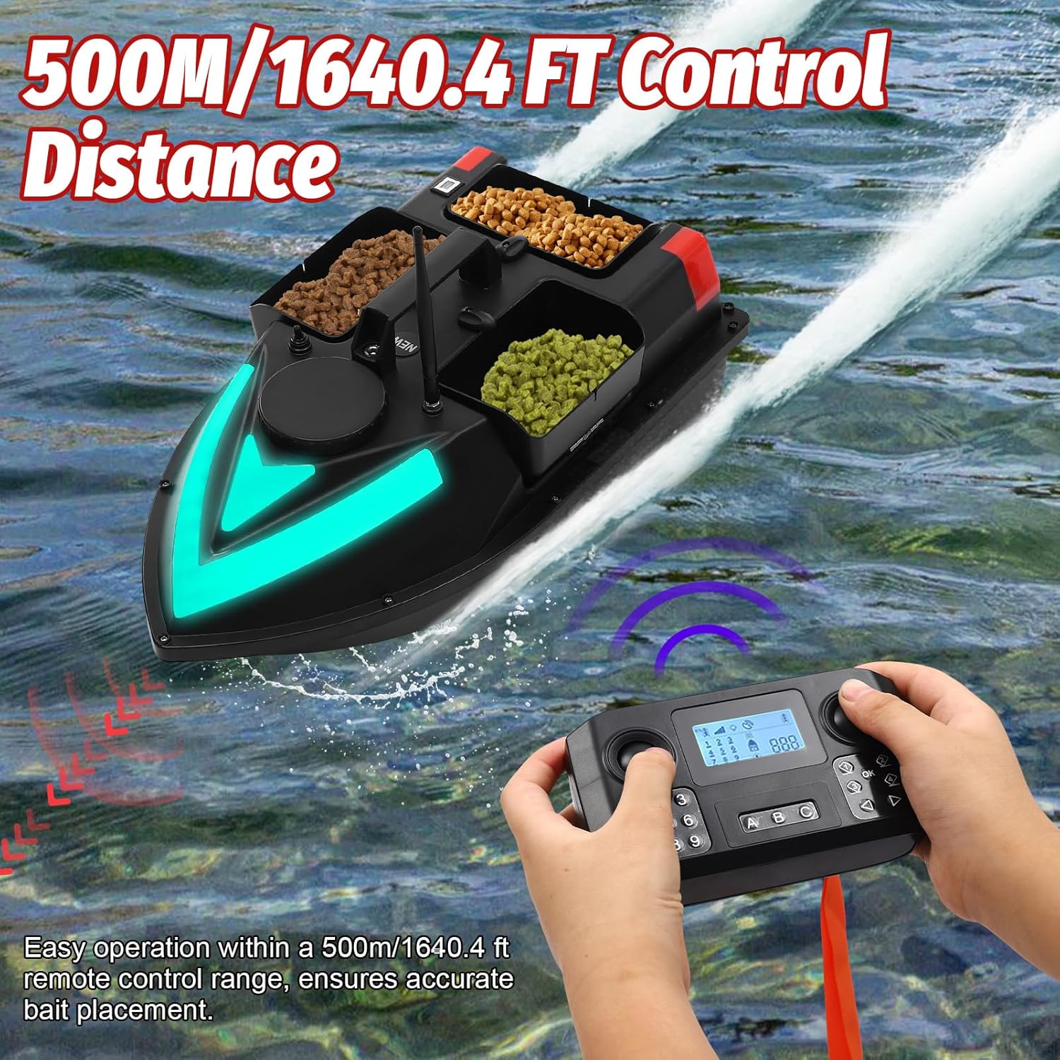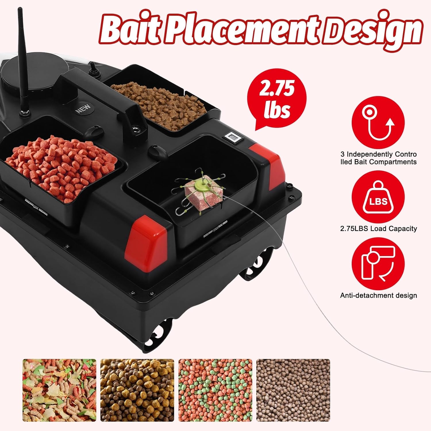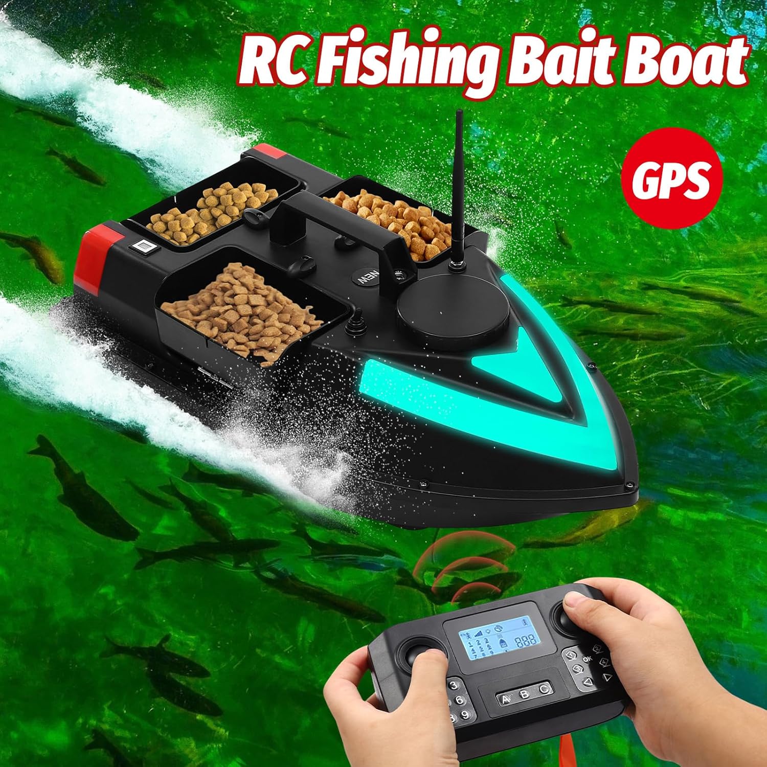 Alta durata: ABS di alta qualità con forte resistenza agli urti e all'abrasione, che garantisce una lunga durata. 【Design intelligente】 I due motori con giroscopi possono effettuare regolazioni tempestive se differiscono dalla rotta originale. 【Corsa punto fisso】 Questa barca da pesca funziona con posizionamento GPS e può essere impostata su 100 punti di posizione. Dal punto di partenza, può guidare automaticamente verso il punto di destinazione in modo da avere le mani libere. Ritorno automatico: quando la batteria della barca è scarica, il segnale è insufficiente o è fuori controllo, la barca ritorna automaticamente. Design intelligente: la batteria da 5200 mAh di grande capacità dura circa 2-3 ore dopo una carica completa (12 ore). Ogni scatola laterale può contenere fino a 1,1 libbre di esche e la scatola posteriore può contenere fino a 0,55 libbre.