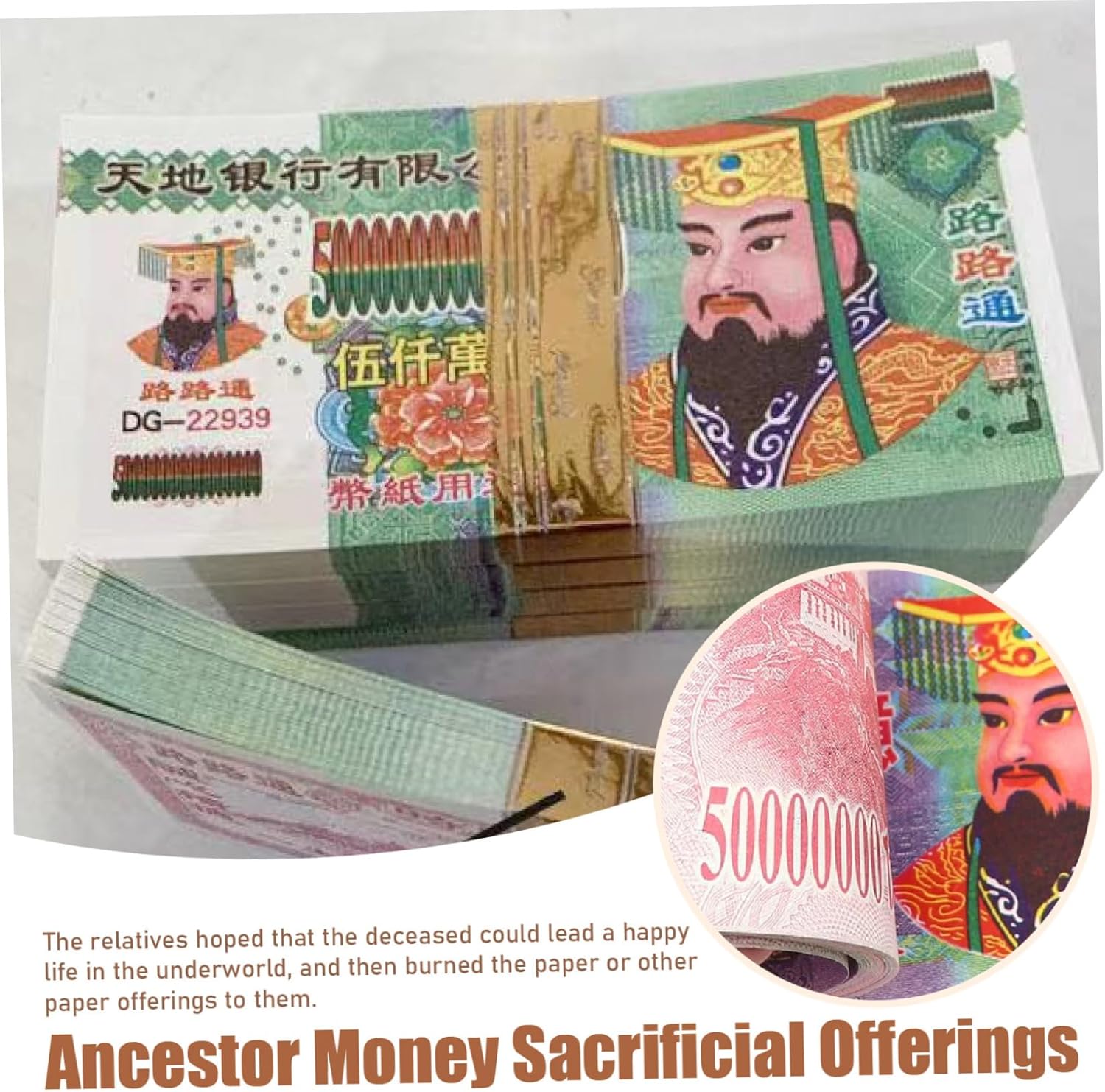 Nota: prestare attenzione alla sicurezza antincendio quando si bruciano banconote cinesi, le offerte sacrificali odorano leggermente quando bruciano, si prega di bruciare nelle prese d'aria o negli antenati all'aperto. I parenti speravano che il defunto potesse condurre una vita felice nel mondo sotterraneo, e bruciarono carta moneta cinese e altri sacrifici di carta. Rafforza il legame con i tuoi antenati bruciando banconote dalla Banca Infernale dell'Imperatore di Giada. Brucia denaro degli antenati per loro e loro si prenderanno cura di te denaro fuzzy realistico denaro 100. In primo luogo, questo denaro degli antenati è puramente simbolico e non è ufficialmente riconosciuto come una forma di valuta valida da nessun istituto bancario o agenzia governativa. le denominazioni sono casuali..In terzo luogo, quando si brucia il denaro degli antenati, dare sempre la priorità alla sicurezza..Bruciare in un'area ben ventilata, preferibilmente in un contenitore di metallo, e assicurarsi che le braci siano completamente spente una volta terminato. Il denaro degli antenati può essere utilizzato nei funerali, nell'anniversario della morte degli antenati, nel Festival di Qingming, nel Festival di Obon o nel Festival dei fantasmi affamati, creando un collegamento tra il mondo fisico e il regno spirituale. Serve come segno di amore, rispetto e ricordo, esprimendo il desiderio di condividere le proprie benedizioni mondane con i propri antenati. commemorando le tradizioni degli antenati, il denaro dei nostri antenati è un profondo artefatto culturale. Inoltre, può essere utilizzato come decorazione unica o regalo premuroso per coloro che apprezzano la filosofia e la spiritualità. L'inferno nota la carta sacrificale del denaro degli antenati.