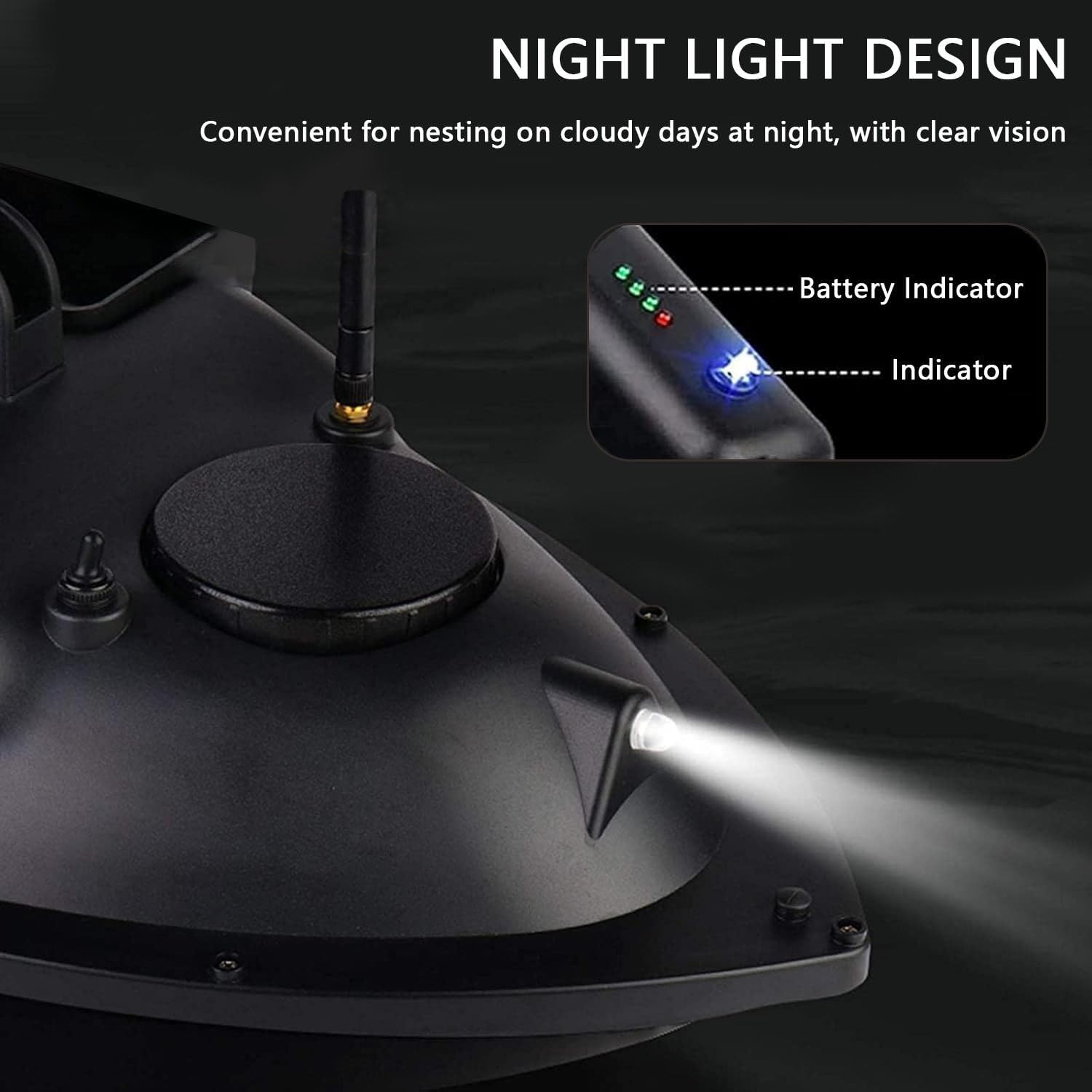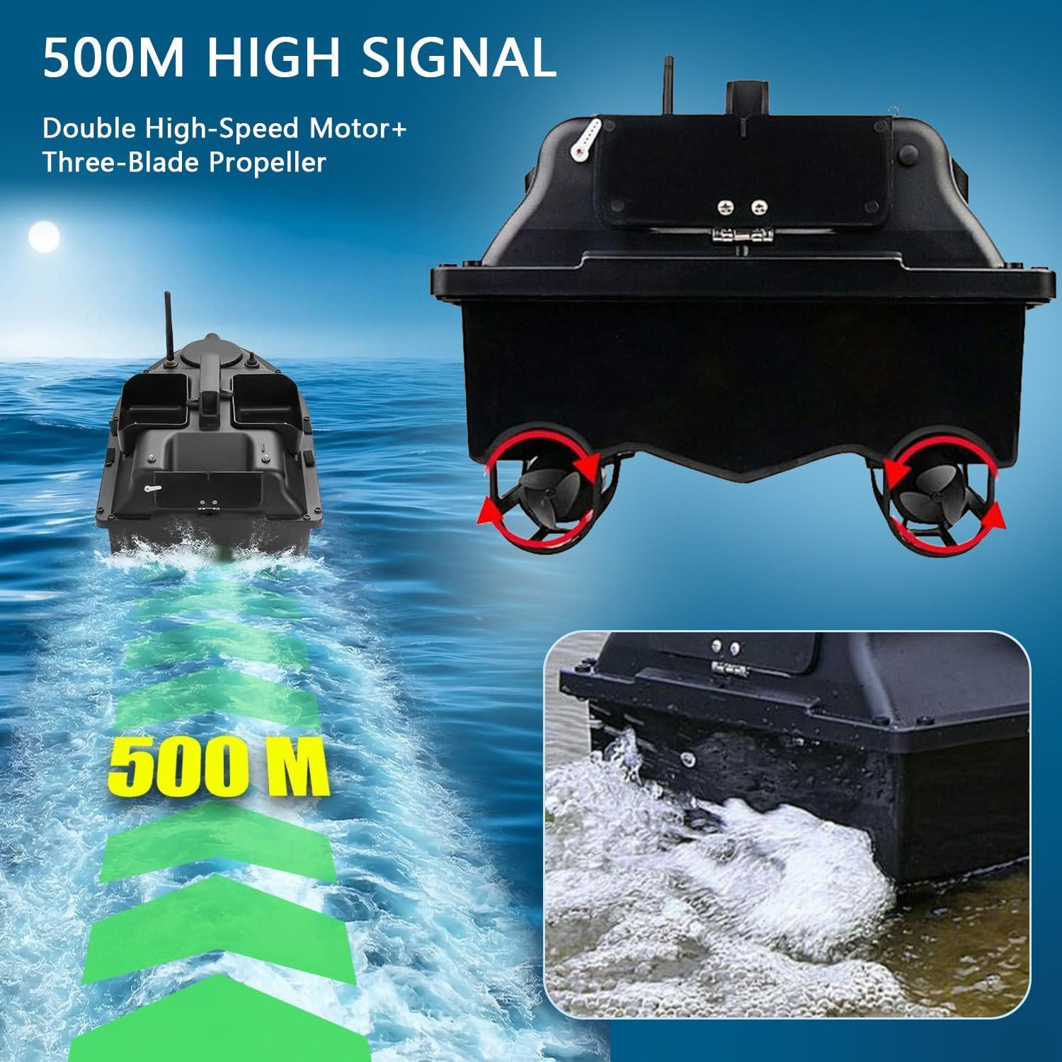 【Tre Caricatori per Esche Da Pesca】Realizzati in materiale industriale ABS, impermeabili, indossabili e galleggianti; tre tramogge possono caricare più di 2kg di esche. I potenti motori doppi sono dotati di eliche a 3 pale. Giudicare la direzione di navigazione precisa con luce notturna. 【Prestazioni Della Barca】Grazie al corpo largo e stabile, può resistere a venti di livello 7-8, essendo utilizzato dai laghi agli oceani; batteria da 12000 mAh, lunga durata in standby fino a 3-4 ore; correzione intelligente, realizzando la linea retta e la velocità costante. 【Controller GPS】Il controller a due mani con tre punti di pesca GPS può raggiungere fino a 500M; ritorno intelligente con un tasto, crociera automatica; lo schermo LCD può visualizzare la posizione della barca e la distanza dalla costa. Quando la batteria è scarica, torna automaticamente alla sua posizione originale. 【Fish Finder LCD】Può simulare l'ambiente e il terreno sottomarino, visualizzare il punto e la profondità dello strato di pesci; il sensore sonar può rilevare la portata subacquea di 90° e la profondità di circa 100 m; leggero e adatto alla maggior parte dei metodi di pesca. 【Collegamento Di Barca E Fishfinder】Utilizzando la lenza per legare la tramoggia posteriore della barca e il sonar del fishfinder. Accendendo la barca, quando si raggiunge il punto GPS impostato, si accende lo schermo del fishfinder, si rileva l'area dell'acqua e si cercano i pesci.