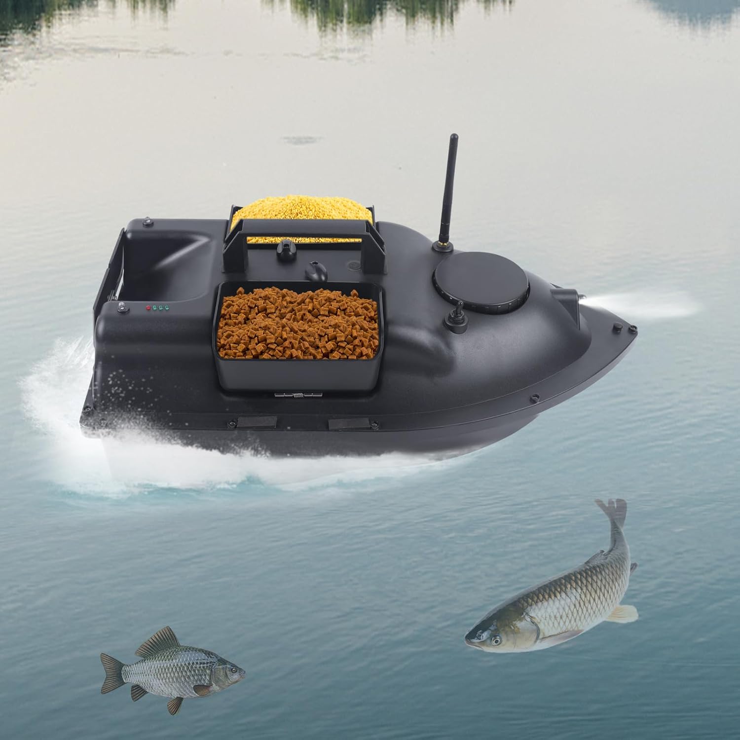 ♦ Speciale design in acciaio inox+scafo in plastica ABS, struttura forte e resistente agli strappi, impedisce alle imbarcazioni di danni da impatto di guida ad alta velocità. ♦ Un contenitore per esche con grande capacità può contenere 2 kg di esche. ♦Il design delle luci bicolore anteriori e posteriori, che può essere controllato a grande distanza, può confermare chiaramente la posizione della nave a grande distanza, e può fornire un buon ambiente di illuminazione in nuvoloso e notte per determinare il punto di posizionamento. ♦In caso di disturbi del segnale, la distanza del telecomando è di 500M, e l'esca può essere portato alla scuola di pesce denso, e non c'è bisogno di preoccuparsi per il problema della portata insufficiente del telecomando. ♦ Design leggero, comodo per nidificare di notte. Le luci bicolore anteriori e posteriori confermano chiaramente la posizione della nave a grande distanza.Il tempo di standby lungo è fino a 2-3 ore.