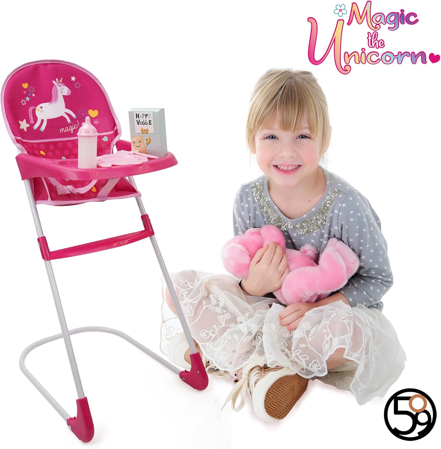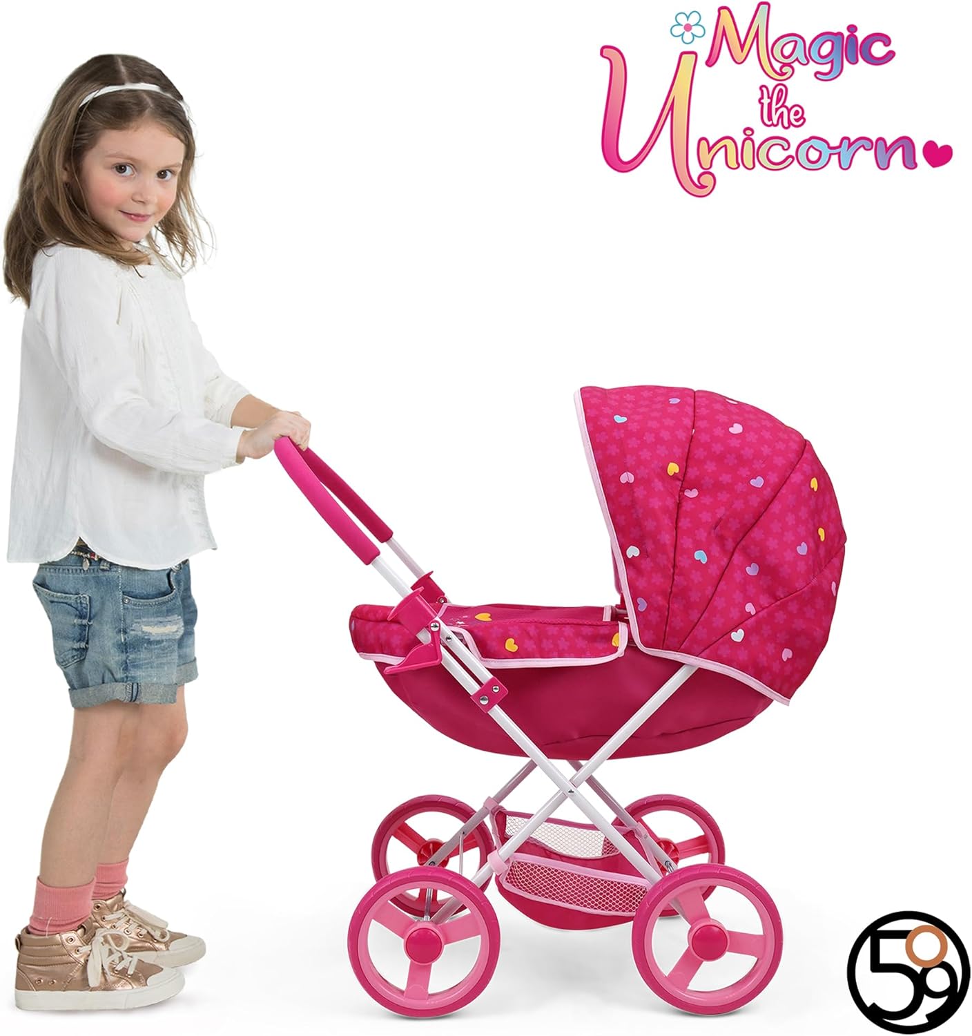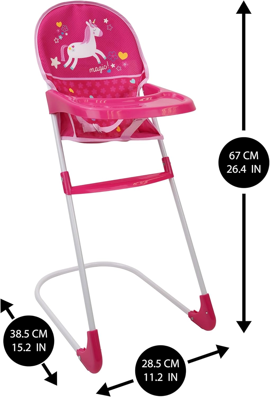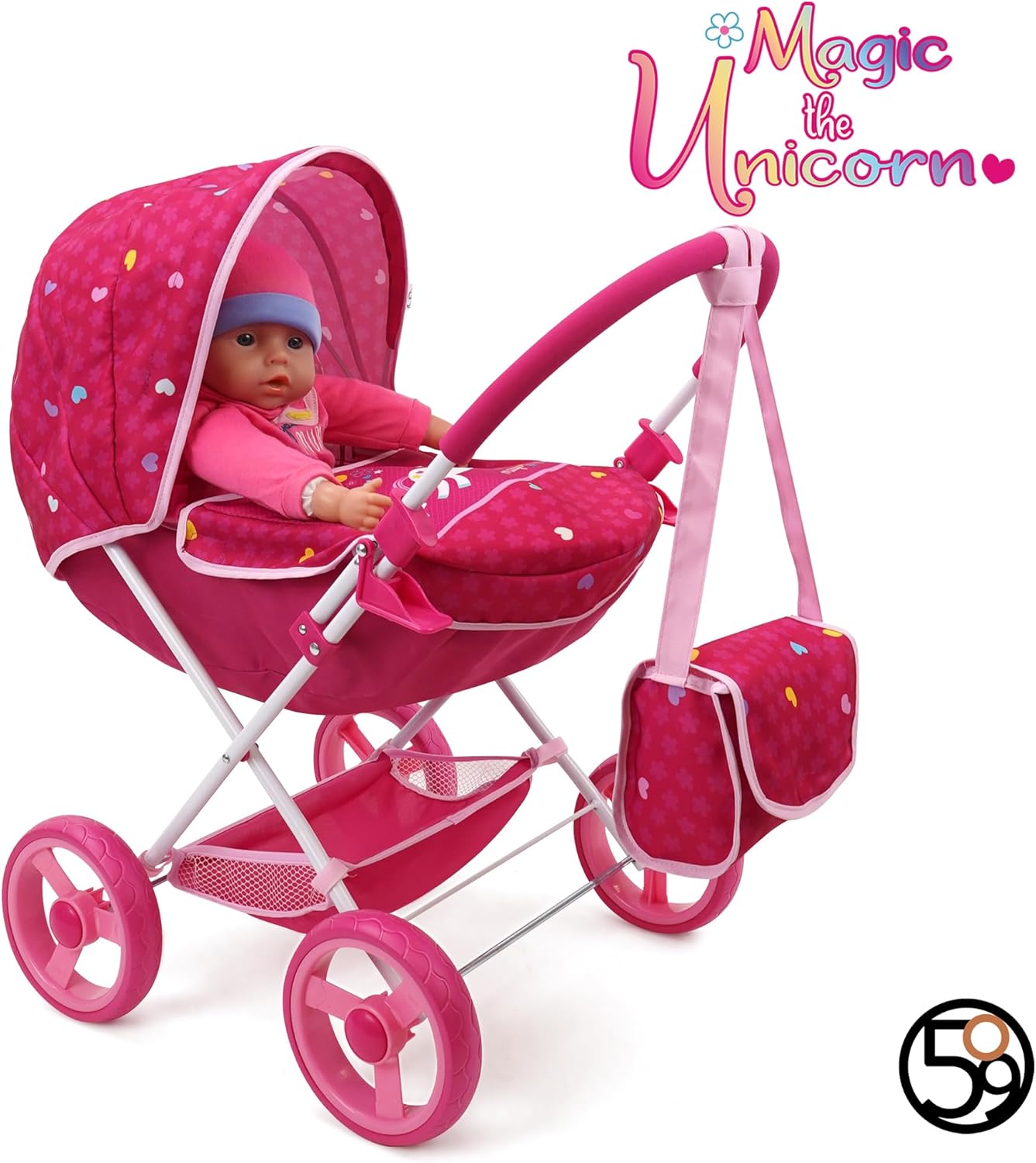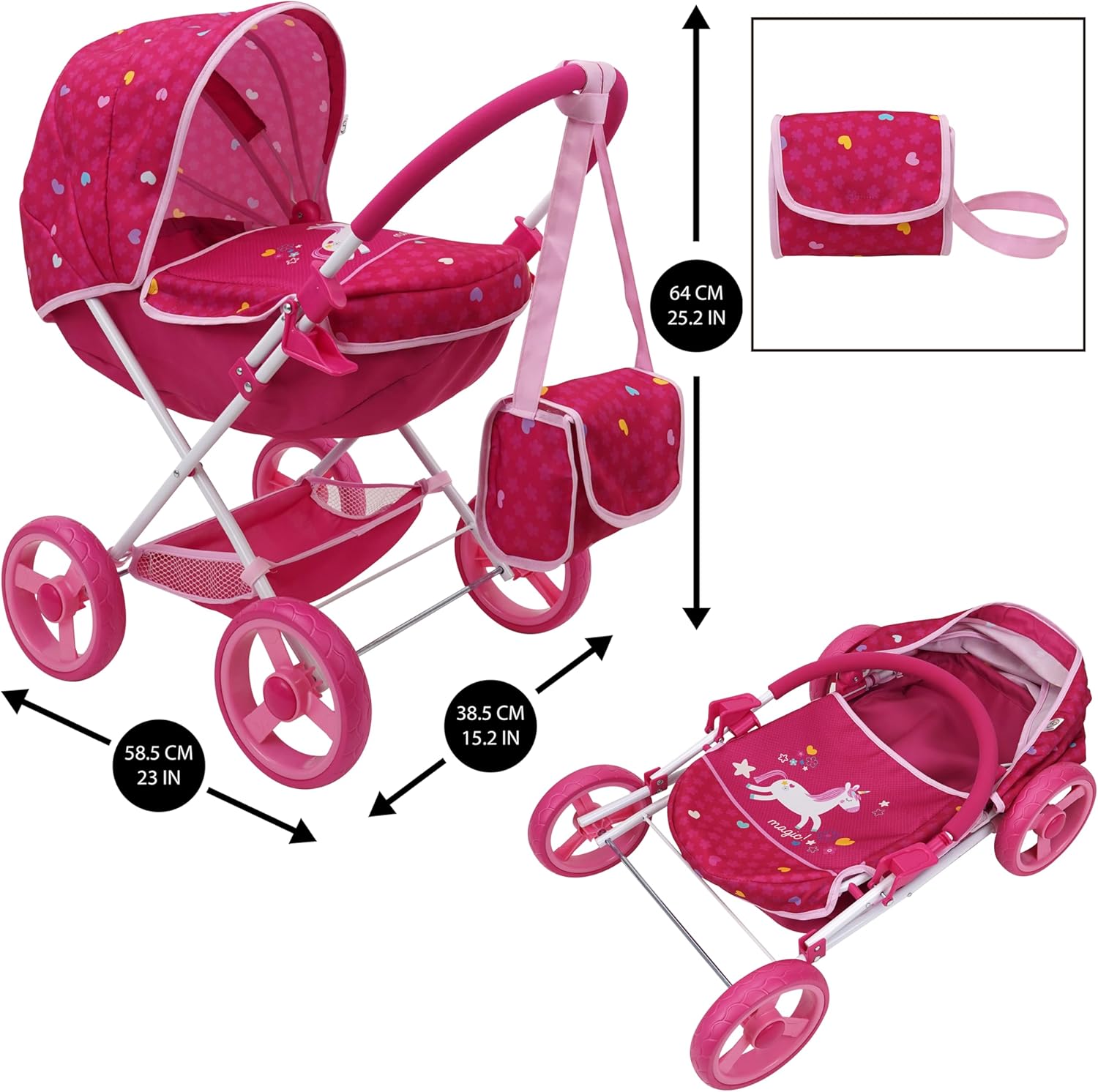 PERFECT PLAYTIME: Combo Doll Pram Set comes with Deluxe Doll Pram, Doll High Chair, Doll Changing Bag and 5 Piece Doll Feeding Accessories. Allows your child fun time to learn and play caring and sharing. SPECIAL FEATURES: Just like the grown-ups! DELUXE DOLL PRAM has full size canopy and big shopping basket. Large 15.25cm/6" EVA wheels are stable and sporty, suitable for any activity. GOOD SIZE: Made for GOOD SIZE: Made for dolls or toys up to 46cm. You add your own favorite doll or teddy bear. This personalizes the item for your child. Fold away quickly and simply for storage in the playroom or the car.dolls or toys up to 46cm. You add your own favorite doll or teddy bear. This personalizes the item for your child. Fold away quickly and simply for storage in the playroom or the car. FABRIC CARE: DOLL HIGH CHAIR / CHANGING BAG in matching color design. Cover can be easily removed and are machine washable. On the pram the fabric can be wiped down with a damp cloth, so any spills easily cleaned away. DESIGN: Cute and Happy Flora design , filling the day with a good vibes and laughter! The perfect gift for any special occasion. Birthdays, or simply because it's a good day!