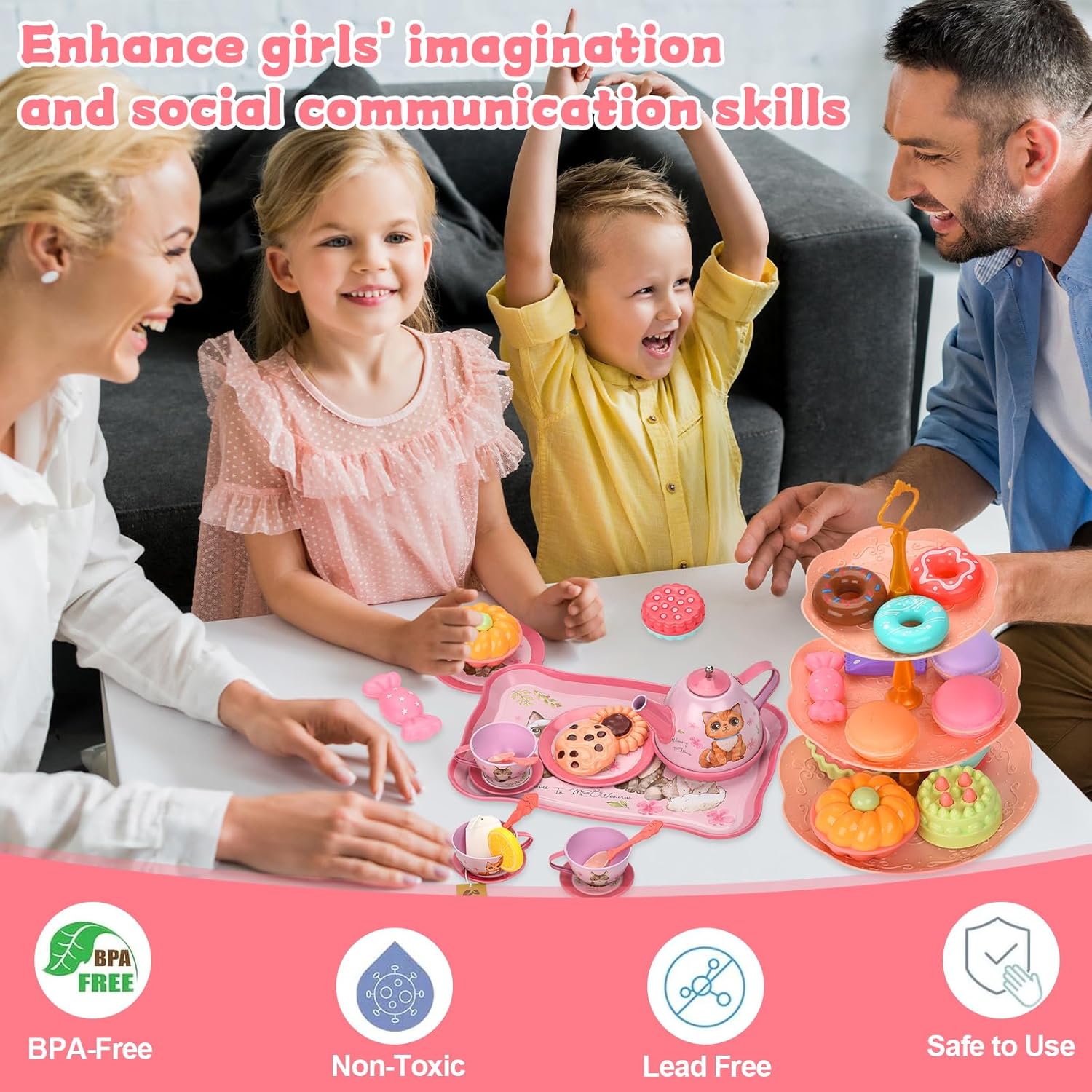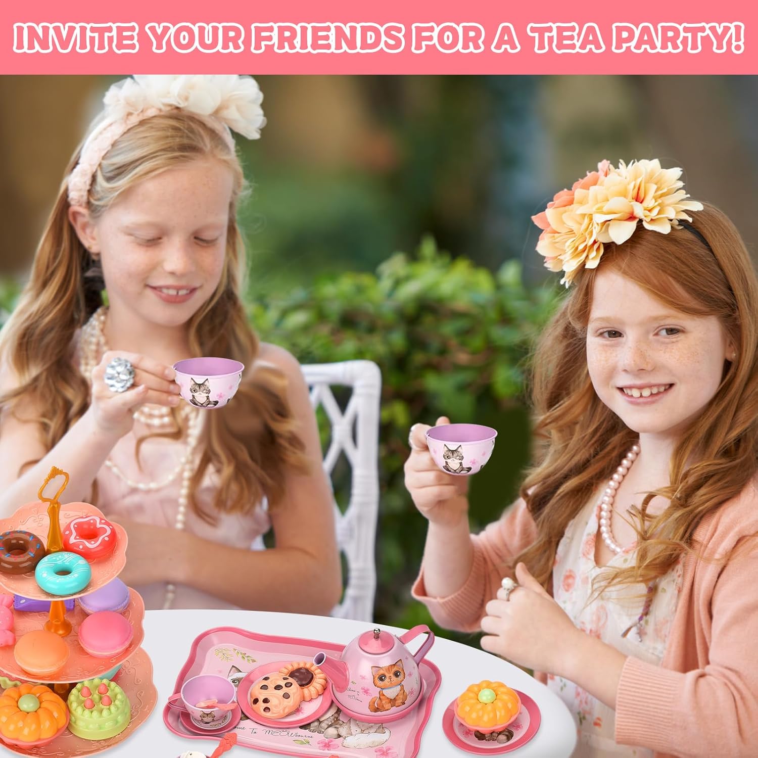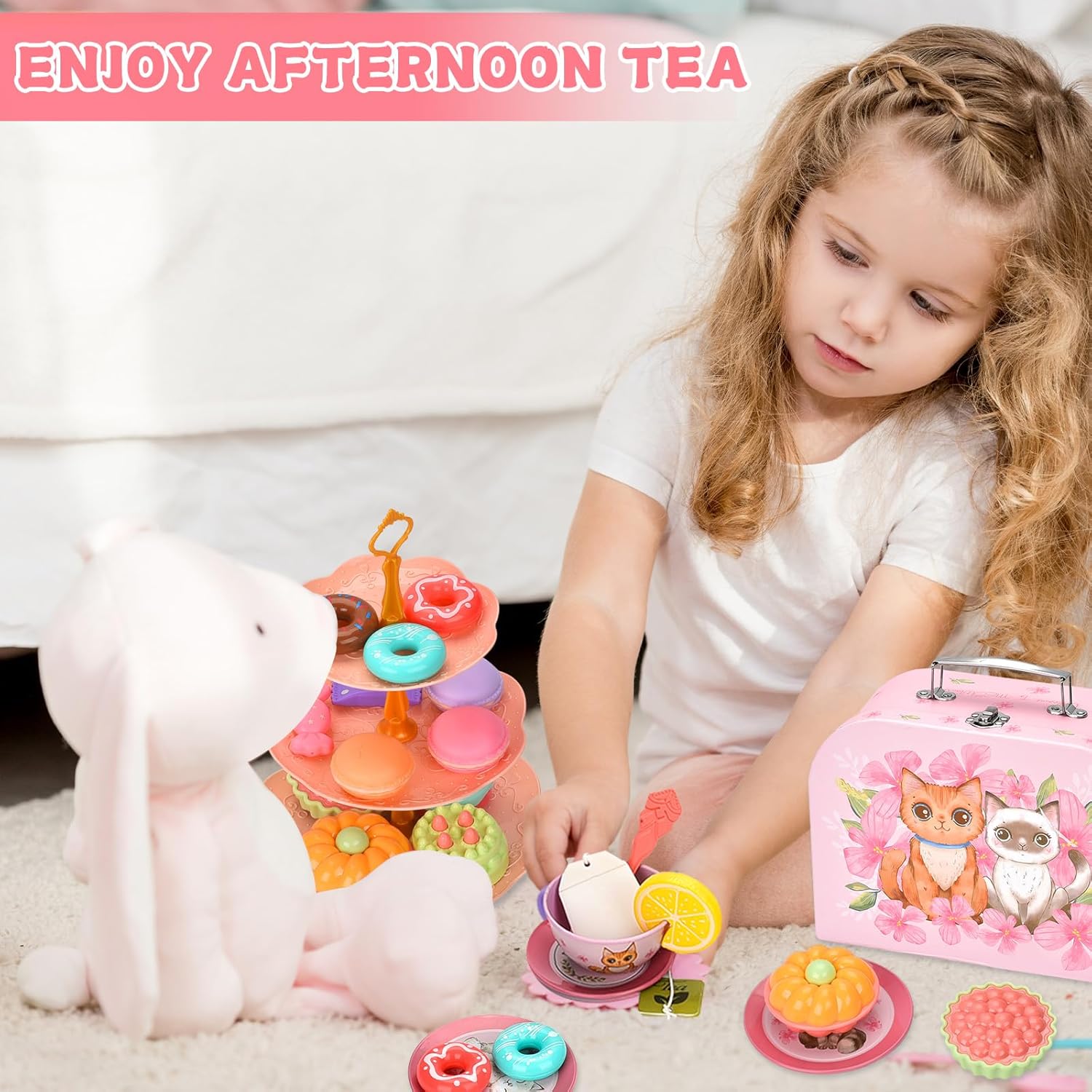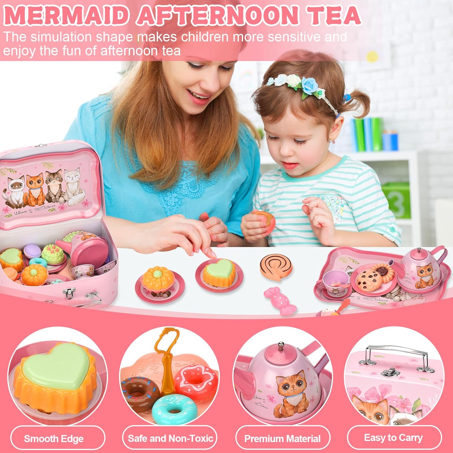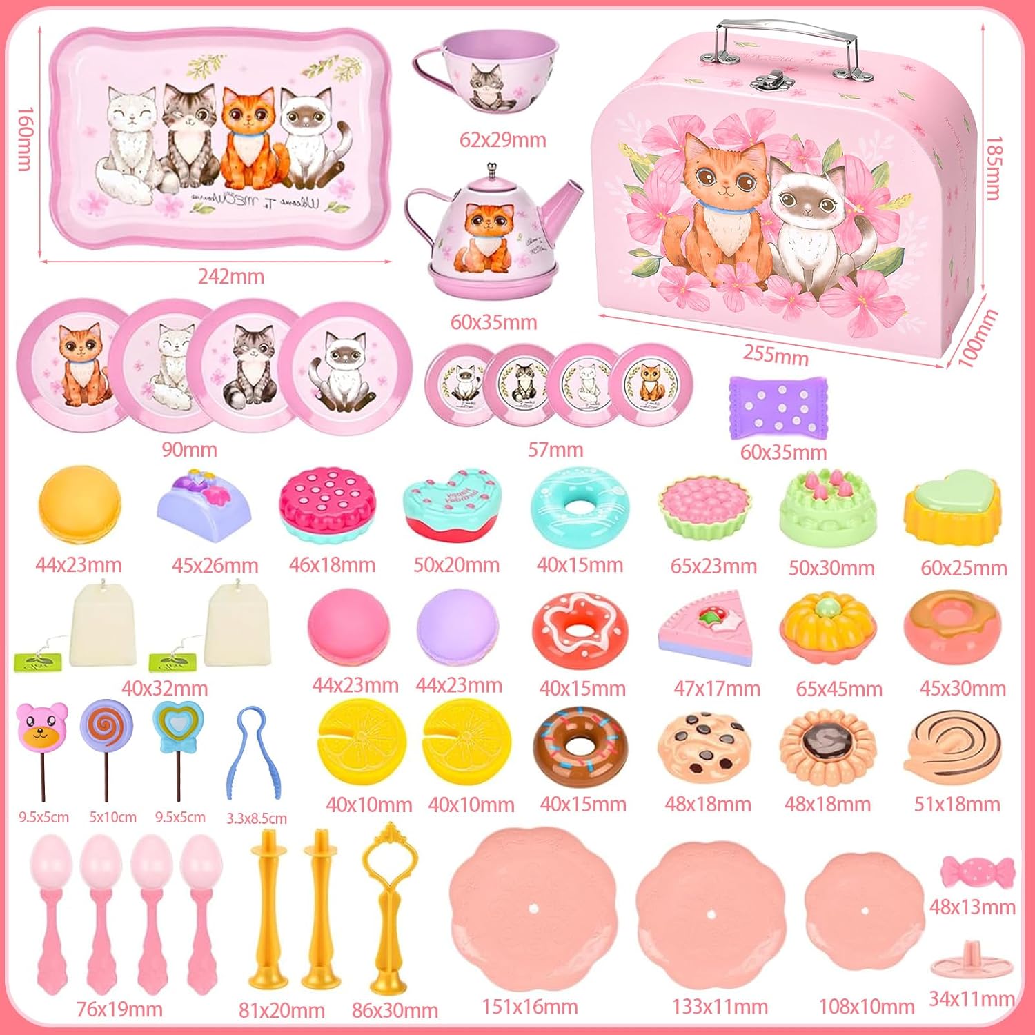 🍰【54 set da tè】1*teiera di latta, 4*tazze da tè di latta, 4*sottobicchieri di latta, 4*piatti di latta, 4*cucchiaio, 1*vassoio da dessert a 3 livelli, 1*vassoio di latta, 2*bustine di tè, 2*limone fette, 2* caramelle, 4* ciambelle, 8* torte, 3* biscotti, 3* amaretti, 1* borsa di cartone, 3* lecca-lecca casuali, 1* clip. ☕ 【Set da tè di sicurezza per bambini】 Il nostro set da tè a sirena è realizzato in banda stagnata sicura e altri set da tè sono realizzati con materiali plastici non tossici e innocui, con una bocca liscia a forma di tazza, che può proteggere i bambini dalle lesioni durante il gioco ed è comodo anche per la pulizia. Tutte le parti sono durevoli e possono essere riutilizzate e giocate. 🧰【Giocattolo portatile per Tea Party】Viene fornito con una graziosa scatola di cartone con fiori di gatto rosa. Con maniglia per riporlo facilmente, il suo peso leggero permette al tuo bambino di portarlo ovunque, così i tuoi bambini potranno portarlo con sé e giocare felici con i loro amici. 👧 【Gioco Tea Party】 Questo adorabile giocattolo per il tè pomeridiano è appositamente progettato per giochi di ruolo per ragazze, che può stimolare l'immaginazione dei bambini e promuovere la loro creatività incoraggiando tuo figlio a socializzare e comunicare con amici o familiari . La teiera con coperchio rimovibile che può effettivamente contenere e versare acqua, tè o succo per offrire un'esperienza di gioco più realistica! 🎁【Ottimo regalo per ragazze】 Ogni bambina ama il cosplay e questo set da tè giocattolo è progettato appositamente per le bambine. Non solo può coltivare l'apprendimento e le abilità pratiche delle ragazze fin dalla giovane età, ma anche rafforzare l'amore tra genitori e figli.