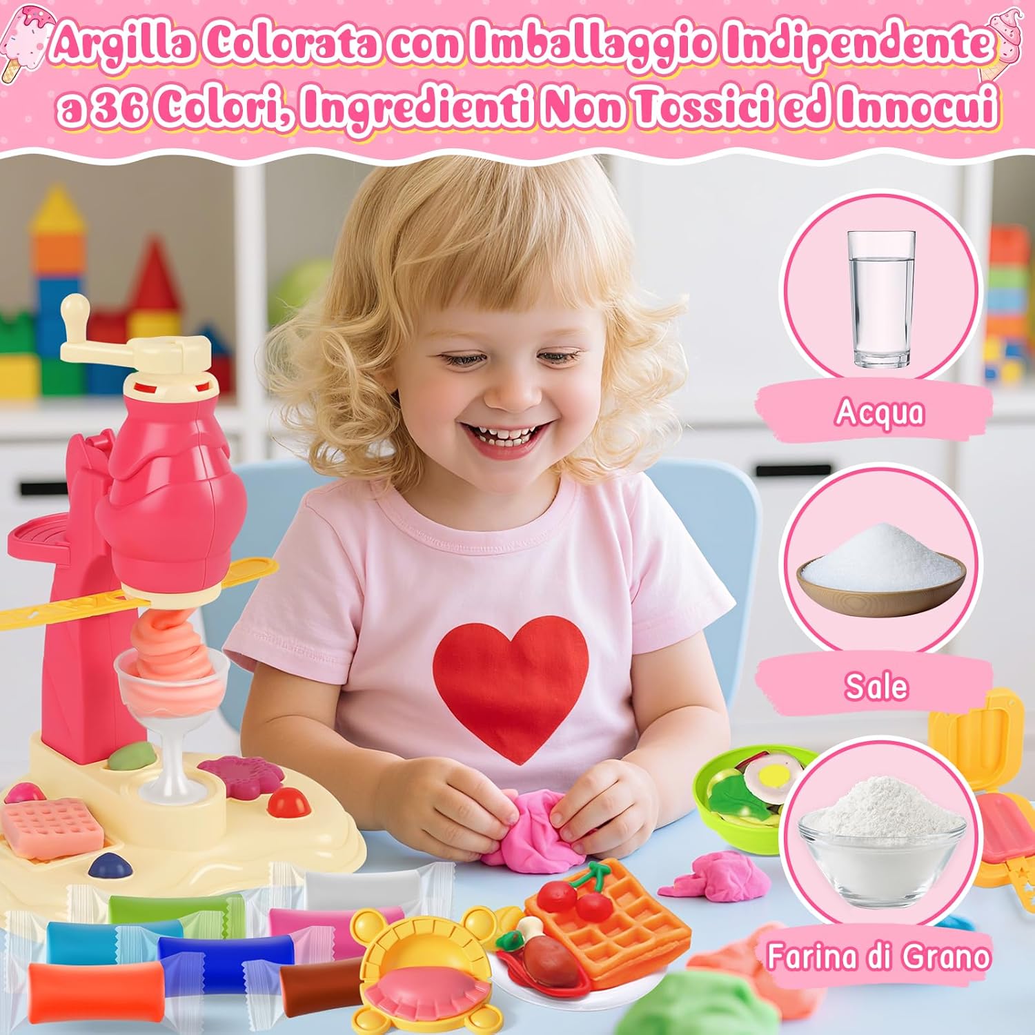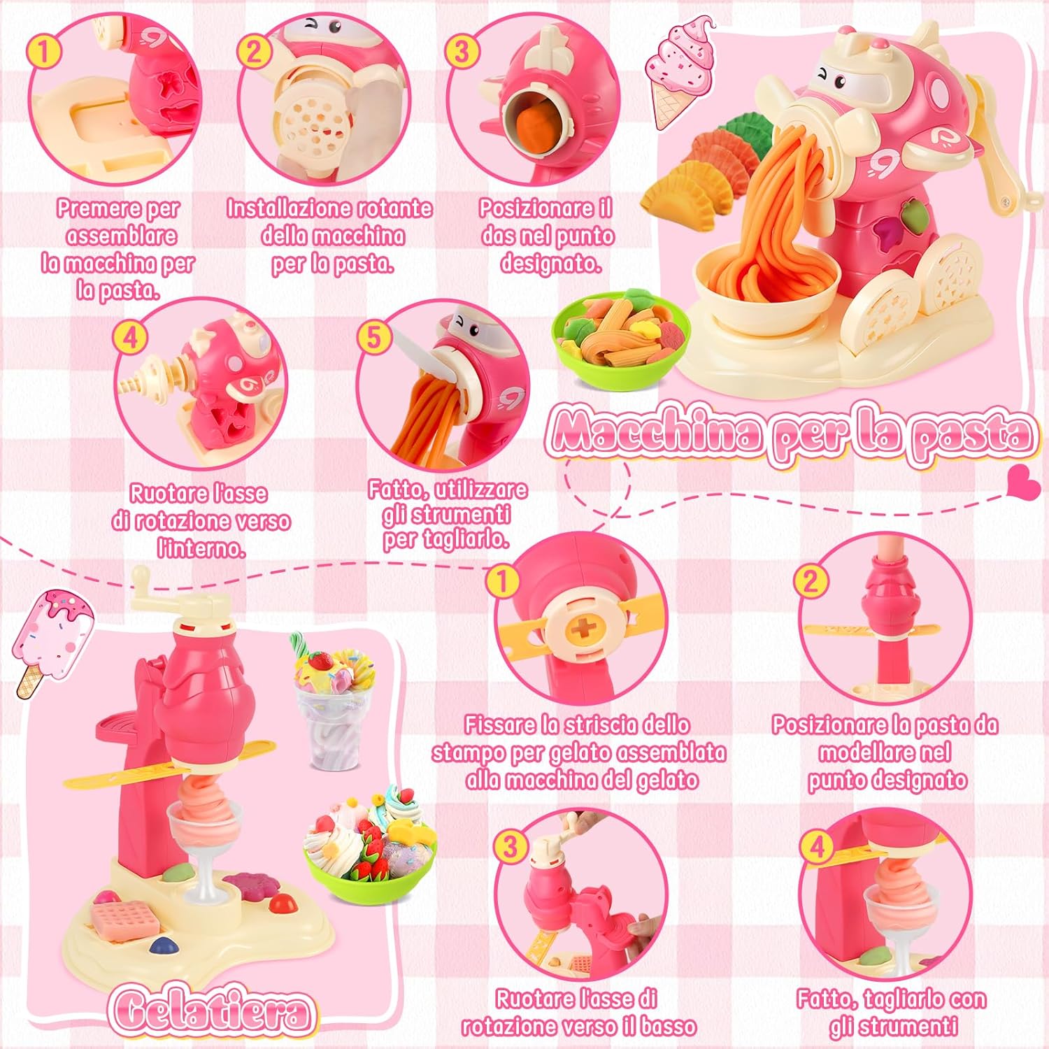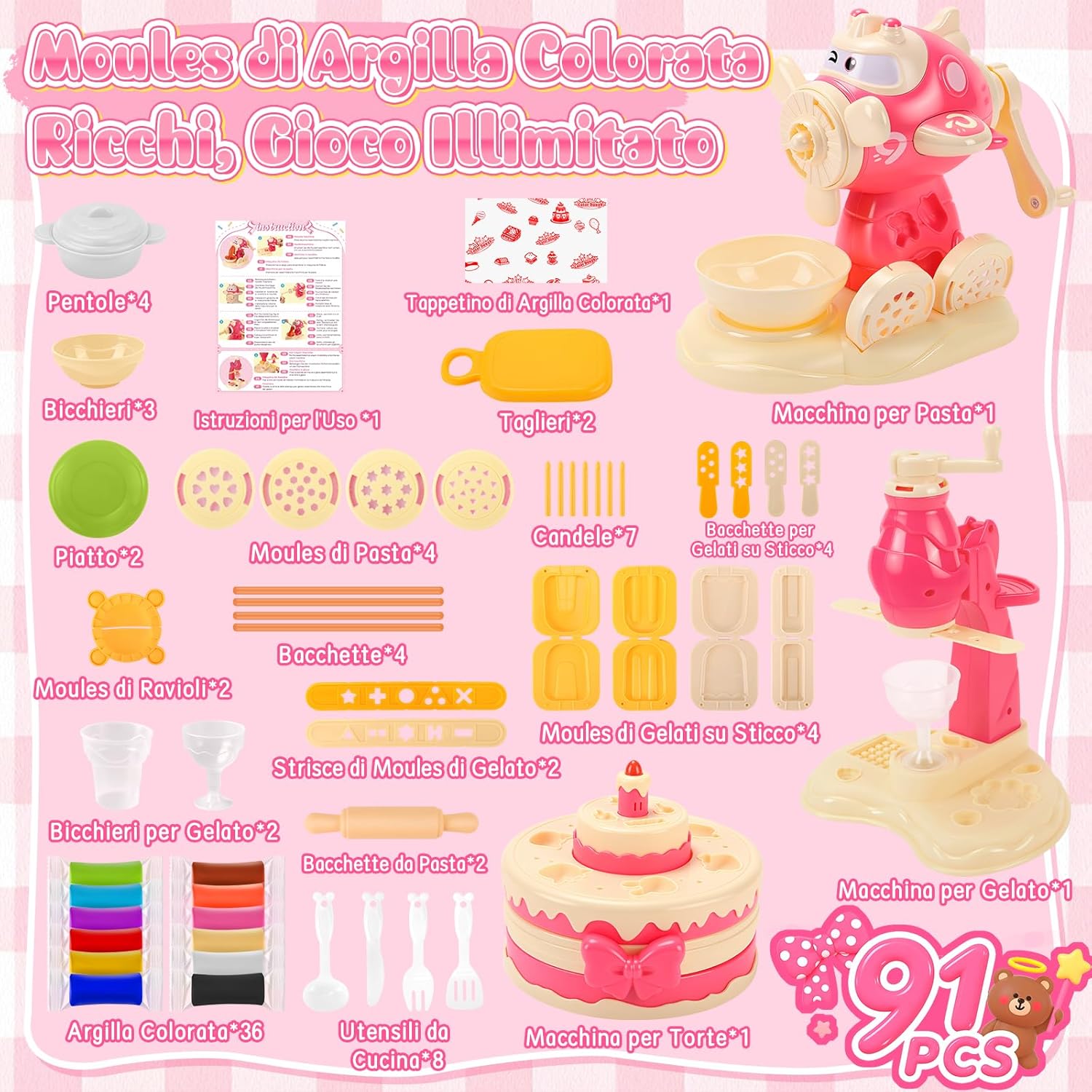 91 Pezzi Set di Pasta da Gioco : Il set di pasta da gioco fai-da-te comprende 36 pezzi di pasta da gioco colorata, 3 grandi macchine (macchina per torte, macchina per gelati, macchina per la pasta) e stampi coordinati, oltre a una vasta gamma di utensili da cucina, come pentole, padelle, mattarelli e piatti, ecc. Per garantire un processo di lavorazione pulito e ordinato, abbiamo preparato un tappetino. È incluso anche un manuale di istruzioni in 5 lingue per aiutarvi a capire lo scopo degli stampi, quindi iniziate il vostro viaggio nella creazione fai-da-te! Plastilina Gelatiera Pasticcera Macchina per la Pasta: 3 grandi macchine a stampo in plastilina colorata consentono di realizzare molti tipi di alimenti. La macchina per il gelato imita il vero processo di produzione, inserendo l'argilla colorata e facendo uscire il morbido gelato, si possono anche cambiare gli stampi; la macchina per le torte ha una varietà di stampi di cibo all'interno e viene fornita con le candele, vieni a fare un sontuoso pasto di compleanno per i tuoi amici! Set di Pasta per Bambini Sicuri: La nostra pasta da gioco è fatta di farina, sale e acqua, mentre i colori sono realizzati con coloranti commestibili per garantire la sicurezza. Tutti i tipi di stampi sono facili da usare, lisci e privi di spine, così i bambini possono usarli in tutta tranquillità e avere la loro cucina creativa. Utilizzando gli stampi per preparare il cibo, i bambini possono esercitare la capacità di afferrare, migliorare i movimenti fini della mano e l'immaginazione spaziale. Gioco di Ruolo Coinvolgente: con strumenti da cucina simulati, come pentole e padelle, i bambini possono simulare scenari di cucina reali: usare una macchina per dolci per fare una “torta di compleanno” e coppette da gelato per servire “coni”. Il set comprende istruzioni in cinque lingue, che guidano i bambini attraverso l'intero processo, dalla preparazione degli ingredienti alla presentazione del prodotto finito, riconoscendo l'uso degli strumenti da cucina e divertendosi, migliorando le loro abilità pratiche e la consapevolezza della vita. Collaborazione tra genitori e figli o giochi per le feste: il set supporta il funzionamento di più persone contemporaneamente, genitori e figli possono condividere il lavoro: una persona usa la macchina per la pasta per pressare le tagliatelle, una persona usa lo stampo per il gelato per modellare il gelato, e insieme possono completare il “pasto di famiglia”. Questa pasta da gioco colorata colorata può essere utilizzata più volte, genitori e figli possono creare insieme lavori a tema (come la torta delle vacanze, la festa di compleanno), lasciando ricordi preziosi.