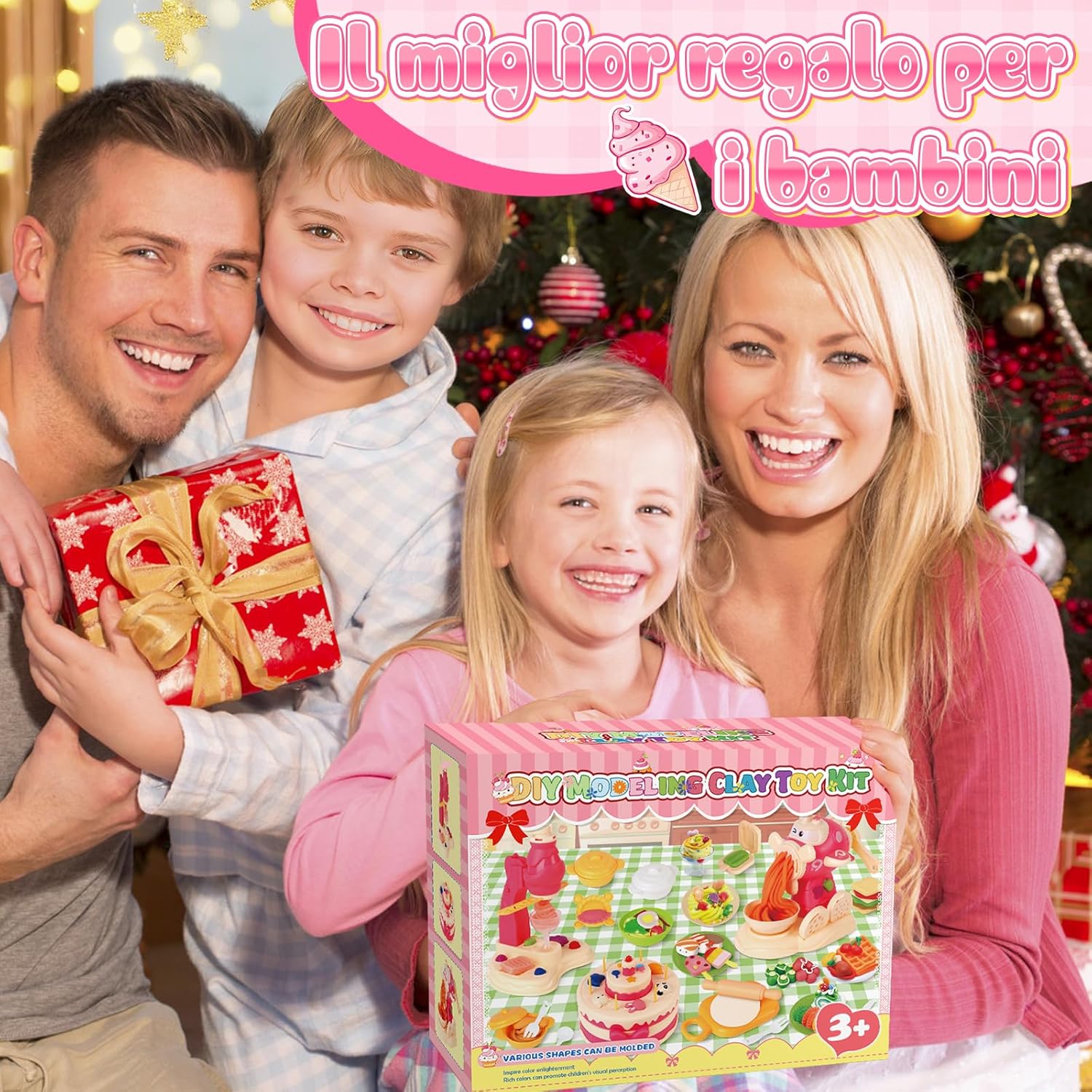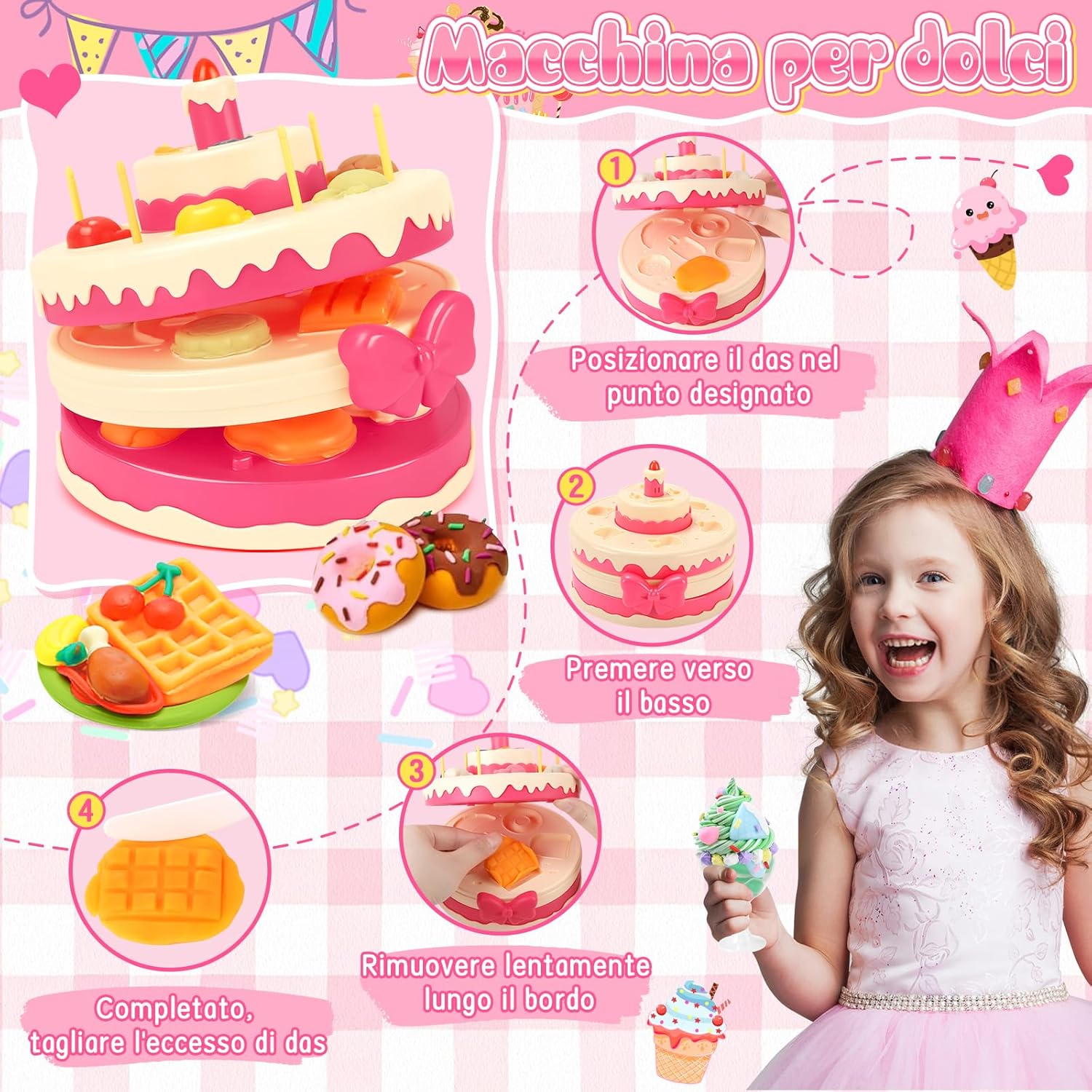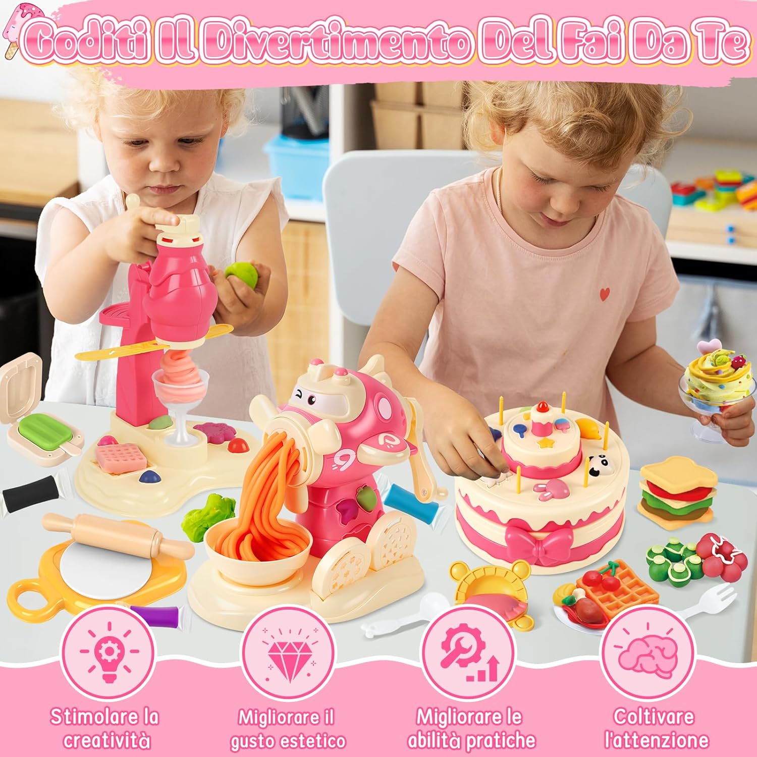 91 Pezzi Set di Pasta da Gioco : Il set di pasta da gioco fai-da-te comprende 36 pezzi di pasta da gioco colorata, 3 grandi macchine (macchina per torte, macchina per gelati, macchina per la pasta) e stampi coordinati, oltre a una vasta gamma di utensili da cucina, come pentole, padelle, mattarelli e piatti, ecc. Per garantire un processo di lavorazione pulito e ordinato, abbiamo preparato un tappetino. È incluso anche un manuale di istruzioni in 5 lingue per aiutarvi a capire lo scopo degli stampi, quindi iniziate il vostro viaggio nella creazione fai-da-te! Plastilina Gelatiera Pasticcera Macchina per la Pasta: 3 grandi macchine a stampo in plastilina colorata consentono di realizzare molti tipi di alimenti. La macchina per il gelato imita il vero processo di produzione, inserendo l'argilla colorata e facendo uscire il morbido gelato, si possono anche cambiare gli stampi; la macchina per le torte ha una varietà di stampi di cibo all'interno e viene fornita con le candele, vieni a fare un sontuoso pasto di compleanno per i tuoi amici! Set di Pasta per Bambini Sicuri: La nostra pasta da gioco è fatta di farina, sale e acqua, mentre i colori sono realizzati con coloranti commestibili per garantire la sicurezza. Tutti i tipi di stampi sono facili da usare, lisci e privi di spine, così i bambini possono usarli in tutta tranquillità e avere la loro cucina creativa. Utilizzando gli stampi per preparare il cibo, i bambini possono esercitare la capacità di afferrare, migliorare i movimenti fini della mano e l'immaginazione spaziale. Gioco di Ruolo Coinvolgente: con strumenti da cucina simulati, come pentole e padelle, i bambini possono simulare scenari di cucina reali: usare una macchina per dolci per fare una “torta di compleanno” e coppette da gelato per servire “coni”. Il set comprende istruzioni in cinque lingue, che guidano i bambini attraverso l'intero processo, dalla preparazione degli ingredienti alla presentazione del prodotto finito, riconoscendo l'uso degli strumenti da cucina e divertendosi, migliorando le loro abilità pratiche e la consapevolezza della vita. Collaborazione tra genitori e figli o giochi per le feste: il set supporta il funzionamento di più persone contemporaneamente, genitori e figli possono condividere il lavoro: una persona usa la macchina per la pasta per pressare le tagliatelle, una persona usa lo stampo per il gelato per modellare il gelato, e insieme possono completare il “pasto di famiglia”. Questa pasta da gioco colorata colorata può essere utilizzata più volte, genitori e figli possono creare insieme lavori a tema (come la torta delle vacanze, la festa di compleanno), lasciando ricordi preziosi.