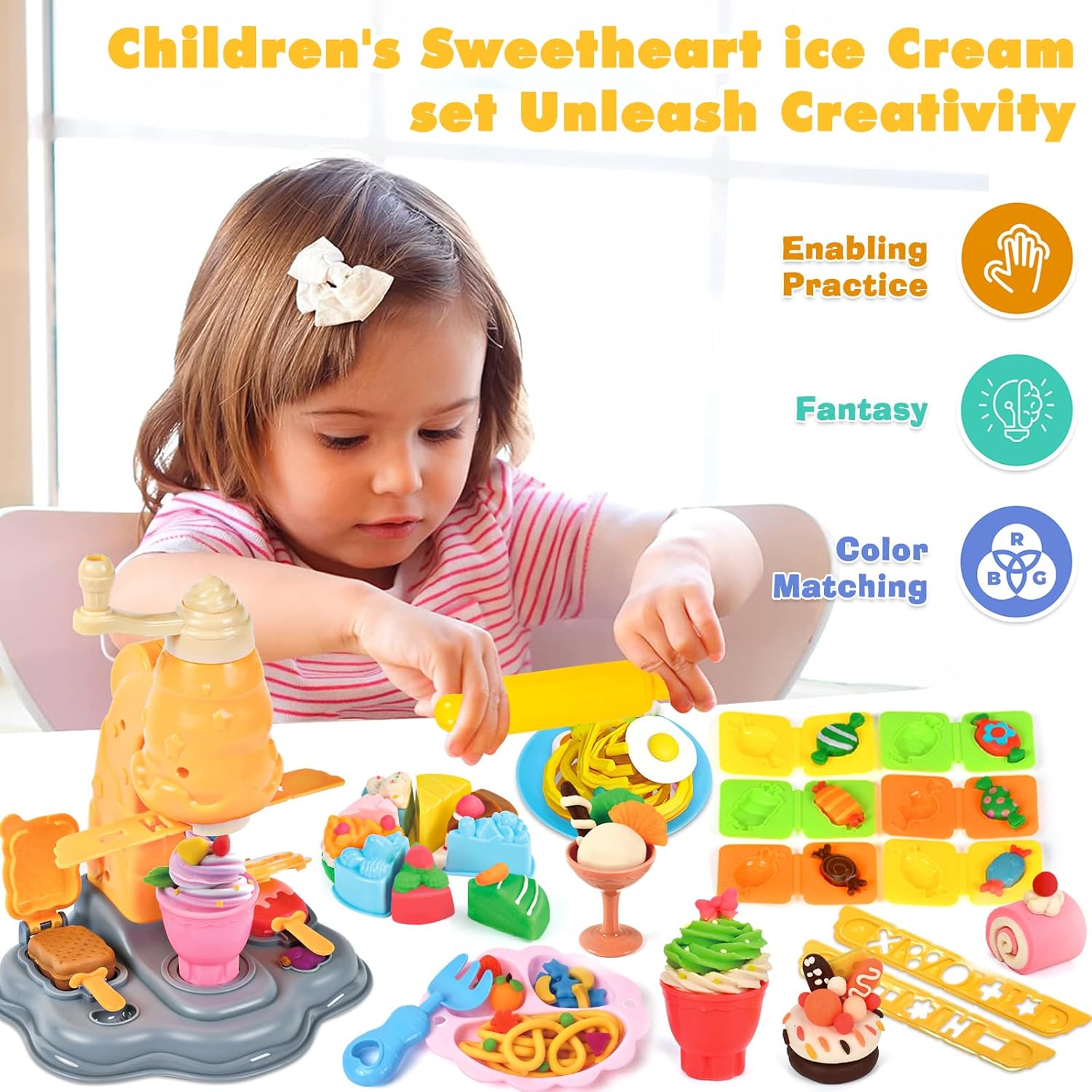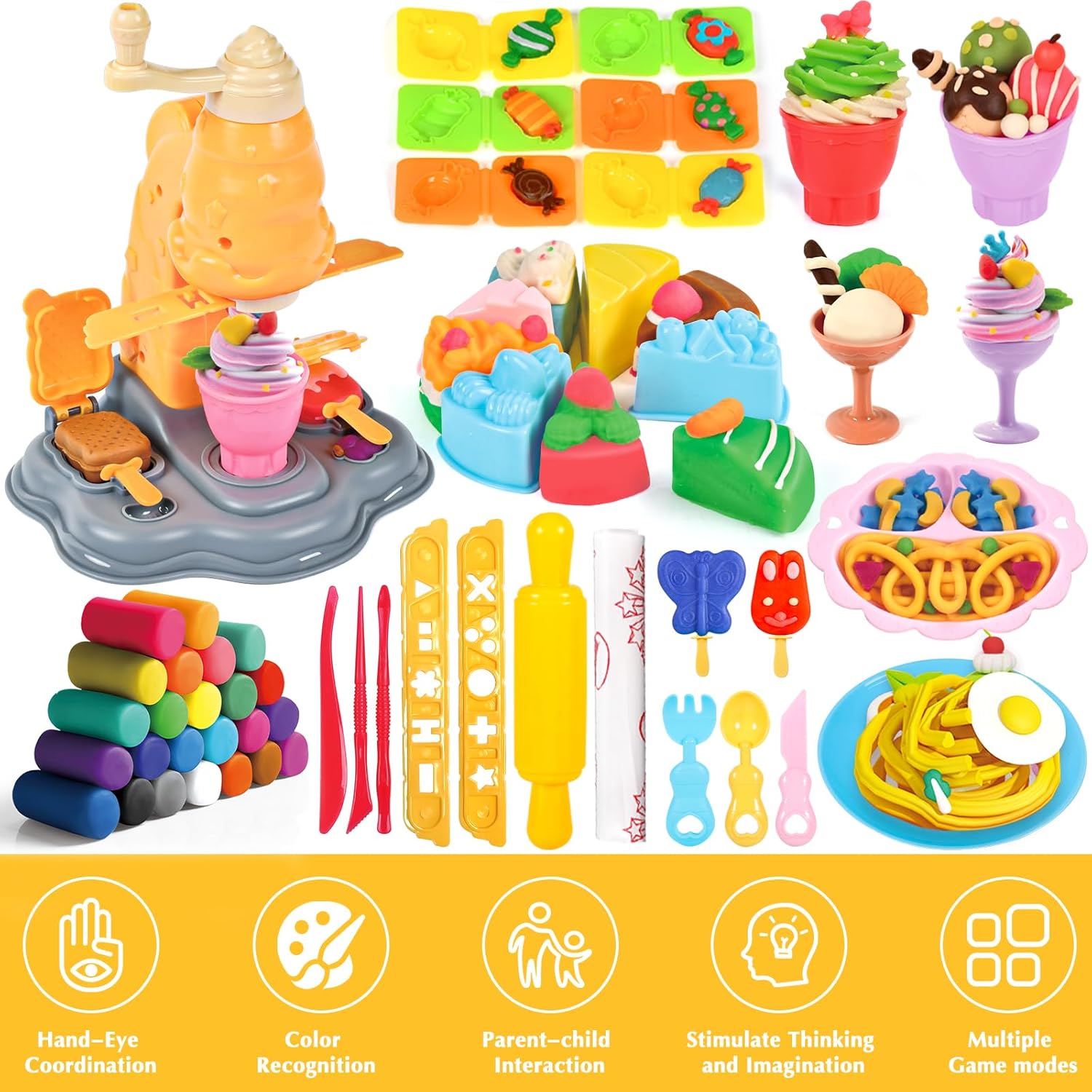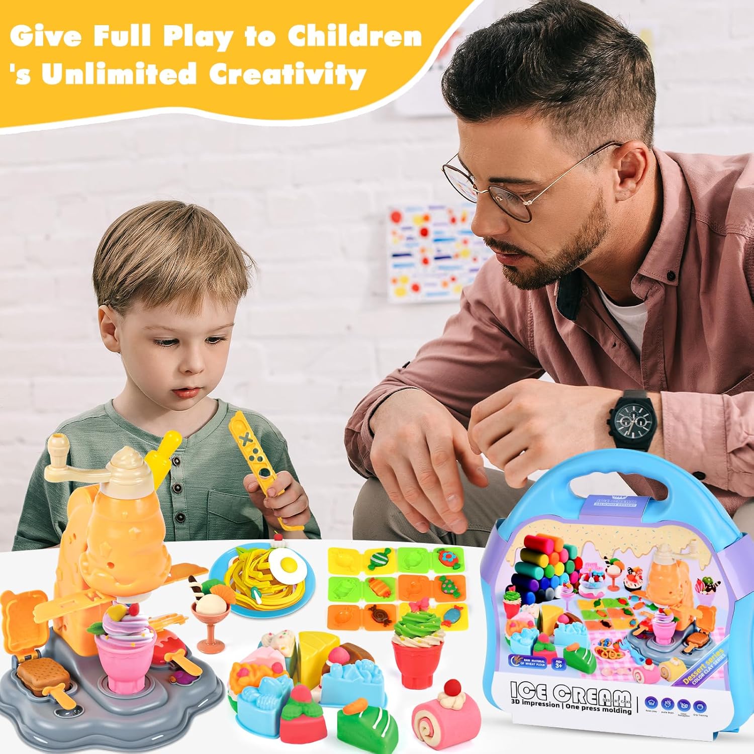 Set di pasta giocattolo: il set di accessori per impastare da 56 pezzi include: una macchina per gelato, 24 sacchetti di pasta colorata, nonché stampi per biscotti per bambini, mattarelli, estrusori, dessert, tazze alte, piatti, tagli per ghiaccio, coltelli e forchette, ecc. Accessori Strumenti. Questo è un set completo di plastilina per bambini, non è necessario acquistare accessori aggiuntivi. Alta qualità: ogni accessorio per plastilina è realizzato in plastica sicura e di alta qualità, molto resistente, colorato e non tossico. La plastilina è morbida e facile da impastare, il che la rende perfetta per i bambini. Dopo l'uso, conservare l'impasto nella scatola. Se sei preoccupato che la plastilina si asciughi, aggiungi acqua per ammorbidirla. FAI DA TE Pasta Modeler: gli accessori e i modelli di questo giocattolo possono stimolare l'immaginazione e la creatività dei bambini e promuovere le loro abilità pratiche. Modellando, premendo e scolpendo le loro creazioni, sviluppano la loro coordinazione occhio-mano, abilità sociali e imparano a preparare il cibo. Facile da usare: basta seguire i semplici passaggi, versare prima l'impasto, quindi attivare la leva per creare un ghiaccio morbido. I bambini si divertiranno di sicuro perché è come una vera gelatiera in plastilina! Ci sono anche diversi modelli di dolci e dolci, che consentono di realizzare "piccoli snack" colorati con una semplice pressione. Regalo perfetto: set di plastilina per bambini adatto per regali di compleanno, regali di Natale, feste, festival, scuole. Perfetto per i bambini che amano giocare allo chef e mostrare creatività con gli strumenti di plastilina. È il regalo perfetto per bambini di età compresa tra 2, 3, 4, 5 e 6 anni.