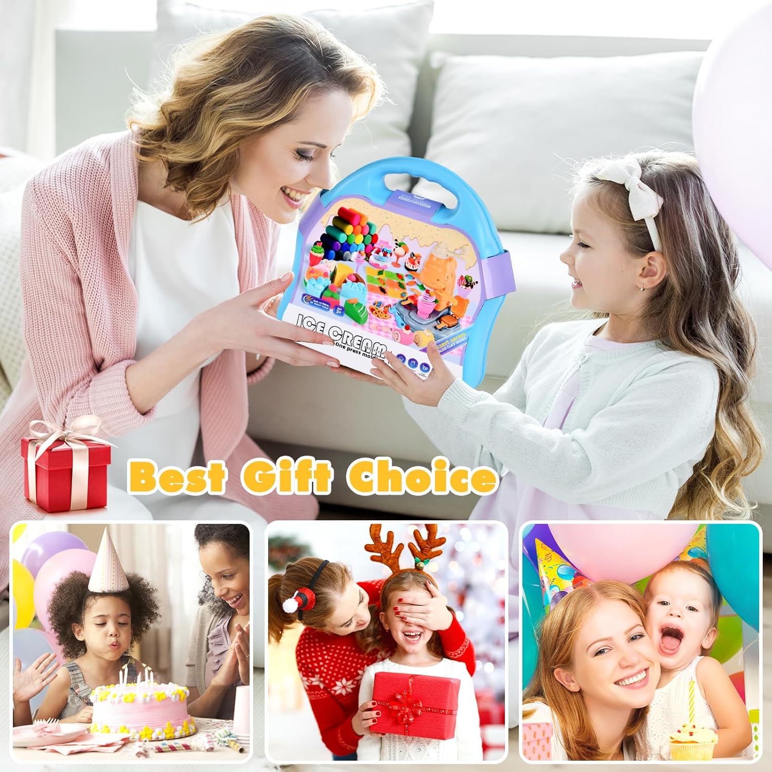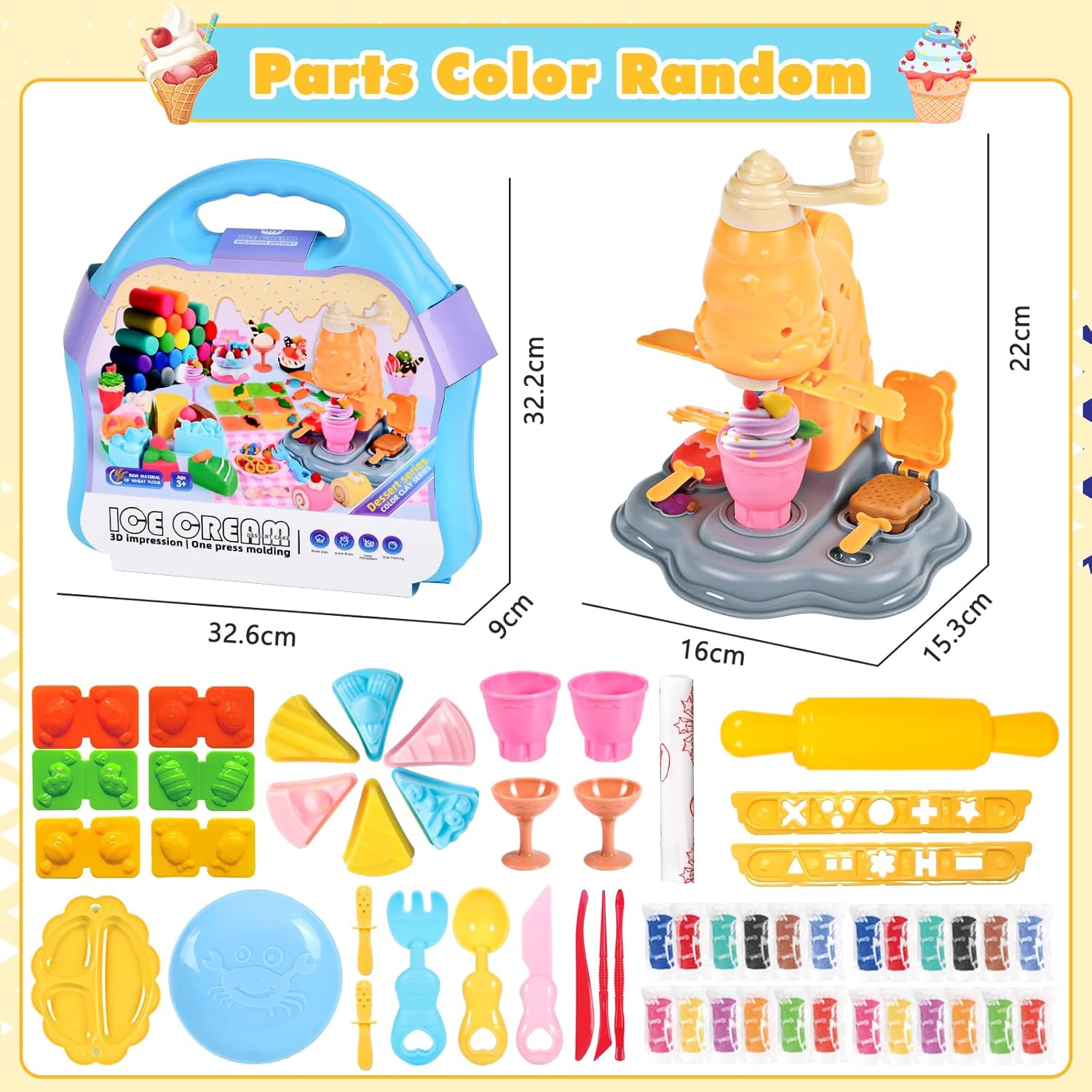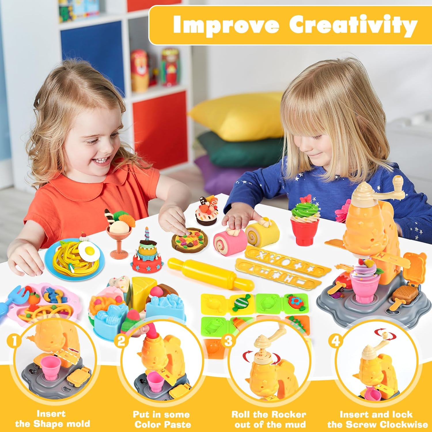 Set di pasta giocattolo: il set di accessori per impastare da 56 pezzi include: una macchina per gelato, 24 sacchetti di pasta colorata, nonché stampi per biscotti per bambini, mattarelli, estrusori, dessert, tazze alte, piatti, tagli per ghiaccio, coltelli e forchette, ecc. Accessori Strumenti. Questo è un set completo di plastilina per bambini, non è necessario acquistare accessori aggiuntivi. Alta qualità: ogni accessorio per plastilina è realizzato in plastica sicura e di alta qualità, molto resistente, colorato e non tossico. La plastilina è morbida e facile da impastare, il che la rende perfetta per i bambini. Dopo l'uso, conservare l'impasto nella scatola. Se sei preoccupato che la plastilina si asciughi, aggiungi acqua per ammorbidirla. FAI DA TE Pasta Modeler: gli accessori e i modelli di questo giocattolo possono stimolare l'immaginazione e la creatività dei bambini e promuovere le loro abilità pratiche. Modellando, premendo e scolpendo le loro creazioni, sviluppano la loro coordinazione occhio-mano, abilità sociali e imparano a preparare il cibo. Facile da usare: basta seguire i semplici passaggi, versare prima l'impasto, quindi attivare la leva per creare un ghiaccio morbido. I bambini si divertiranno di sicuro perché è come una vera gelatiera in plastilina! Ci sono anche diversi modelli di dolci e dolci, che consentono di realizzare "piccoli snack" colorati con una semplice pressione. Regalo perfetto: set di plastilina per bambini adatto per regali di compleanno, regali di Natale, feste, festival, scuole. Perfetto per i bambini che amano giocare allo chef e mostrare creatività con gli strumenti di plastilina. È il regalo perfetto per bambini di età compresa tra 2, 3, 4, 5 e 6 anni.