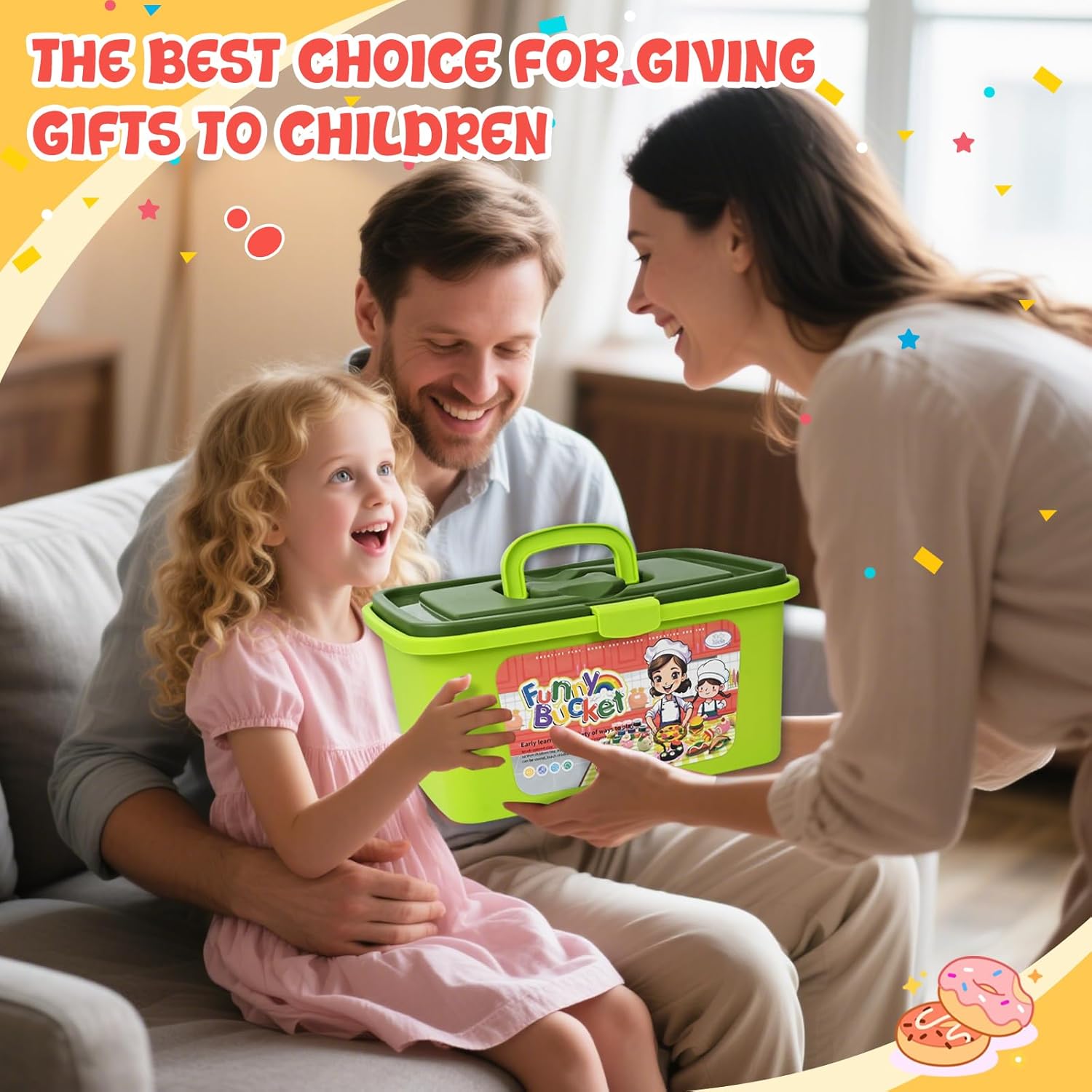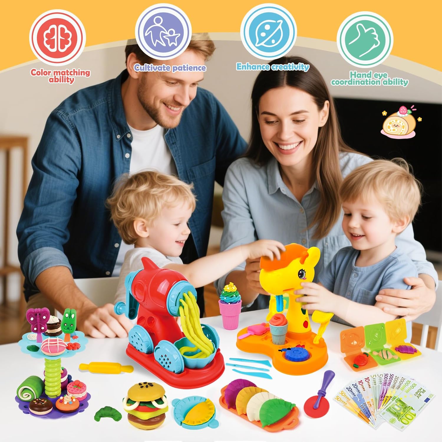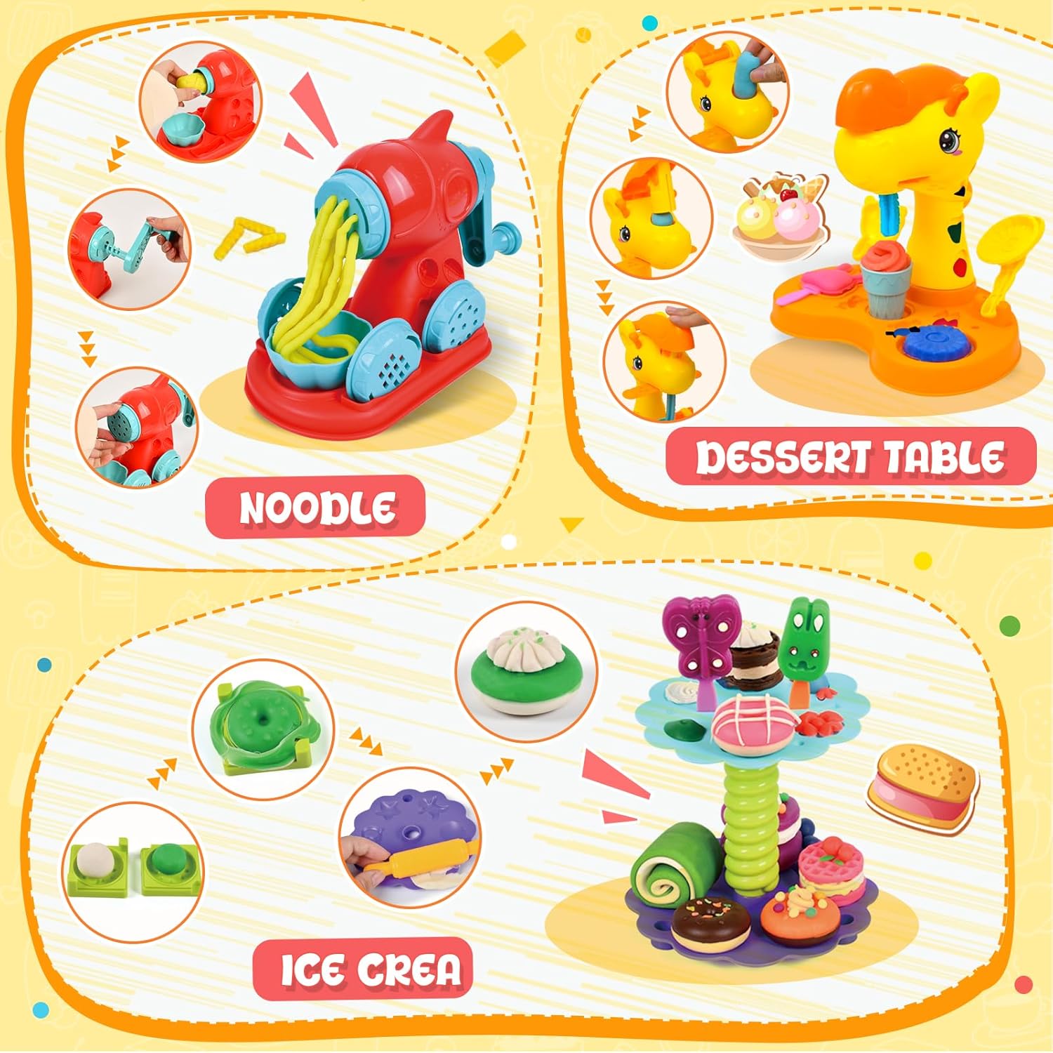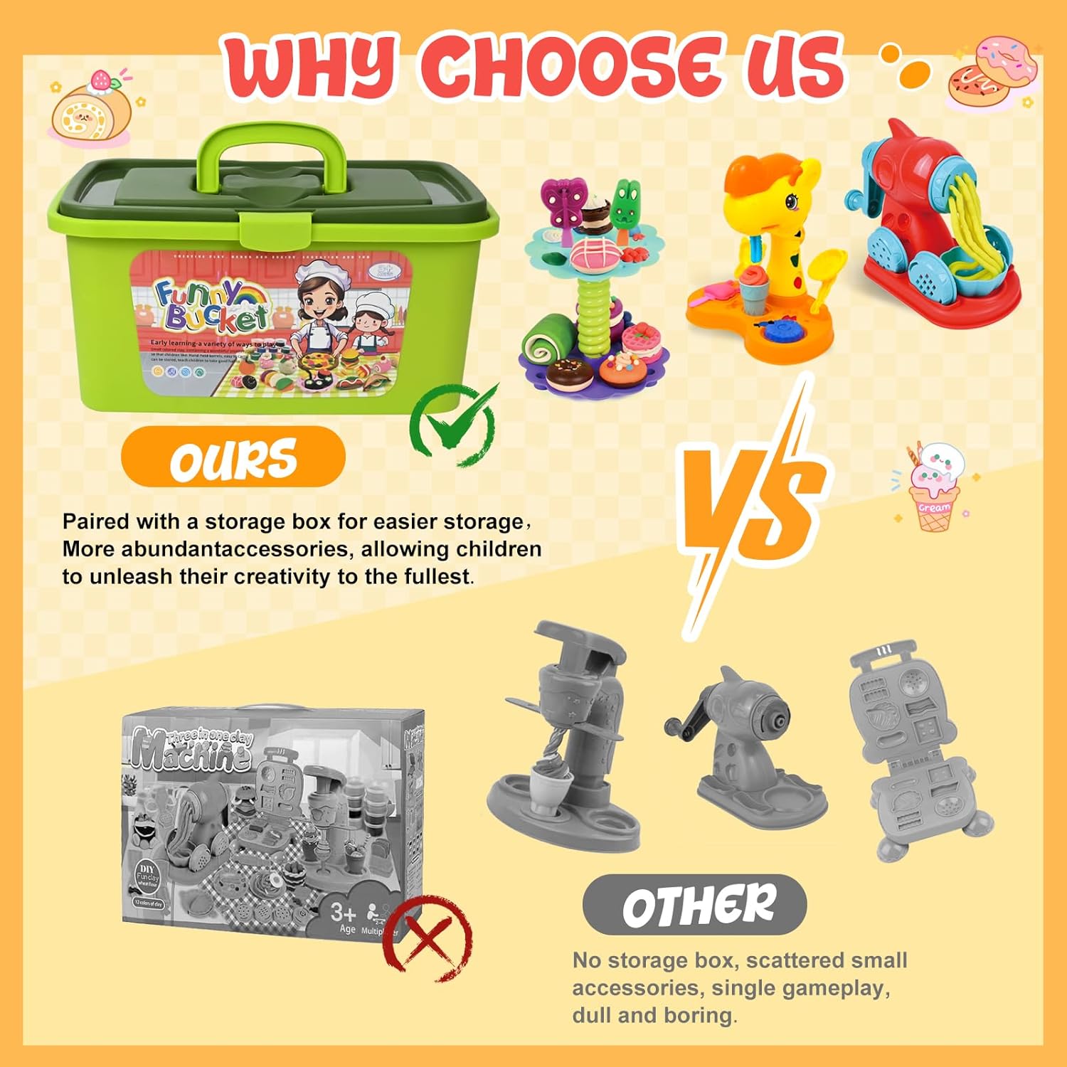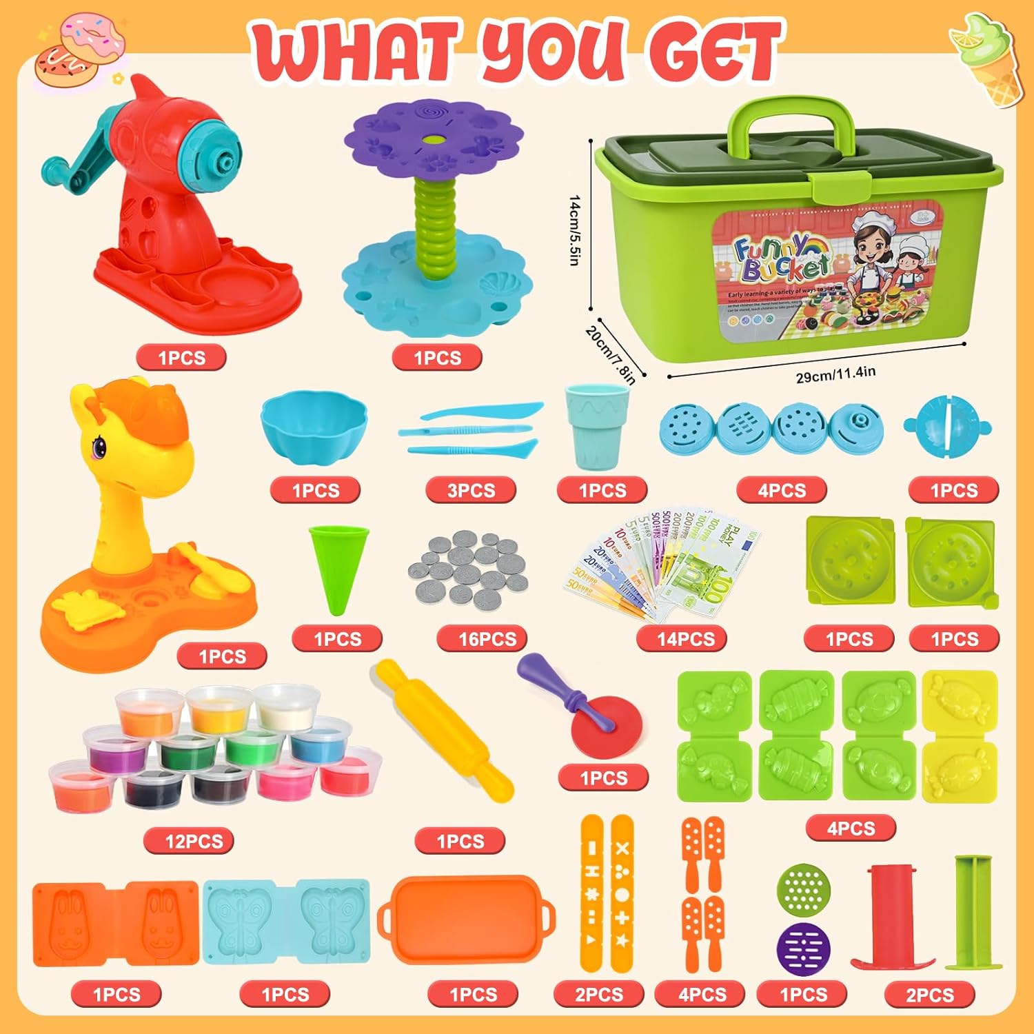 🧁🧁【Nuovo Set di Pasta da Gioco】Il set di accessori per la creta da modellare, composto da 57 pezzi, comprende una gelatiera, una macchina per la pasta, una scatola per riporre gli oggetti, 12 barattoli di pasta colorata e 41 accessori come tagliapasta, mattarello, estrusore, tagliapasta, impastatrice a rotella e una varietà di stampi. 🍧🍧【Gelatiera】La gelatiera ha un design a forma di cerbiatto con colori vivaci e molto carini. Riempite l'impasto, scegliete la forma di stampo che preferite da inserire nella macchina e azionate la leva per ottenere un morbido gelato! I bambini si divertiranno un mondo perché è proprio come un vero modellino di macchina per il gelato in argilla! 🍝🍝【Macchina per Tagliatelle】Basta versare l'impasto e ruotare la maniglia per ottenere i ramen! Naturalmente, è possibile cambiare la sezione della punta e scegliere la forma preferita! Il set è dotato di un vassoio per dolci a doppio strato che i bambini possono modellare facilmente in qualsiasi forma per un gioco di ruolo creativo. 🍪🍪【Materiale di Alta Qualità】Ogni parte è realizzata in materiale di alta qualità, sicuro e resistente. Viene fornito con una scatola per riporlo e trasportarlo facilmente. dopo l'uso, riporre l'argilla da modellare nella scatola in dotazione. Se si teme che l'argilla da modellare si secchi, è possibile aggiungere acqua per ammorbidirla. 🎊🎊【Regalo Perfetto】Il set di giocattoli per impastare è ben confezionato, facile da trasportare e in grado di sviluppare le abilità manuali dei bambini. Ideale regalo di compleanno, di natale e di capodanno per i bambini, ideale anche per feste, assemblee ed eventi scolastici!
