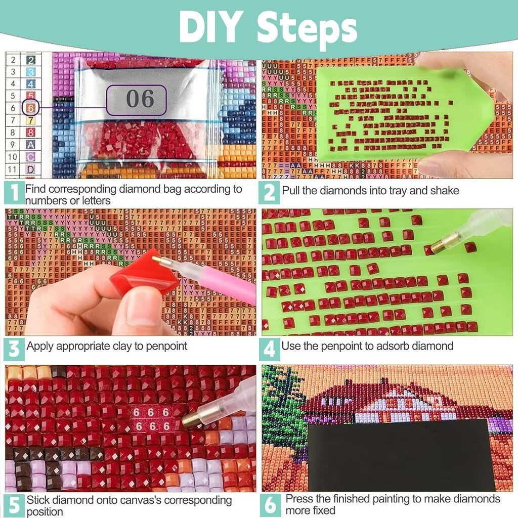 【Diamond Painting Kit Completo】 1 tela ad alta definizione; 1 penna a punta diamantata; 1 vassoio per lavori artigianali; 1 blocco di colla rosa; 2 punte di ricambio per trapano; 1 pinzetta; alcuni sacchetti autosigillanti; strass quadrato colorati. Nota: la cornice non è inclusa. Con il 30% di diamanti in più in ogni colore, non dovrai mai preoccuparti di rimanere senza o esaurire le scorte. 【Tela di Alta Qualità】I nostri kit per pittura diamante utilizzano tele di alta qualità, la tela è trasparente, impermeabile, senza pieghe, i simboli delle lettere sono chiari e facili da capire, il codice DMC sulla tela corrisponde al colore della punta del trapano e la tela utilizza colla a base d'acqua ecologica, che è forte. Assicurati che i diamanti non cadano. 【Diamanti Brillanti】I pittura diamante sono realizzati con perle rotonde completamente ricoperte, e le perle di diamante sono sfaccettate, il che rende le perle più brillanti e la brillantezza rende l'intero dipinto più tridimensionale, più vivido e più colorato. I dipinti a diamante sono più vividi e scintillanti sotto la luce. 【Regalo Ideale】I kit fai da te per il diamond painting possono arricchire il tuo tempo libero e aiutarti a ridurre lo stress. Riceverai un'opera d'arte al termine del lavoro e potrai semplicemente appenderla al muro, rendendo la tua stanza e il tuo mondo più belli. Il diamond painting è perfetto anche come regalo per bambini, familiari, amici e colleghi, come regalo di Capodanno, Natale, compleanno e altre festività. 【Servizio Clienti Eccellente】 Attribuiamo grande importanza alla qualità dei nostri prodotti e all'esperienza del cliente. In caso di problemi, come diamanti o utensili mancanti, non esitate a contattarci: risponderemo a qualsiasi domanda nel più breve tempo possibile.