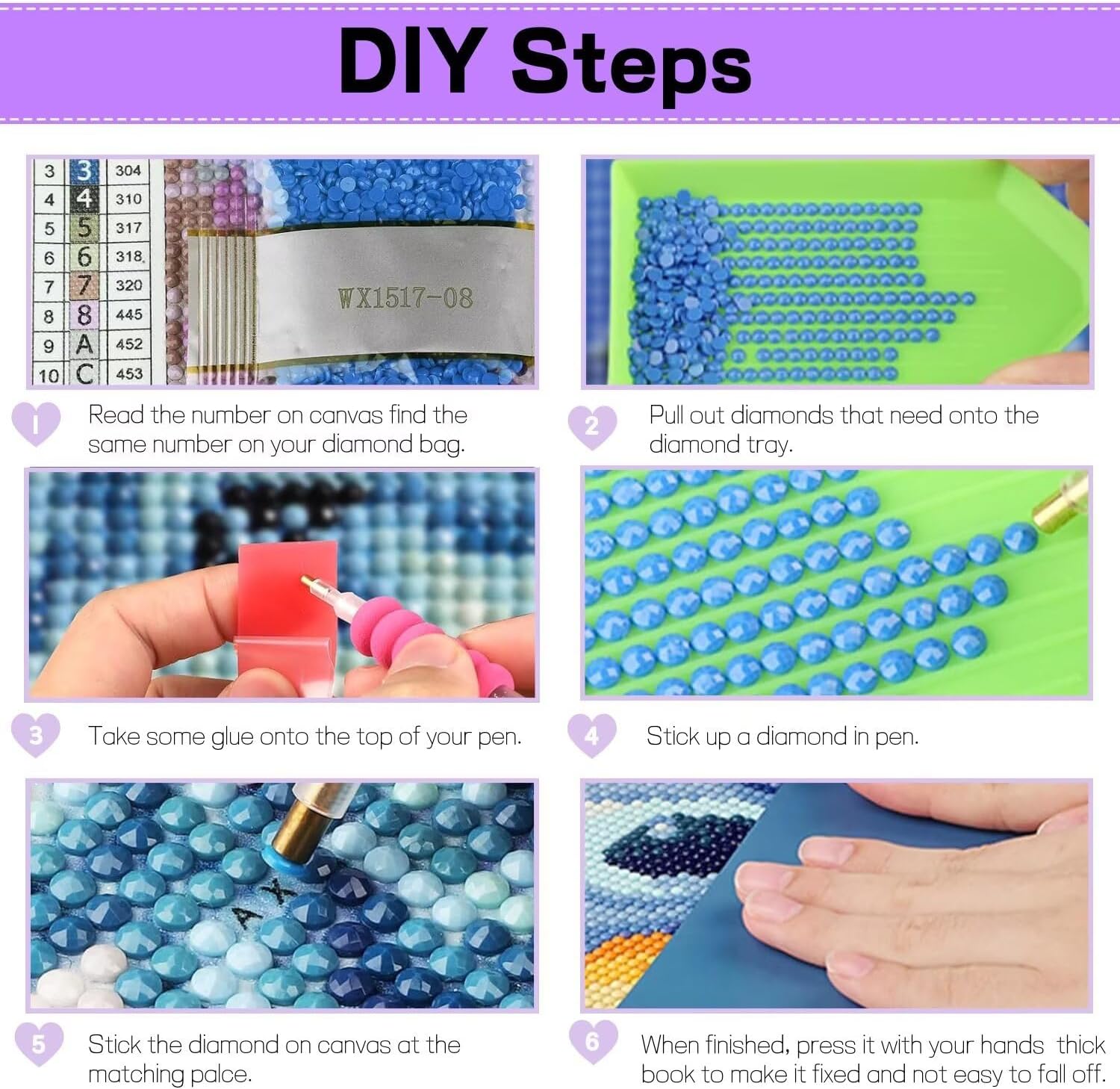 Il pacchetto Diamond Painting include 1 tela adesiva 1 penna per diamanti 1 vassoio per diamanti 2 punte da trapano di ricambio 1 colla Sacchetti con chiusura lampo Diamanti rotondi colorati Fasi di produzione del pittura diamante fai da te: 1. Leggi il numero sulla tela e trova lo stesso numero sul sacchetto per diamanti. 2. Estrai i diamanti che ti servono e posizionali sul vassoio per diamanti. 3. Metti un po' di colla sulla parte superiore della penna. 4. Incolla un diamante nella penna. 5. Incolla il diamante sulla tela all'altezza corrispondente Luogo. 6. Una volta terminato, premilo con le mani per fissarlo e impedirne la caduta. Precauzioni per il Diamond Painting fai da te: 1. Il prodotto non include una cornice. 2. Non strappare subito la pellicola protettiva dalla tela, altrimenti l'aderenza ne risentirà. 3. Per qualsiasi domanda post-vendita, non esitate a contattarci via e-mail il prima possibile.