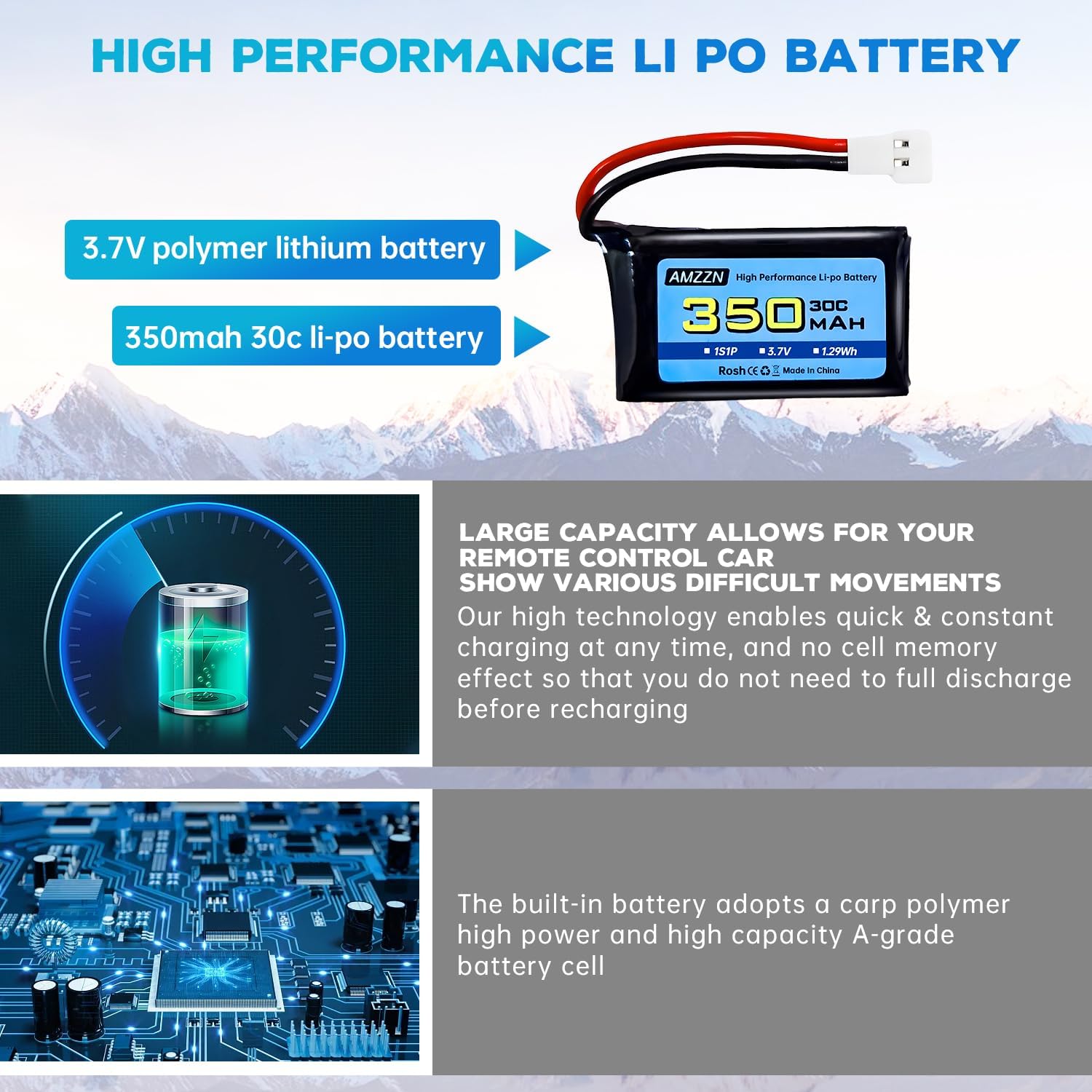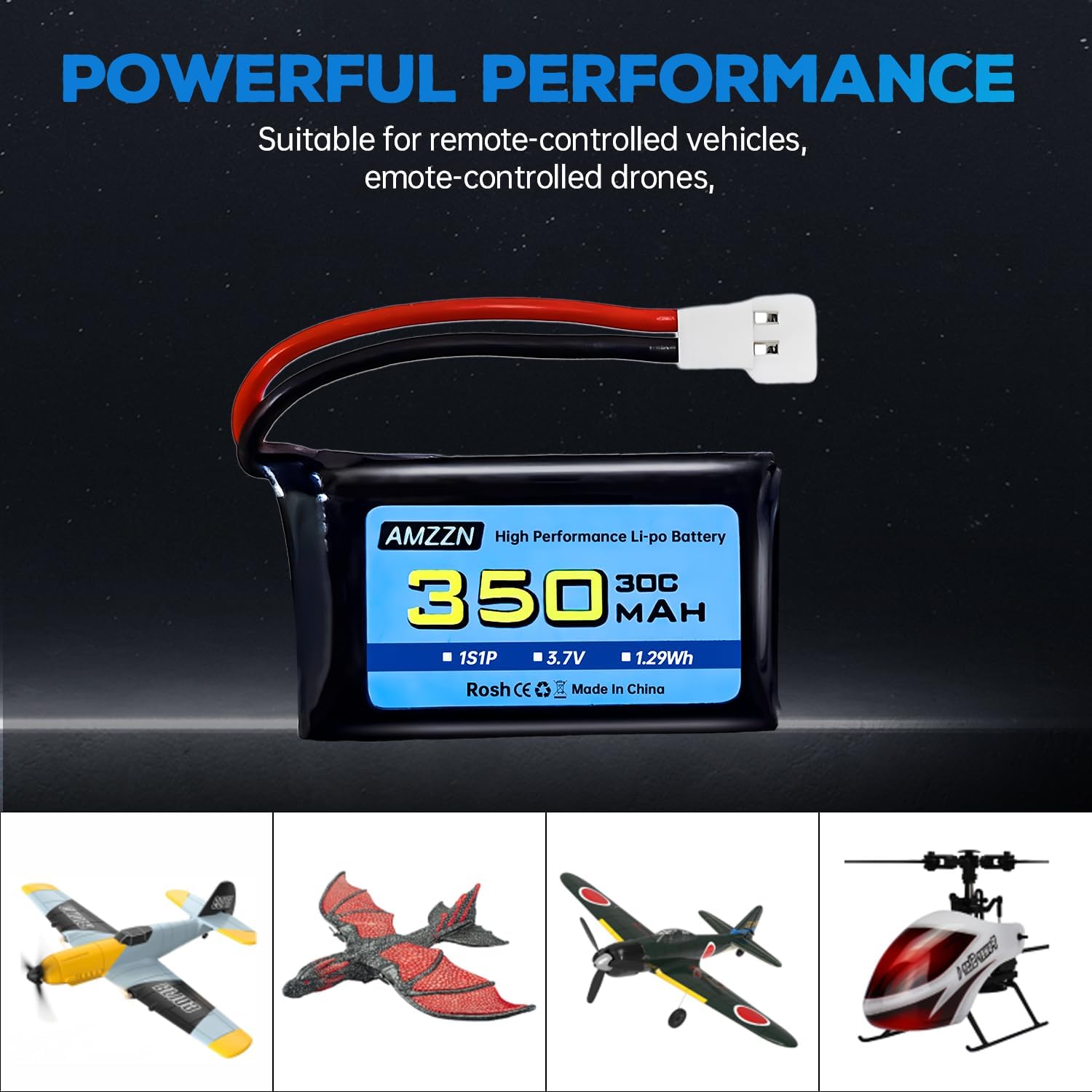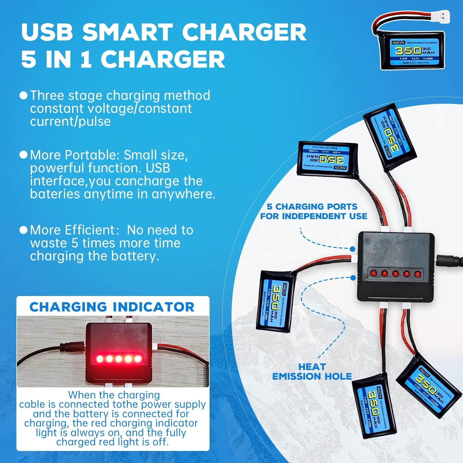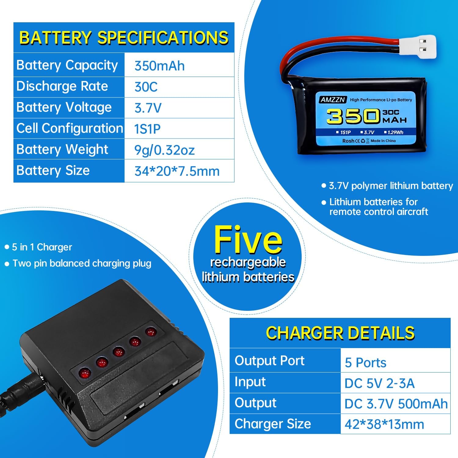 ☆Applicazione: Questa batteria è adatta per Syma X11 X11C MJX X100 T53 T54 WLToys V911S A120 XK A150 V966 FX801 UDI U830 U816A Hubsan X4 H107L DFD F180W F180C HS170 HS170C HS177 BF-109 FX651 FX621 Z60 Jet F-16 F-22 F-35 RC drone. Compatibile con la maggior parte dei veicoli telecomandati, droni FPV, quadcopter, modelli RC da competizione di canottaggio, veicoli di ingegneria telecomandati e auto giocattolo elettriche. ☆Parametro: Tensione della batteria: 3.7V; Capacità della batteria: 350mah; Configurazione della batteria: 1S; Tasso di scarico: 30C; Peso: 9g/pcs; Dimensioni: 34 * 20 * 7.5mm / 1.34 * 0.79 * 0.31 pollici; Connettore di scarico: spina Molex 51005; Interfaccia di ricarica: spina Molex 51005; Chimica delle batterie: polimero di litio. ☆Indicatore di carica del caricabatterie 5-in-1: Quando il cavo di ricarica è collegato all'alimentazione e collegato alla batteria per la ricarica, la spia rossa dell'indicatore di carica rimane accesa; Dopo essere stato completamente caricato, la luce rossa si spegne. ☆Attenzione: Prima dell'acquisto, si prega di prestare attenzione alle dimensioni della batteria e se la spina è adatta per il dispositivo RC. Il connettore di scarica di questa batteria è la spina Molex 51005; L'installazione può essere effettuata solo quando la tensione, le dimensioni e la spina della batteria corrispondono. ☆L'imballaggio include: batteria al litio 5X3.7V 350mAh; Caricatore 1X5 in 1; Manuale d'uso 1X; 1X scatola di imballaggio. Aderiamo al principio del cliente in primo luogo. Se si incontrano problemi, è possibile contattare il servizio clienti il prima possibile, e vi risponderemo entro 24 ore.