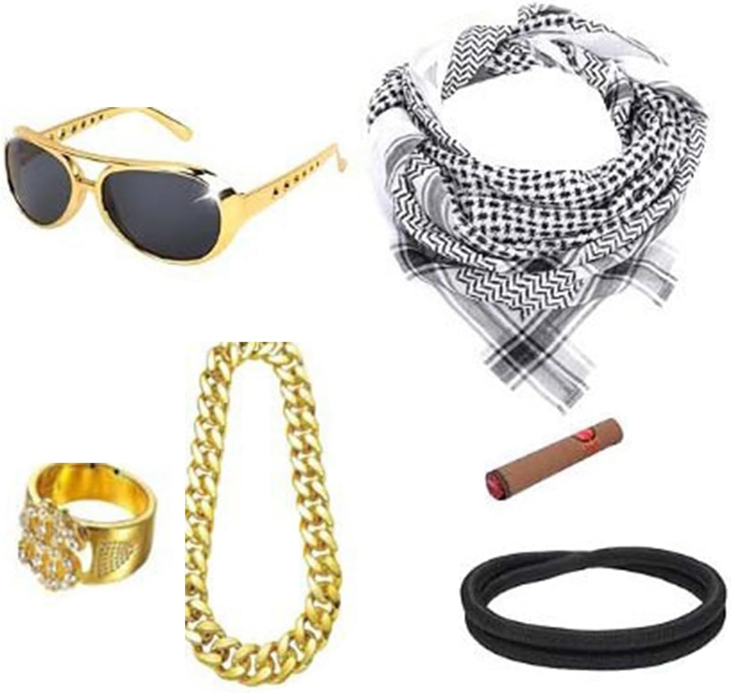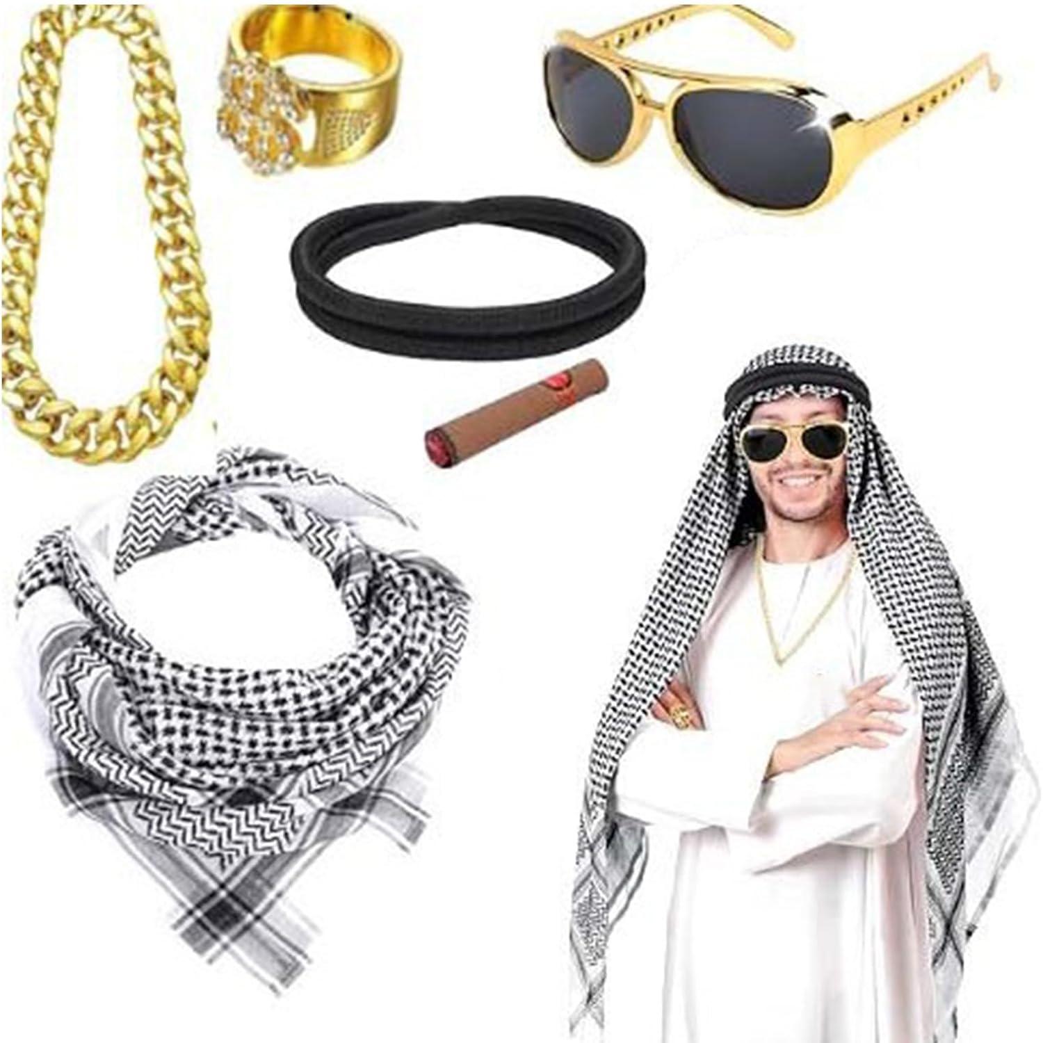 5Pcs Arabian Costume Arabo Testa Sciarpa Aqel Corda Occhiali Da Sole Neckalce Dollaro Anelli di Halloween Accessori Costume Adulto Uomini Caratteristiche: Occasione: costumi arabi unici per martedì grasso, Halloween, feste in maschera e compleanni. Tessuto shemagh del deserto del Medio Oriente realizzato in tessuto, morbido, traspirante, comodo da indossare. Meraviglioso dolce caldo amico famiglia e te stesso. La confezione include: involucro shemagh del deserto del Medio Oriente, occhiali da sole, anelli dollari, corda Aqel, collana Dimensioni: adatto per la maggior parte degli uomini adulti. Specifiche tecniche: Tessuto: tessuto. Dimensioni: circonferenza della testa: 55-60 cm. La confezione include: 5 accessori per costume arabo. Nota: Considerare un margine di errore di 1-2 cm dovuto alla misurazione manuale. A causa delle differenze tra i diversi monitor, l'immagine potrebbe non rispecchiare il colore reale dell'articolo.
