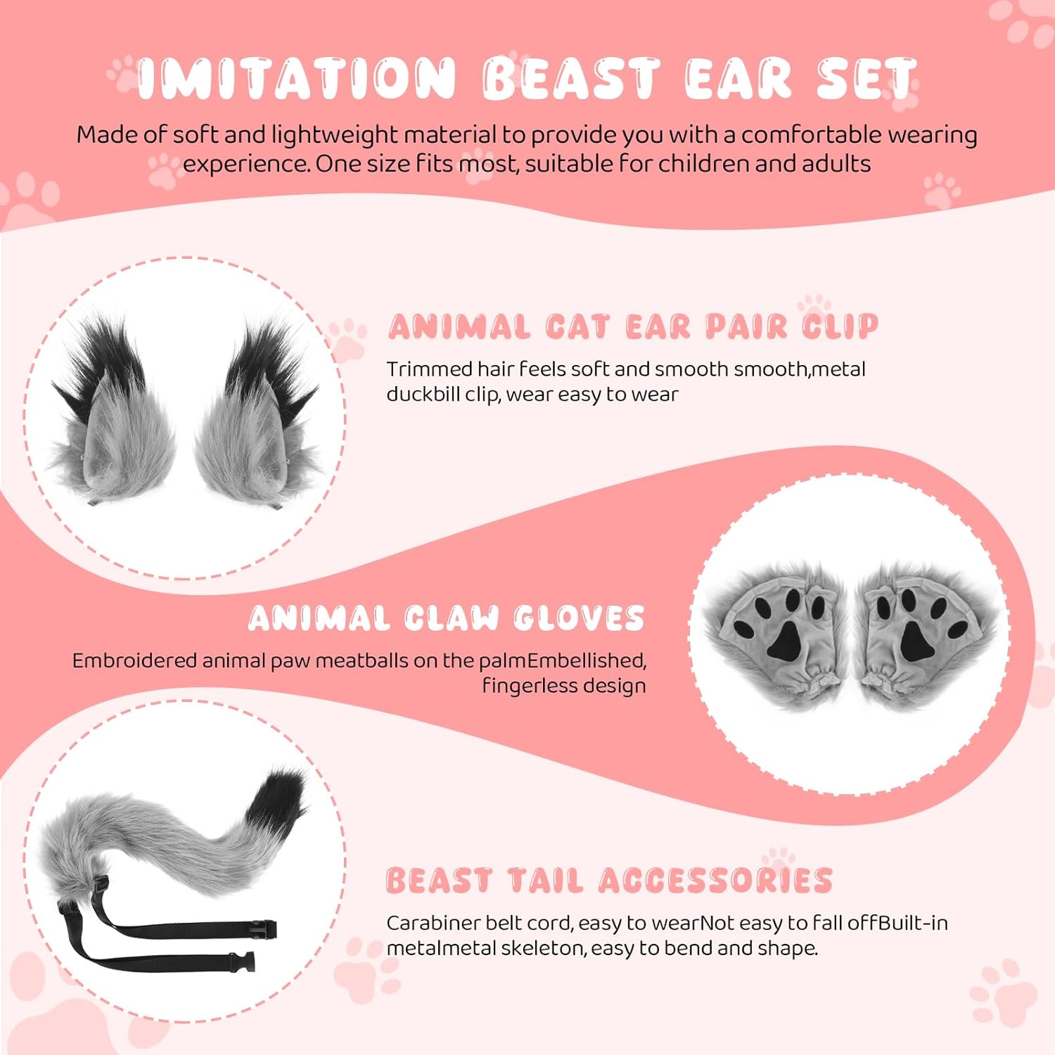 ✅ Coda di volpe: i peli della coda di volpe sono fini e lisci, il filo metallico regolabile incorporato può essere piegato in qualsiasi forma, è realistico come se si avesse davvero una coda. ✅ Cintura in vita regolabile: con una cintura in vita regolabile ed estensibile, facile da indossare e da togliere, si può stringere o allentare a seconda delle esigenze. ✅ Facile da indossare: realizzato in materiale morbido e leggero, offre un'esperienza confortevole. Taglia unica per la maggior parte delle persone, adatta a bambini e adulti. Si prega di controllare le misure dettagliate nell'immagine. ✅ La confezione include: 1 paio di guanti a zampa di gatto, 2 fermagli per orecchie e 1 coda. ✅ Ideale per Halloween, oggetti di scena, performance sul palco, festa di carnevale, costume cosplay, festa in costume, oggetti di scena per giochi di ruolo, festa notturna, night club, sfilate di moda, ecc.