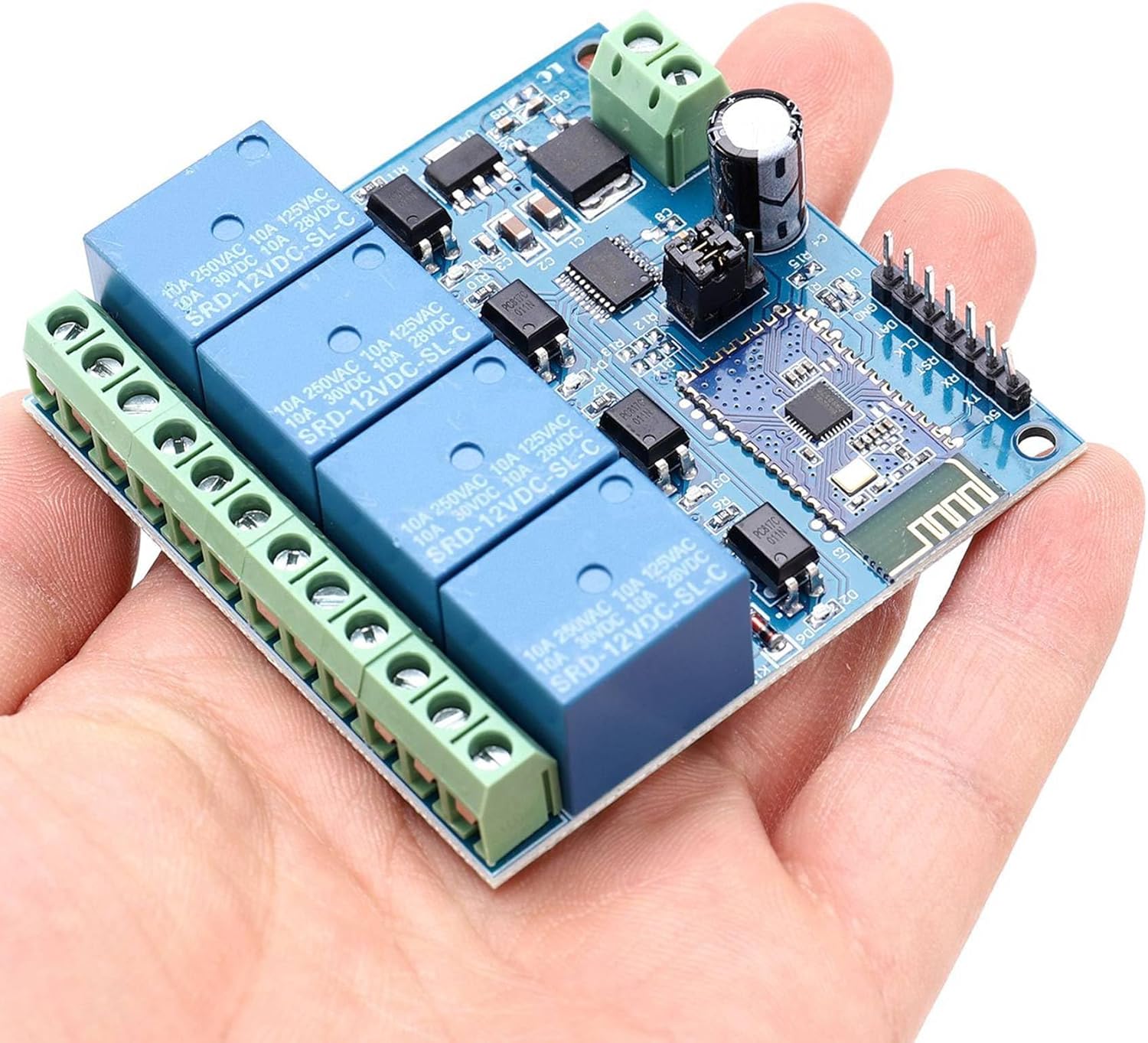Fonte di alimentazione: DC Teoria: relè bluetooth Voltaggio: 5 V. Utilizzo: telecomunicazione Il modulo relè Bluetooth a 4 canali LC 12V è dotato di modulo slave Bluetooth 2.1 SPP-C e MCU ad alte prestazioni a 8 bit, è possibile controllare direttamente il relè con l'APP cellulare.