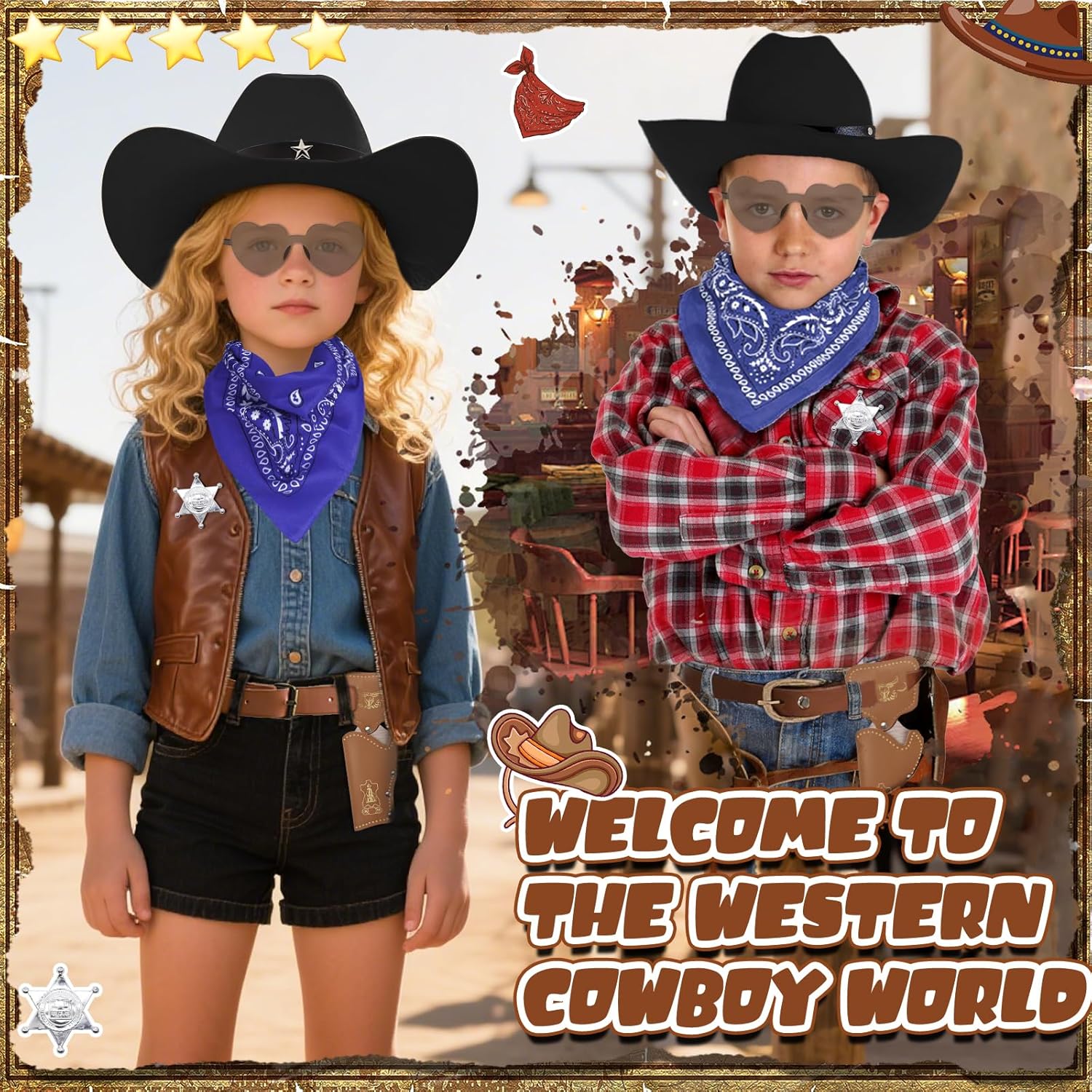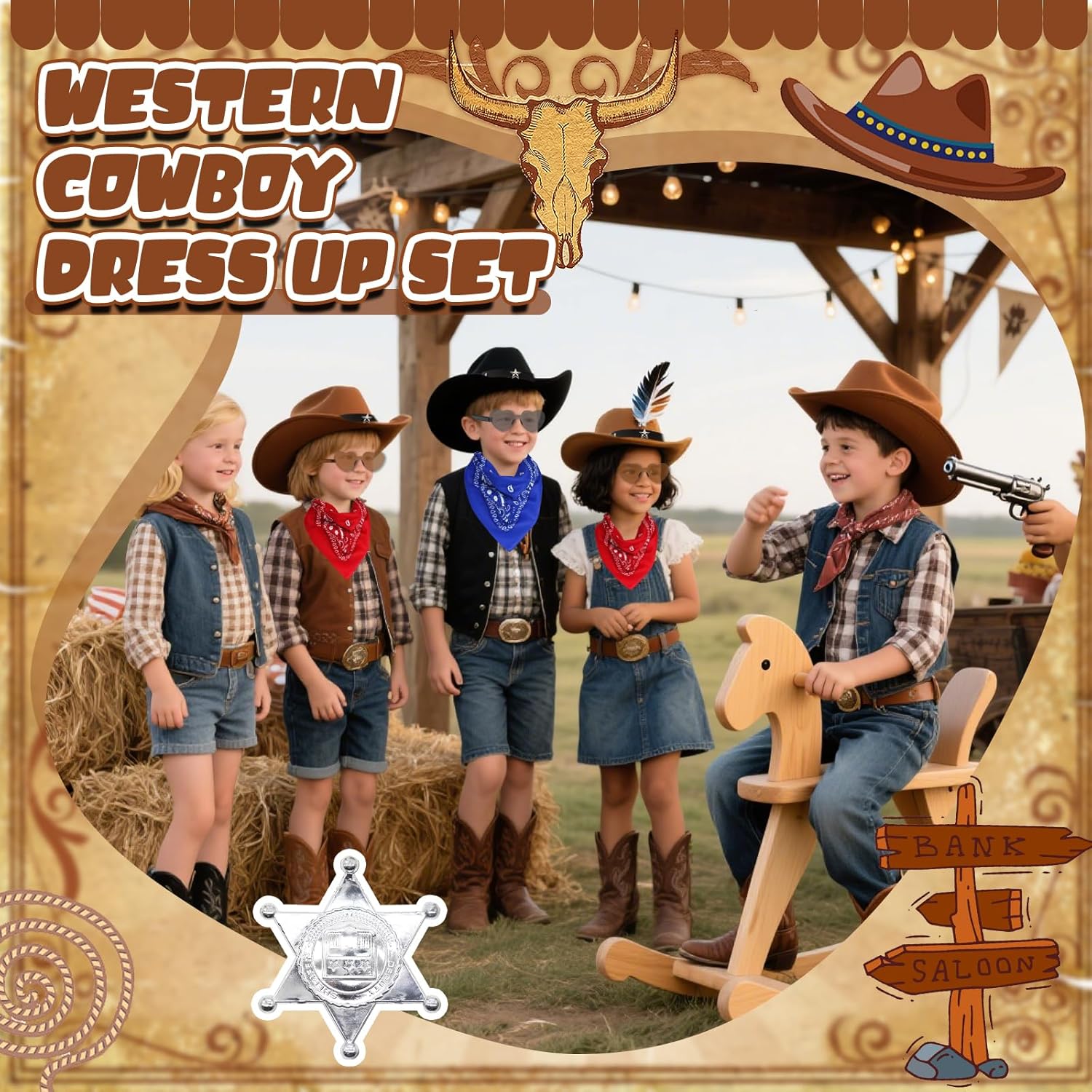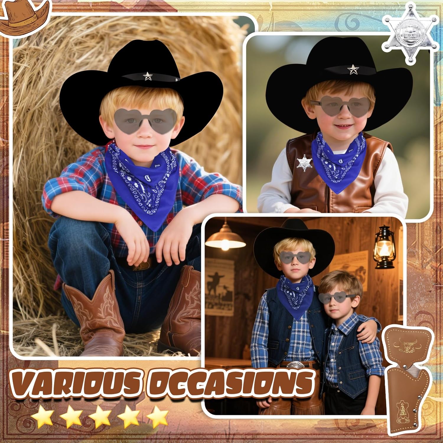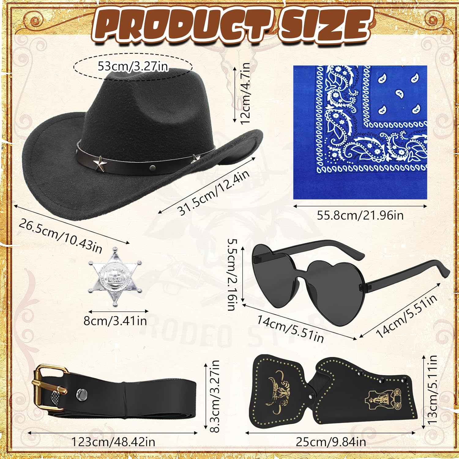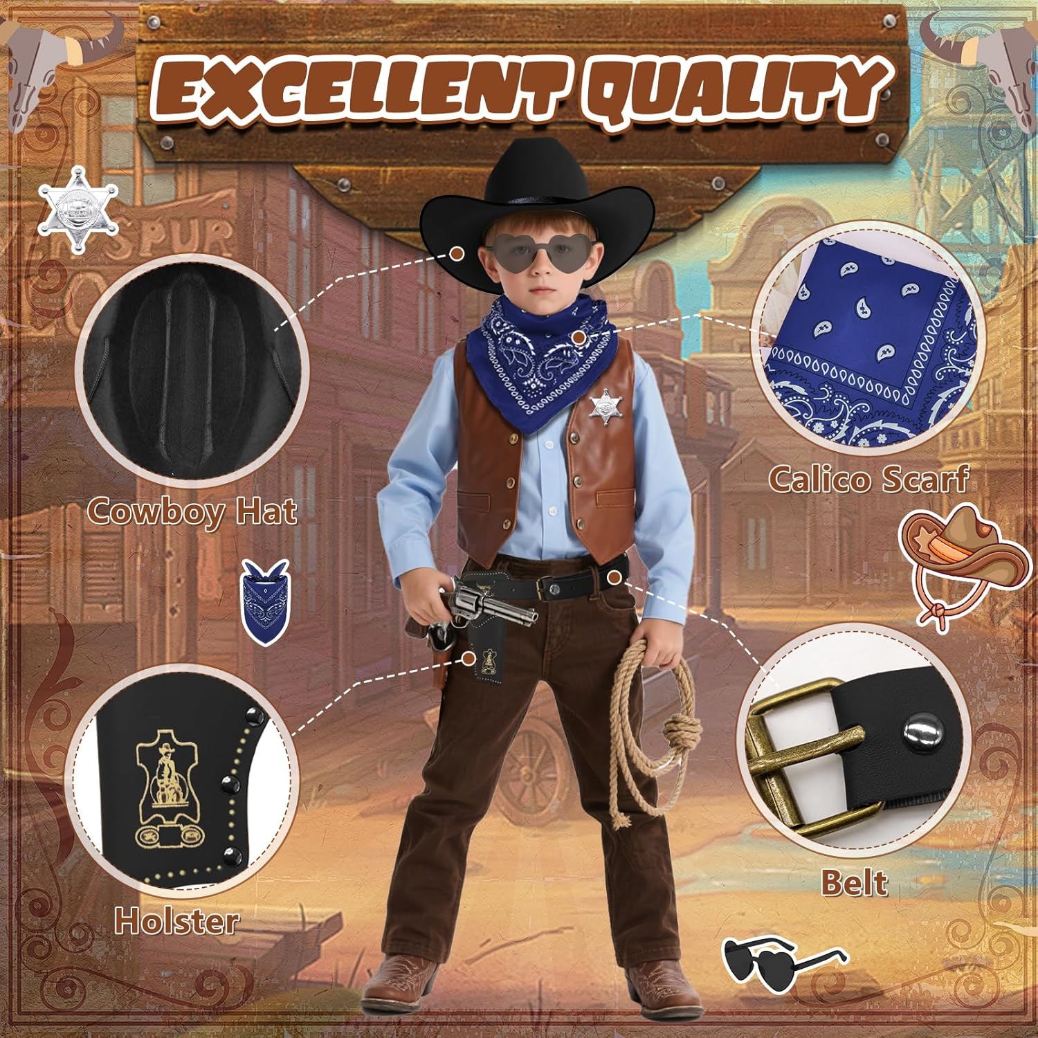 1. Sorprendi il piccolo cowboy della tua vita con questo emozionante set di travestimenti da cowboy. È il regalo perfetto per compleanni, vacanze o come ricompensa per un buon comportamento. Guarda i loro occhi brillare mentre intraprendono avventure nel selvaggio West! 2. Se il tuo bambino sogna di diventare sceriffo, allevatore o rodeo, questo set di accessori da cowboy occidentale offre il punto di partenza perfetto per innumerevoli avventure. Contenuto della 1 cappello classico da cowboy. 1 bandana. 1 distintivo lucido per sceriffo. 1 custodia in pelle realistica. 1 paio di occhiali da sole. 1 cintura regolabile. Note importanti: 1. Si prega di consentire una leggera deviazione nelle dimensioni e nel peso a causa della misurazione manuale. 2. A causa delle diverse impostazioni dei monitor, il colore può variare legger