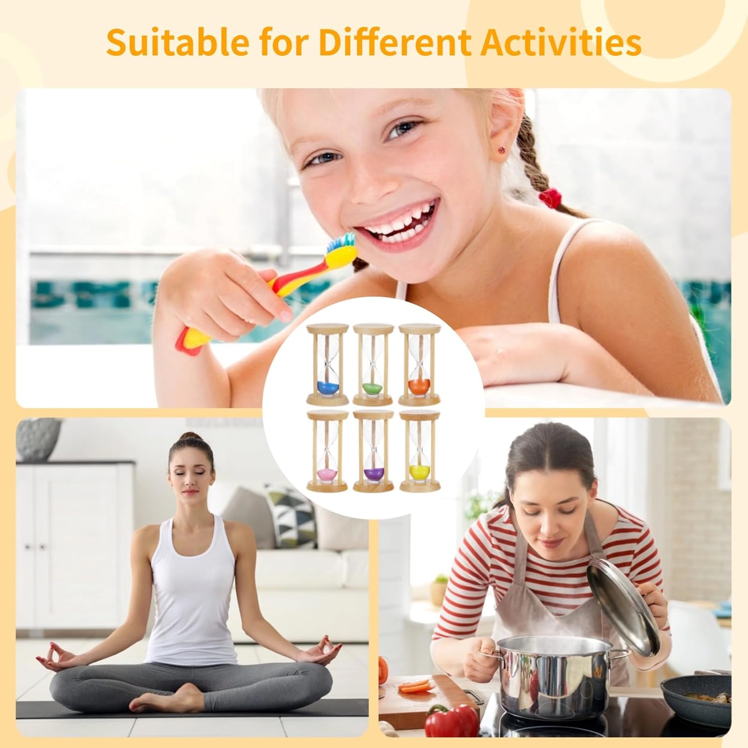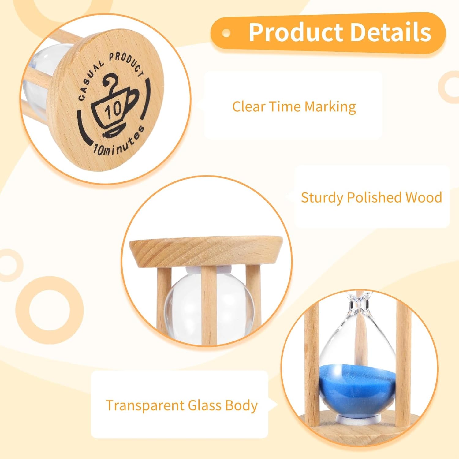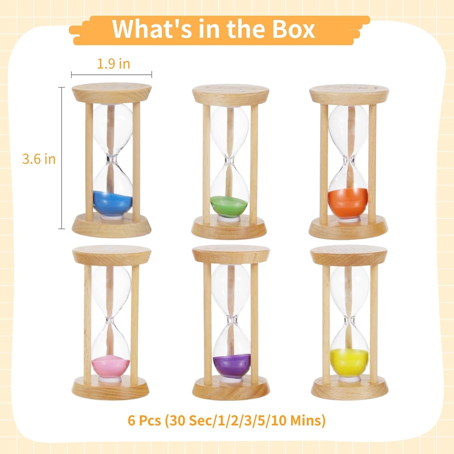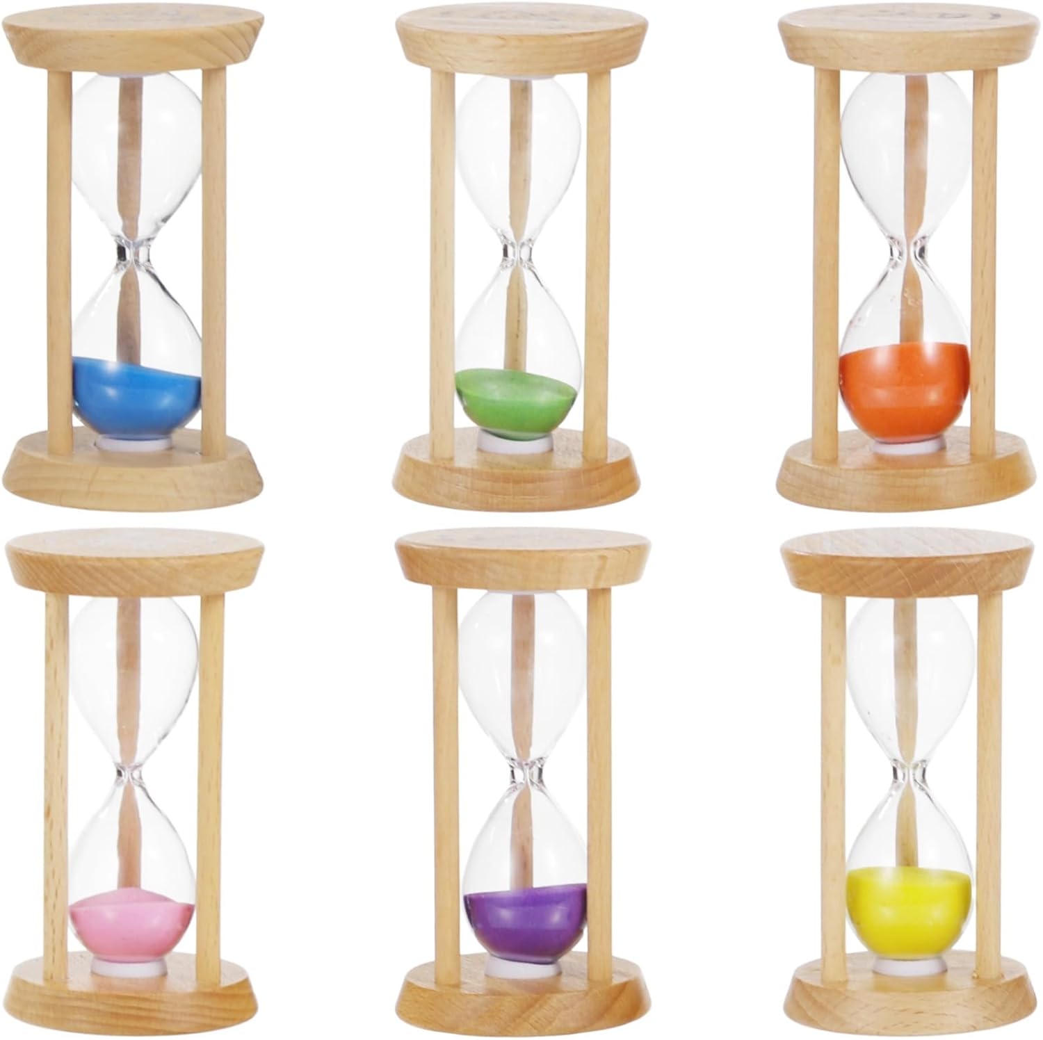 Vari intervalli di tempo: dispone di sei timer di sabbia con durate assortite di trenta secondi, un minuto, due minuti, tre minuti, cinque minuti e dieci minuti; chiaramente etichettati per lenire l'uso; adatto per numerose attività Colori sabbia giocosi: ogni timer incorpora un colore sabbia vivace unico come viola, giallo e verde; migliora l'estetica di qualsiasi stanza; coinvolge i bambini a imparare a misurare il tempo Design in legno affidabile: realizzato con una robusta struttura in legno che fornisce un'eccellente stabilità; garantisce durata in qualsiasi scenario di utilizzo; lucidato per un tocco liscio che è sicuro per tutti Design in vetro trasparente: i tubi di vetro trasparente garantiscono una visione completa della sabbia colorata; osserva la sabbia che scorre per un'esperienza incantevole; aiuta a insegnare ai bambini la gestione del tempo Compatto e multifunzionale: dimensioni di 4,8 x 8,6 cm, leggero e facilmente portatile; adatto per varie impostazioni come giochi, spazzolatura dei denti, cucina e relax; aiuta a monitorare efficacemente il tempo