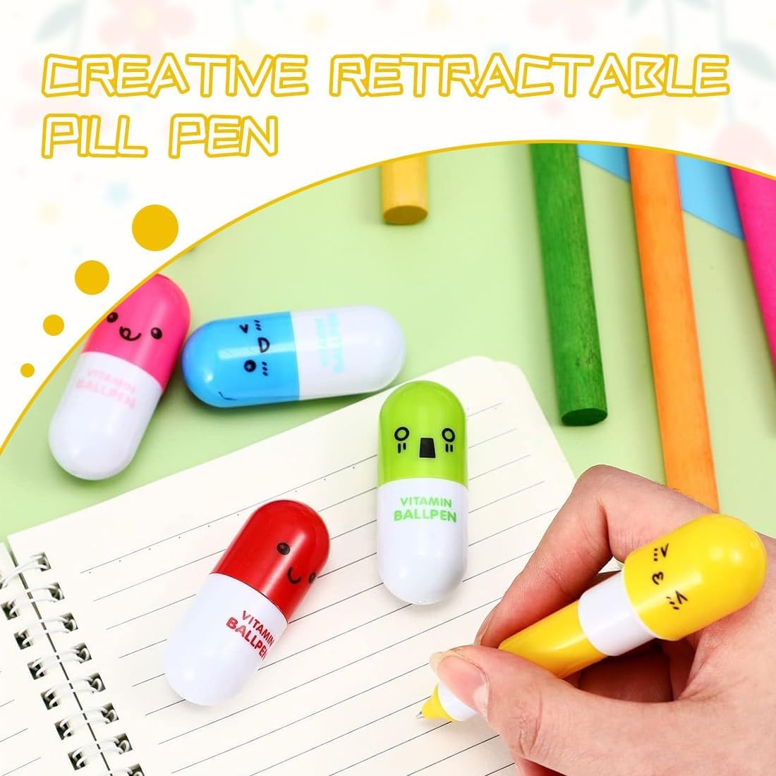 FORMA CREATIVA DELLA PILLOLA: i penna multicolore sono progettati con una forma unica di pillola con colori brillanti e ricchi ed espressioni carine, che è molto creativa e può attirare l'attenzione all'istante. COMODO DESIGN RETRATTILE: i penna multifunzione adottano una pratica struttura retrattile, una leggera pressione può essere facilmente estratta dal nucleo per inserirla, senza bisogno di un cappuccio, facile da usare, ma anche per evitare la preoccupazione di perdere il cappuccio. SCRITTURA FLUIDA E SCORREVOLE: i stick penne a sfera retrattile hanno un'esperienza di scrittura fluida, inchiostro uniforme, scrittura chiara, sia per i registri quotidiani che per i compiti di scrittura, possono portare un'esperienza di scrittura confortevole. MATERIALI DI ALTA QUALITÀ E DURATA: i penne per pillole per bambini sono realizzati con materiali di alta qualità, il corpo della penna è robusto, non facile da danneggiare, in grado di sopportare un uso quotidiano frequente, lunga durata. VARI COLORI: i penne multicolore bambini regalo feste hanno una varietà di colori, come il blu, il giallo, il rosa, il rosso, l'arancione e il verde, ecc. per soddisfare le diverse esigenze di scrittura e le preferenze personali, aggiungendo divertimento alla scrittura.