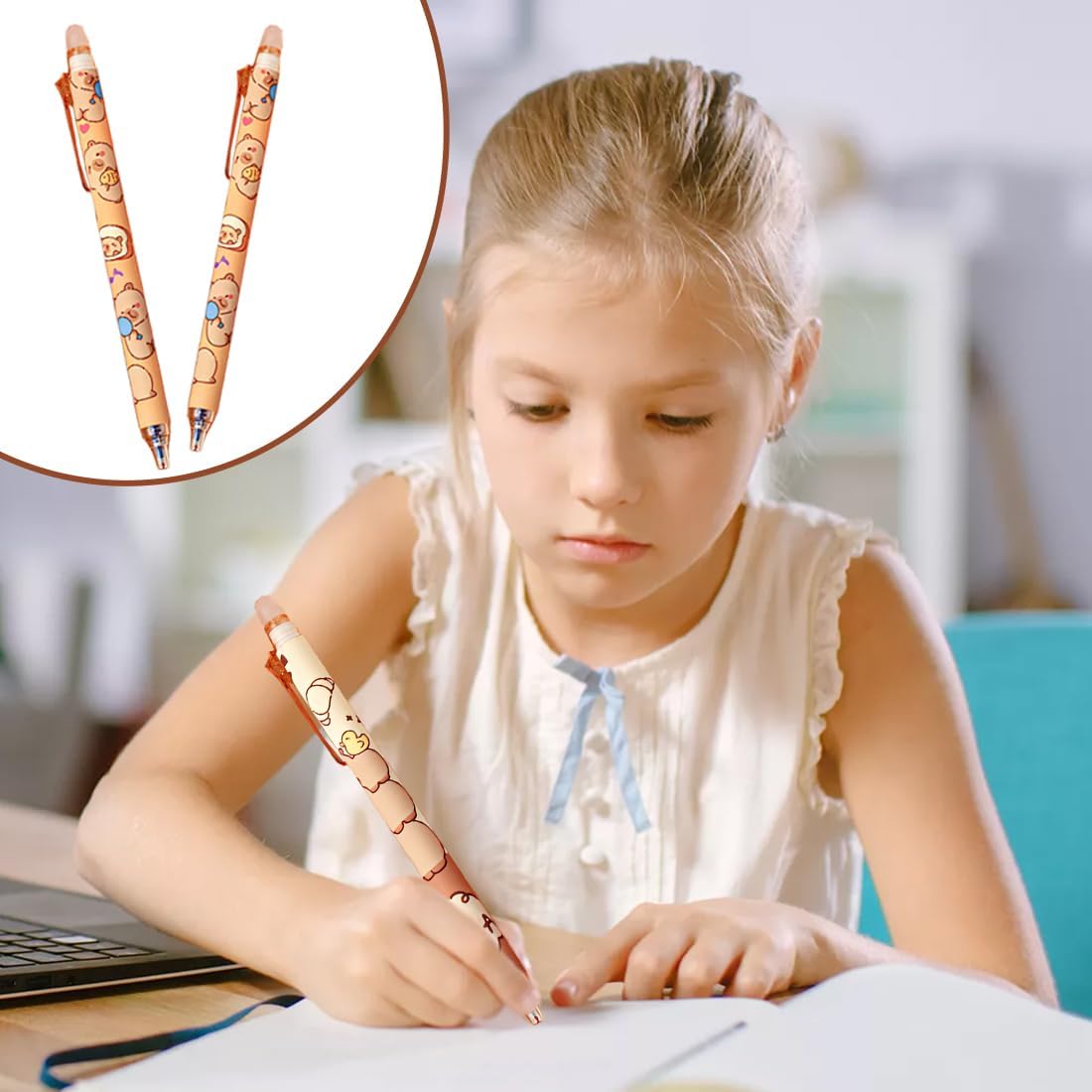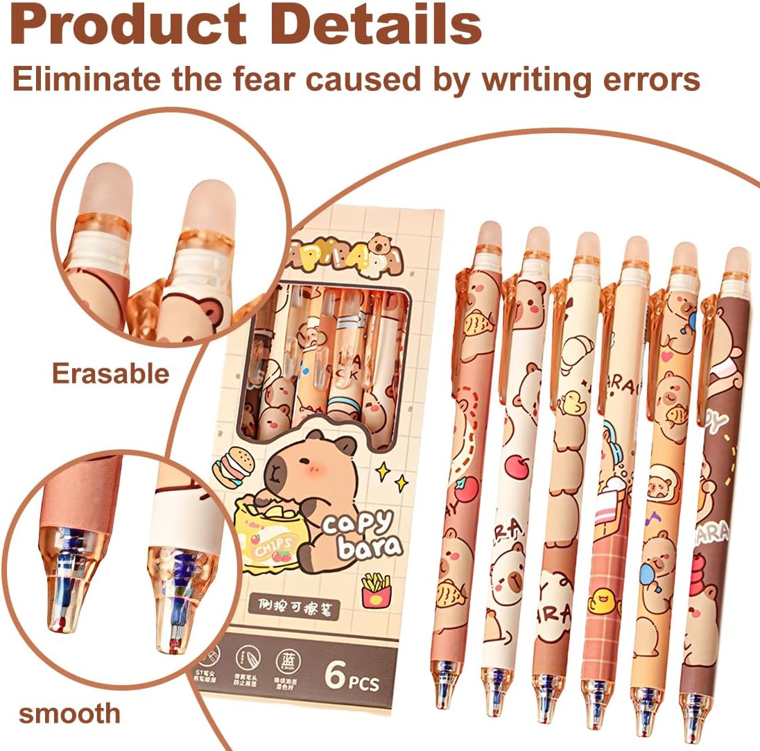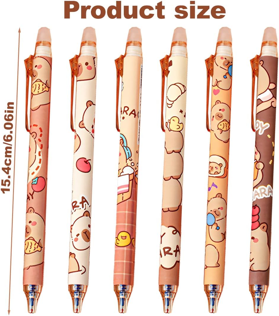 Elimina la paura degli errori: Grazie all'inchiostro termosensibile blu, puoi correggere facilmente gli errori utilizzando la sfera alla fine della penna. La sfera non si consuma come le gomme tradizionali, non danneggia la superficie e cancella perfettamente. Nota: Non utilizzare questa penna cancellabile per documenti ufficiali importanti come contratti o esami Dimensioni pratiche e versatilità: Con un diametro della mina di 0,5 mm e un'altezza di 14 cm, questa penna gel cancellabile è ideale per destrimani e mancini. Perfetta per scrivere con precisione e comodità, si adatta a ogni esigenza di scrittura quotidiana Scrittura morbida e confortevole: La zona di presa gommata garantisce una posizione di scrittura comoda e precisa. La penna a sfera offre una sensazione di scrittura fluida e piacevole, ideale per imparare a scrivere o per sessioni di scrittura prolungate Design adorabile e unico: Penna kawaii con cappuccio a forma di animale, ispirata al capibara in 6 pose diverse. I motivi di cartone animato sono amati dai bambini e rendono questa penna un accessorio divertente e originale per la scuola o il tempo libero Regalo perfetto per studenti e bambini: Questa penna cancellabile è un'idea regalo ideale per occasioni come Natale, compleanni, Pasqua, Halloween e altro. Perfetta per prendere appunti, fare i compiti, disegnare e firmare, può essere utilizzata a scuola, in ufficio o a casa