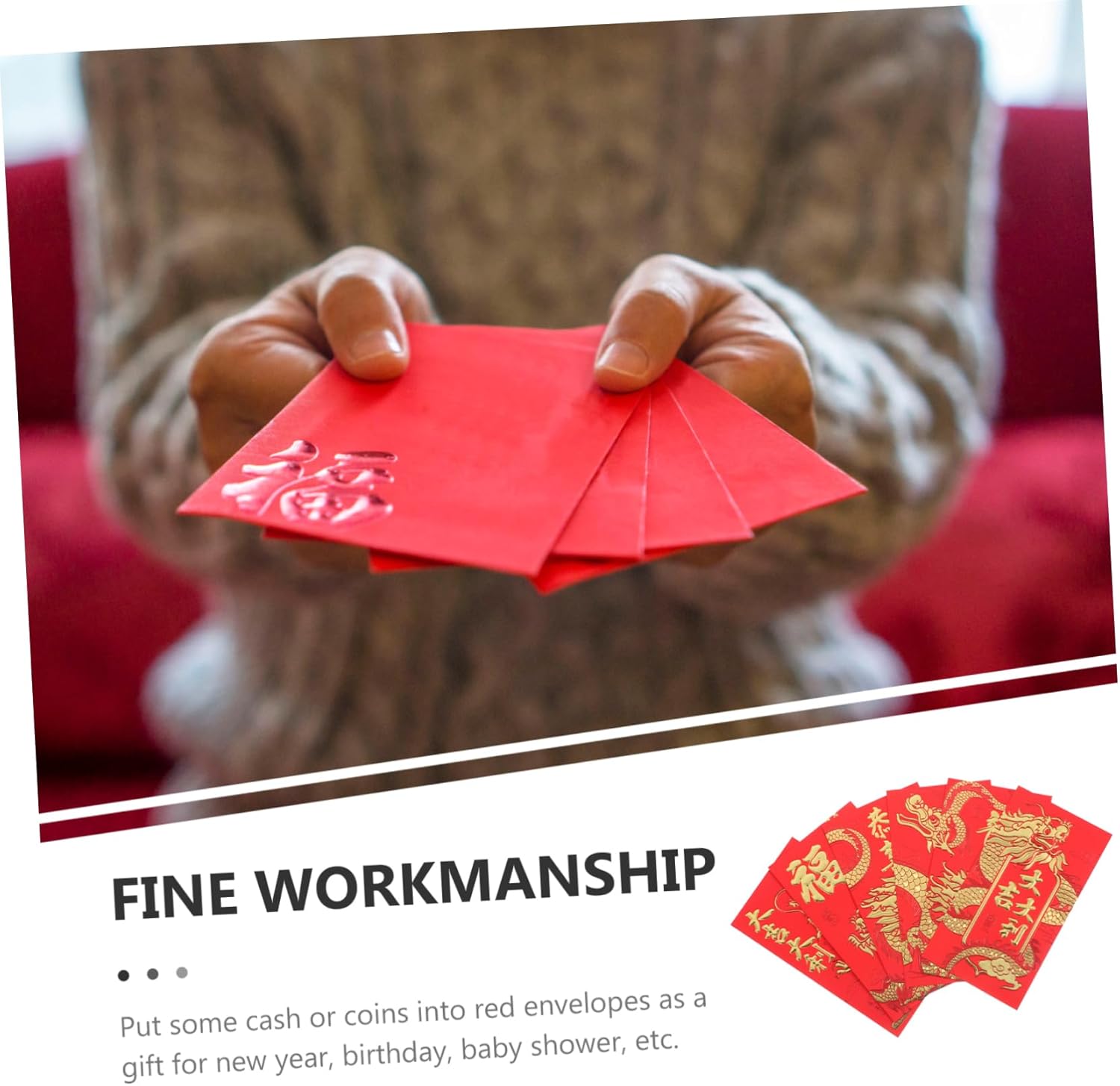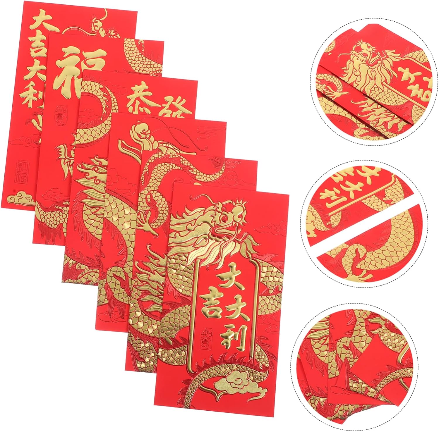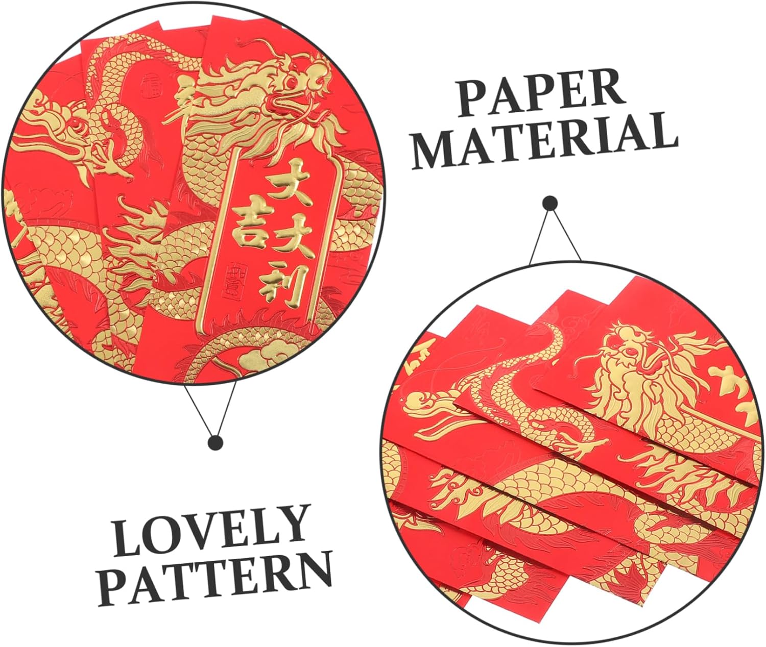 Elementi tradizionali: queste buste rosse sono piene di elementi relativi alla cultura tradizionale cinese, adatte a vari eventi tradizionali. Carta spessa: le buste portafortuna sono realizzate con carta spessa e di alta qualità, garantendo una conservazione sicura e una maggiore durata. Dimensioni adeguate: questi pacchetti rossi sono progettati con dimensioni adeguate che possono contenere abbastanza contanti e persino biglietti di auguri o altri piccoli oggetti. Può permetterti di mettere contanti, piccoli gioielli, piccoli biglietti di auguri e così via in modo più sicuro, dando al destinatario una sorpresa. Varie occasioni: queste allegre buste rosse sono ideali per tutti i tipi di occasioni , come feste di , matrimoni, lauree e altro ancora.