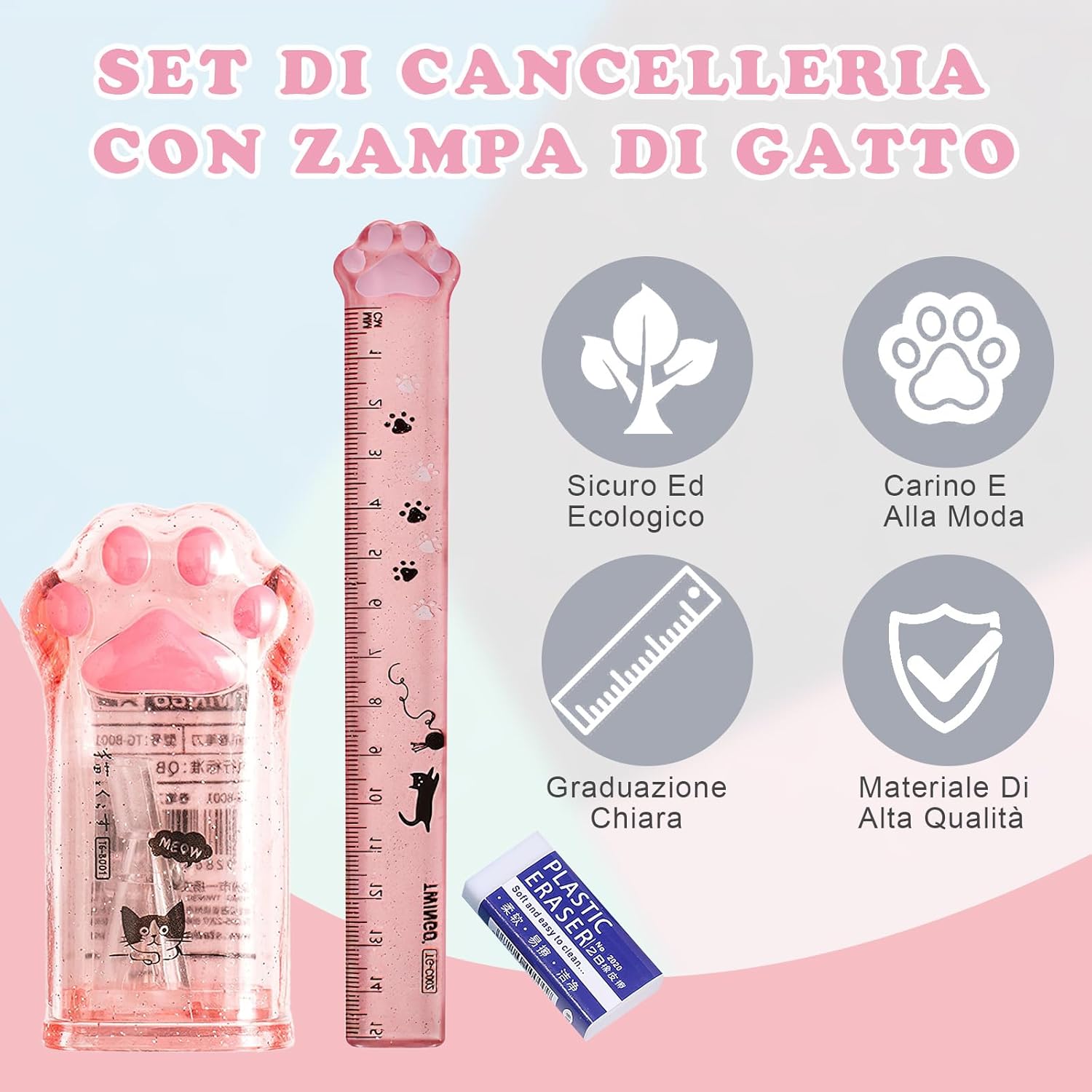 🐾【Contenuto Del Prodotto】Riceverete 2 pezzi del righelli 15 cm (rosa, grigio), 2 pezzi del Rullo di matite (rosa, grigio) e 1 gomma rettangolare bianca. Il temperamatite ad artiglio di gatto è adatto per affilare matite o pennelli per bambini, la lama è affilata e risparmia fatica, la misura del regolo ad artiglio di gatto è di 15 cm. 🐈【Materiale di Alta Qualità】Realizzato in plastica di alta qualità, lama in metallo e materiale TPR, il temperino con serbatoio bambina grigio è dotato di un contenitore trasparente per i trucioli di matita a forma di zampa di gatto, il Righello ha una simpatica forma di zampa di gatto a un'estremità del righello, il righello è trasparente e pieno di divertimento per bambini, amato dai bambini. 🐾【Facile da Trasportare】I rullo di matite e righello piccolo per astuccio ad artiglio di gatto sono piccoli, leggeri e facili da trasportare, adatti ai bambini per andare a scuola, un regalo unico per i bambini. In un ambiente noioso, può anche essere usato come una bella decorazione. 🐈【Facile da Pulire】Il fusto trasparente del Temperamatite a zampa di gatto permette di vedere chiaramente la buccia della matita, evita che i trucioli cadano e volino in giro, è facile da pulire in modo tempestivo, per garantire la pulizia del rotolo di matite. Il corpo trasparente del righello del righello 15 cm permette di vedere chiaramente il testo coperto dal righello. 🐾【Ampia Gamma di Utilizzi】Questo Temperamatite è adatto a diversi tipi di matite, pennelli e pennelli per il trucco e può essere utilizzato in scuole, uffici, case e altri luoghi. Il righello con tabelline scritte può essere utilizzato per misurare la lunghezza di un oggetto e può essere utilizzato anche come altro strumento.