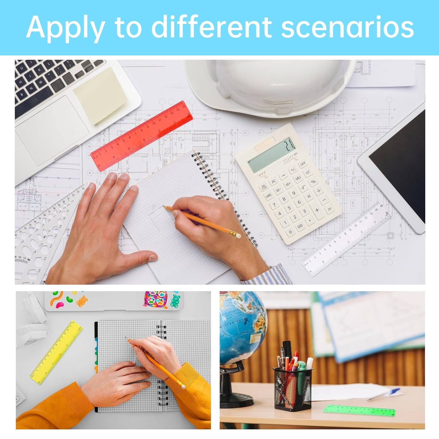 Pratico set: questo set contiene 6 righelli in plastica lunghi 15 cm, ideali per l'uso a scuola, a casa o in ufficio. Offrono dimensioni compatte, adatte sia per bambini che per adulti. Marcature in centimetri e pollici: ogni righello è dotato sia di centimetri che di marcatori in pollici, consentendo un'applicazione versatile per diverse esigenze di misurazione. Ideale per studenti che lavorano con entrambi i sistemi di misurazione. Design colorato: i righelli trasparenti in diversi colori incoraggiano l'apprendimento creativo e rendono la misurazione e il disegno un'attività divertente. Perfetto per i bambini che si divertono ad imparare. Plastica durevole: i righelli sono realizzati in plastica resistente che garantisce una lunga durata. Sono flessibili ma stabili e resistono alle esigenze dell'uso quotidiano a scuola, in ufficio o a casa. Applicazione versatile: questi pratici righelli sono adatti non solo per la scuola e le lezioni, ma anche per progetti di artigianato, disegni o lavori in ufficio. Sono facili da riporre e sono sempre a portata di mano quando sono necessarie misurazioni precise.