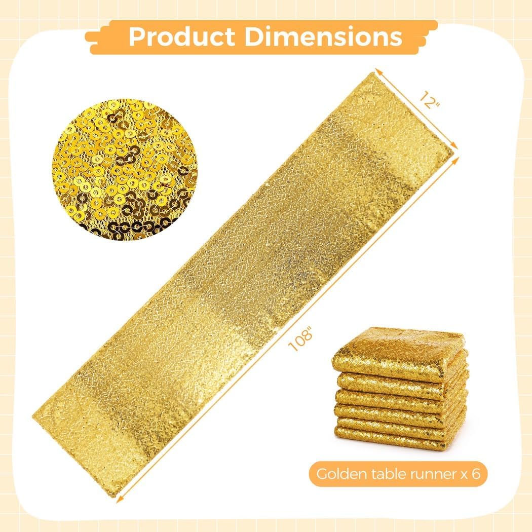Aspetto dorato radioso: questi runner decorativi da tavolo mostrano un aspetto dorato scintillante e abbagliante, che emette un affascinante bagliore sotto le luci; aggiunge glamour e lusso alla tua tavola Ampia applicazione: i runner da tavola con paillettes dorate funzionano bene non solo per i pasti quotidiani in famiglia, ma anche per occasioni importanti come matrimoni e feste di compleanno; sono oggetti di scena indispensabili per qualsiasi ristorante Dimensioni e volume adeguati: ogni runner decorativo misura 30,5 x 274,3 cm, fornendo una copertura completa del centro del tavolo; sei runner da tavola sono inclusi per confezione, che è sufficiente per soddisfare tutte le esigenze contemporaneamente Lavorazione raffinata: realizzati con meticolosa attenzione, i nostri runner da tavola sono dotati di un bordo, superficie piatta, fornendo un tocco piacevole; le paillettes si attaccano saldamente al tessuto, in modo che non si stacchino senza sforzo; sono facili da pulire e resistono allo sbiadimento Struttura in poliestere superiore: i runner da tavola, realizzati in poliestere di qualità, sono robusti e durevoli, resistono a strappi o rotture; sono morbidi al tatto e supportano l'uso ripetuto sia a mano che in lavatrice