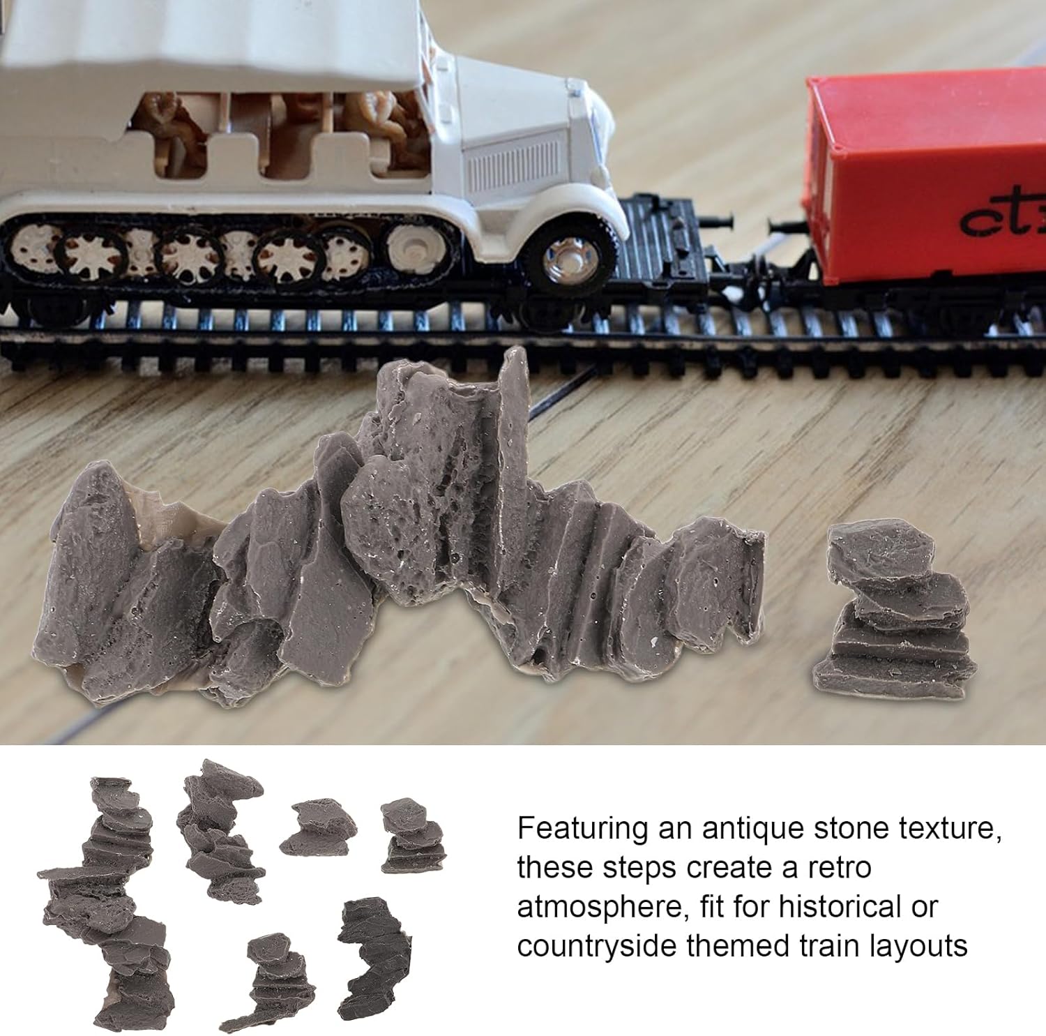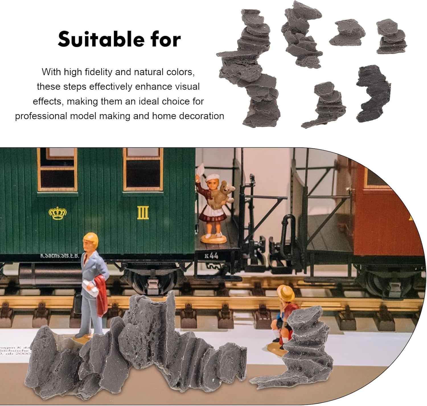 Dettagli raffinati: questi gradini in pietra in miniatura sono progettati con dettagli intricati per aumentare il realismo dei tuoi paesaggi modello, ideali per gli appassionati di modellismo ferroviario durata: realizzati con materiali durevoli, questi gradini mantengono il loro fascino estetico e resistono all'usura, adatti per esposizioni a lungo termine o frequentemente spostate Facile da installare: i gradini sono dimensionati per adattarsi a vari modelli di diorama, rendendoli facili da installare e adatti per gli appassionati del fai da te Texture in pietra antica: con una finitura in pietra vintage, questi gradini un'atmosfera retrò, adatta a layout di treni a tema storico o Elevato realismo: con texture realistiche e colori naturali, questi gradini migliorano gli effetti visivi, rendendoli una scelta per la modellistica professionale e la decorazione della casa