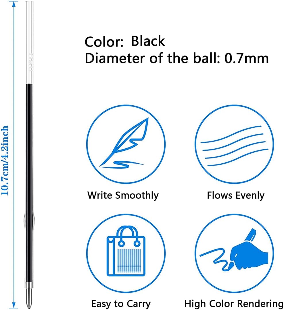 🖊️Il Pacchetto Include: Riceverai 60 pezzi di ricariche di ricambio per penne a sfera da 0,7 mm per penne retrattili, 4,2 pollici/ 107 mm di lunghezza; Una quantità sufficiente può soddisfare le tue diverse esigenze di scrittura, studio e lavoro e puoi condividerle con i tuoi amici e compagni di classe. 🖊️Comodo da Usare: Puoi tagliare la lunghezza della ricarica della penna retrattile per abbinarla a una varietà di penne, risparmiando tempo ed energia; Sono portatili e pratici, se la lunghezza della ricarica è troppo lunga, puoi tagliarne la lunghezza per adattarla alla custodia della penna, infine installarla nella custodia della penna e puoi usarla. 🖊 Ottime Prestazioni: Il refill per penna a sfera viene fornito con una punta da 0,7 mm, che consente di scrivere o disegnare linee sottili su carta in modo fluido e senza sforzo, che si adattano perfettamente alle penne retrattili, comode da sostituire, utili per ridurre gli sprechi, in grado di risparmiare tempo per selezionare altre penne. 🖊️Occasioni Applicabili: Queste ricariche per penne sono adatte per essere applicate in qualsiasi occasione, inclusi casa, aula, ufficio, negozi e così via, abbastanza ricariche di dimensioni tascabili che sono più facili da riporre; E può anche essere regalato ad altri 🖊️Servizio eccellente: Se avete domande sui nostri prodotti, non esitate a contattarci.