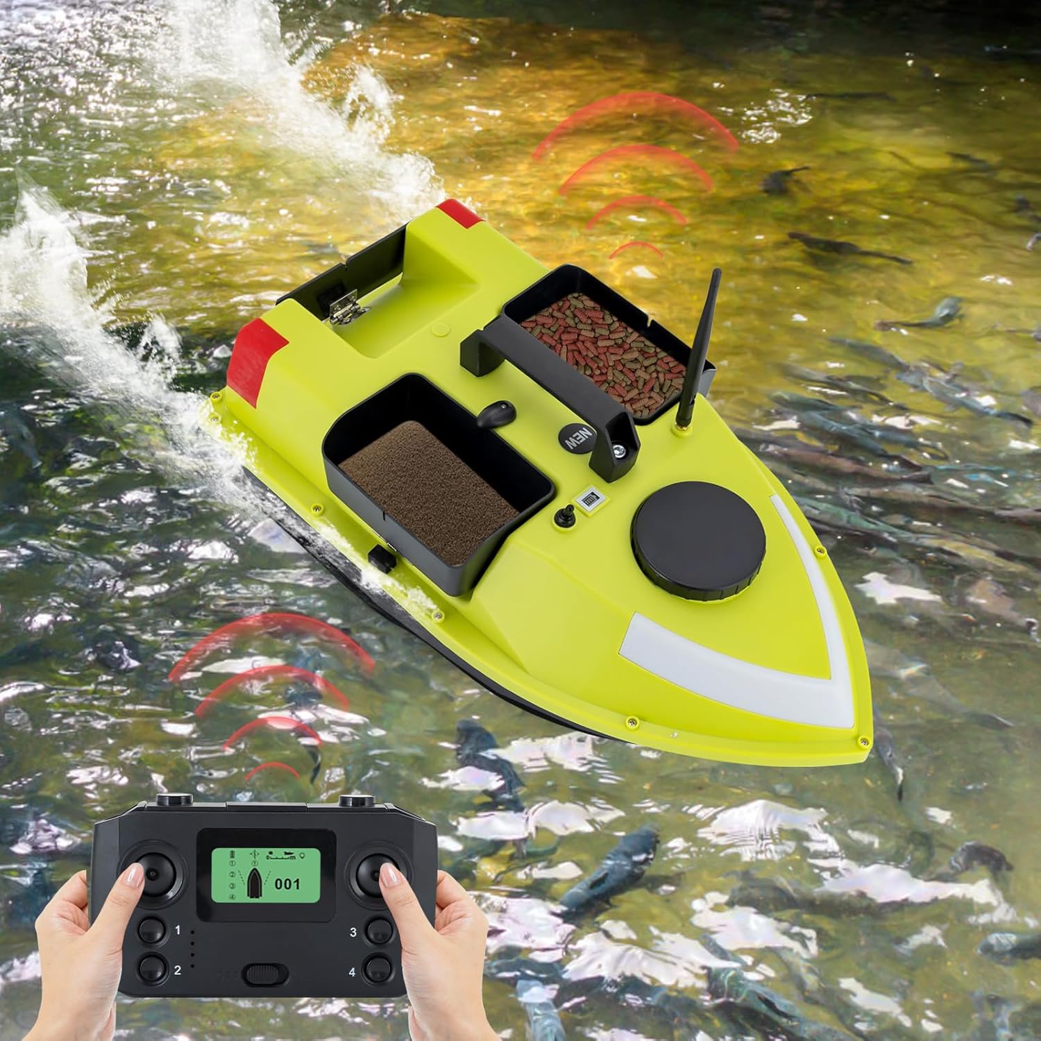 Goditi la tua pesca: è alimentato da due motori 390 con una potenza di 52 W, una velocità massima di 10.000 giri/min, una velocità di guida di 5,91 ft/s e 99 punti da traina. Inoltre, i tre contenitori possono contenere fino a 4,4 libbre, che a loro volta possono essere caricati con mais, esche ed esche artificiali, consentendo un'esperienza di pesca precisa ed efficiente nelle tue spotting! Shine in the Dark: adotta luci di navigazione notturna a LED, una striscia luminosa regolabile in sette colori (blu, bianco, rosso, verde, viola, arancione, giallo) che possono essere controllate manualmente commutando la striscia per controllare l'effetto dell'acqua che scorre, anche se si pesca di notte, è anche possibile osservare chiaramente la vostra barca da pesca esca e identificare la direzione nel tempo! Design pensato: lo scafo aerodinamico è completamente chiuso e impermeabile, il che riduce la resistenza all'acqua e rende la barca da pesca più stabile, mentre la copertura dell'elica impedisce all'esca di aggrovigliarsi nell'erba o nelle piante. Inoltre, la correzione automatica dell'imbardatura, la perdita di connessione e il ritorno automatico a batteria scarica assicurano che è possibile utilizzare in sicurezza la barca anche in ampie acque e il telecomando ti avvisa automaticamente quando il livello della batteria è basso. Libera le tue mani: il design ingegnoso del telecomando può essere utilizzato in un intervallo di circa 1968 piedi per soddisfare le tue esigenze, mentre lo schermo LCD è comodo per osservare il livello di potenza, segnale segnale GPS, promemoria posizione casa, luci di navigazione barca, punto di ritorno, punto di posizionamento, distanza, e una varietà di tasti precisi, ruote, ecc. possono aiutarti. il messo, torna al mare, posizionamento e così via. Lunga durata: viene fornito con 2 batterie agli ioni di litio da 5200 mAh, ognuna delle quali può resistere fino a 90 minuti con una carica completa, abbastanza per supportare 1 giorno di pesca all'aperto.