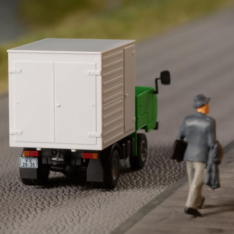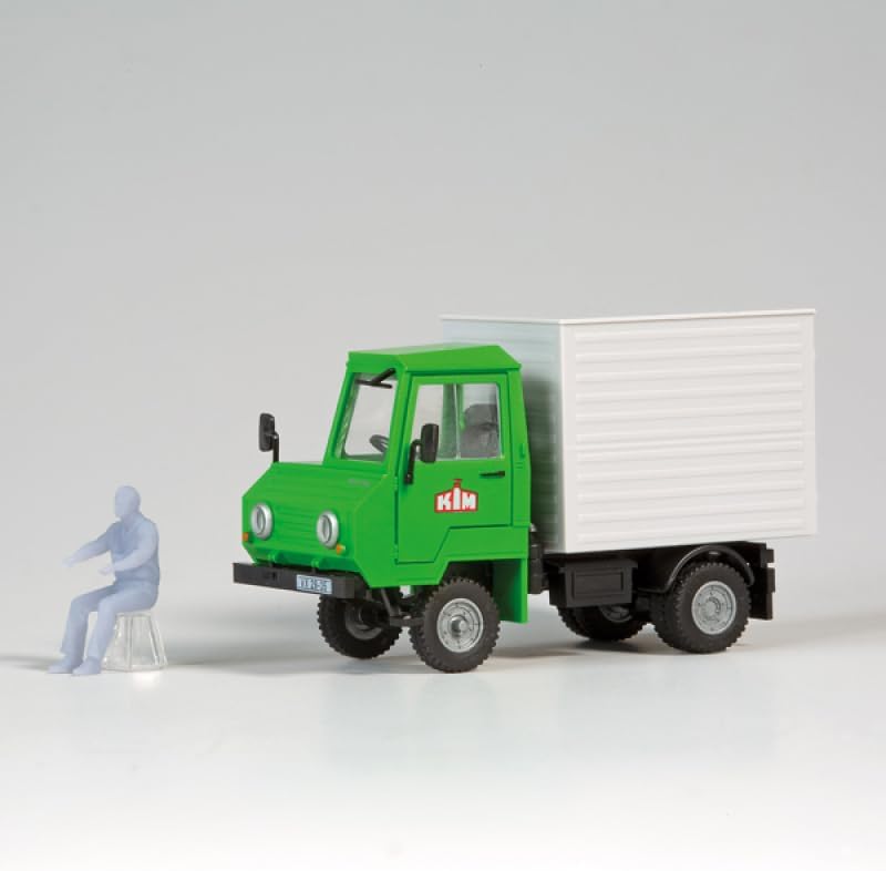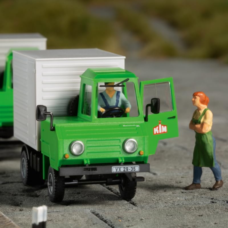 Auhagen presenta un kit modello finemente dettagliato della Multicar M24-0. Con la struttura a valigia, il veicolo in scala per il "montante industriale combinato" (KIM) è in movimento. Il logo, gli anelli decorativi, le luci posteriori, le maniglie delle porte e le targhe vengono stampati più volte. Questo modello di veicolo completamente ricostruito è dotato di portiere aperte, tromba del motore, pneumatici etichettati su cerchi ridisegnati correttamente e capacità di rotolamento. I semiassi sono in acciaio annerito. Caratteristiche: kit di costruzione - Dimensioni: 44 x 24 x 27 mm - Include figura seduta e foglio di stampa con targhe alternative