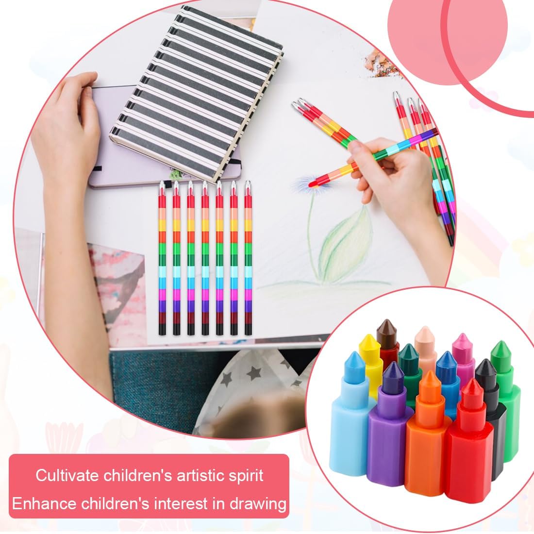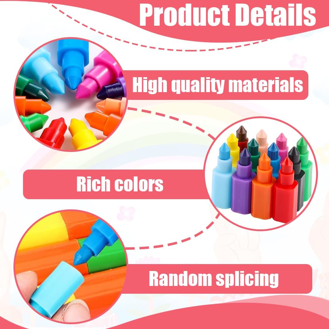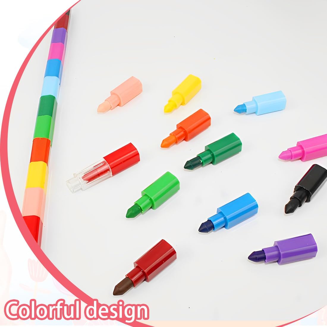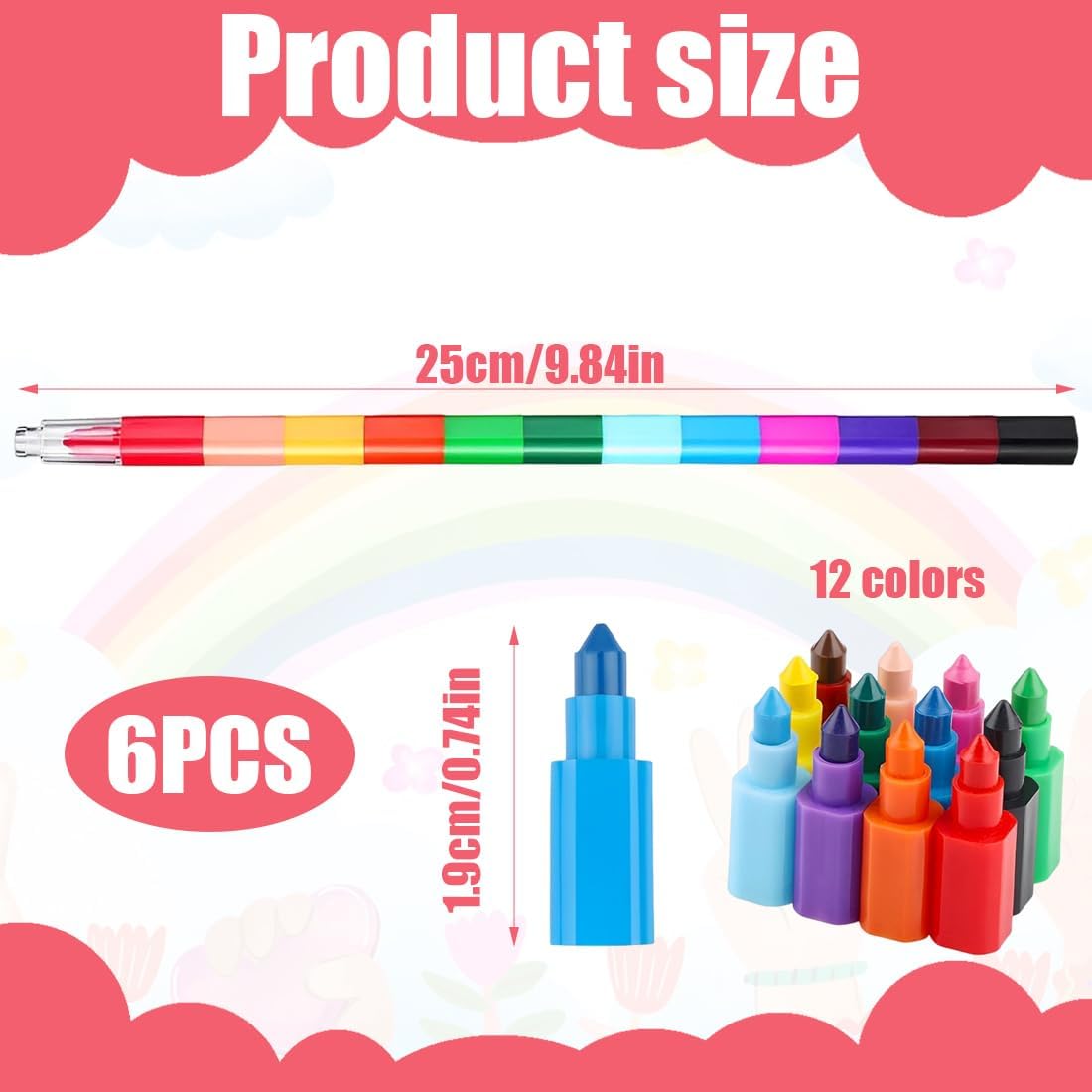 Ogni pastello è composto da 12 colori diversi per favorire il riconoscimento dei colori da parte dei bambini e fornire un uso facile e pratico dei colori. I pastelli possono essere regolati alla lunghezza desiderata o combinati in diversi disegni per migliorare le abilità pratiche e l'immaginazione dei bambini. Perfetti per i compleanni dei bambini, le feste di compleanno, i regali di Natale o come premi della lotteria, perfetti per i bambini, i compagni di classe e gli amici. I pastelli sono realizzati in materiale di alta qualità, dai colori vivaci e non facili da rompere. I portapenne sono in plastica sicura e inodore. Queste penne impilabili arcobaleno rendono i disegni, i dipinti e le opere d'arte divertenti e interessanti, adatte come regali di compleanno per bambini, regali di Natale, regali di Pasqua per bambini, compagni di classe, studenti o amici.