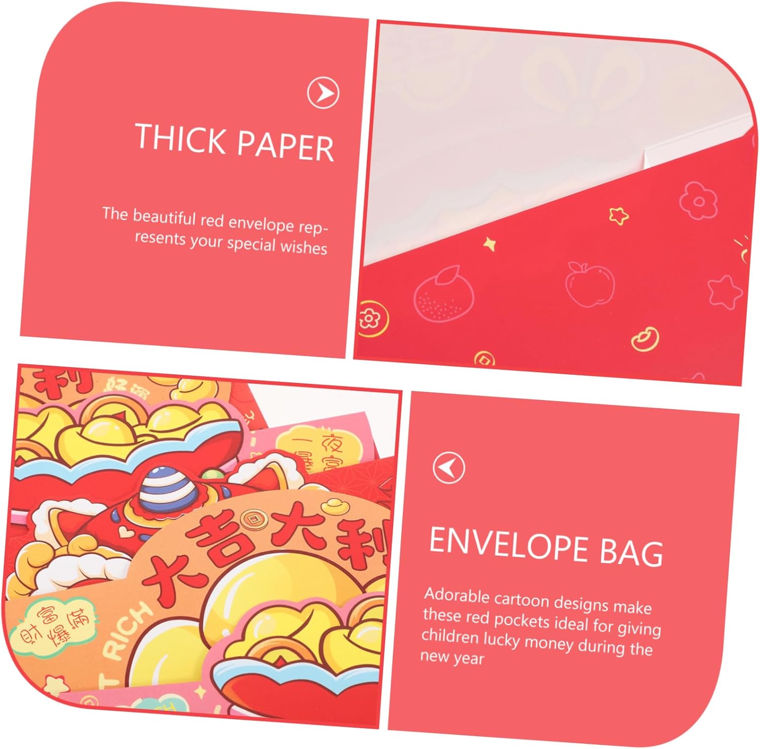 Benedizioni tradizionali: ogni portamonete cinese per il Capodanno è adornato con benedizioni tradizionali cinesi, che lo rendono ideale per condividere benedizioni e felicità Adatto a vari eventi: ideale per Capodanno cinese, Capodanno lunare, compleanni, matrimoni, Natale e altre occasioni festive Costruzione solida: realizzata con carta robusta resistente all'usura, che garantisce un uso duraturo Disegni di cartoni animati affascinanti: i disegni di cartoni animati carini e affascinanti delizieranno sicuramente i bambini, rendendoli entusiasti di ricevere i loro soldi fortunati Spaziose e pratiche: progettate per contenere banconote, queste borse portafortuna per il festival di offrono molto spazio per i tuoi regali in contanti