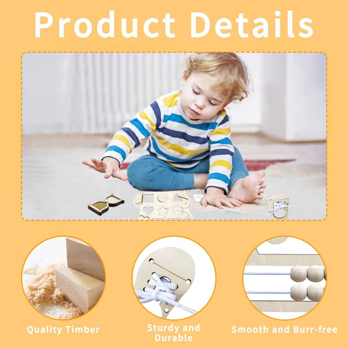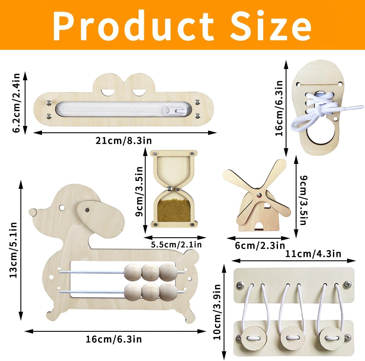 Giocattolo educativo in legno per bambini:Gli accessori del Montessori Busy Board favoriscono lo sviluppo motorio e cognitivo dei bambini dai 1 ai 6 anni. È il gioco ideale per l'educazione prescolare, migliorando la coordinazione occhio-mano, la motricità fine e le capacità di risoluzione dei problemi. Giocattolo educativo versatile:Questo set di accessori in legno per Montessori Busy Board include una tavola di abbinamento a due livelli, una cerniera a forma di rana, una clessidra, lacci, un bottone e un abaco cucciolo. Ogni accessorio promuove diverse abilità e garantisce ore di gioco e apprendimento. Materiali sicuri e di alta qualità:Gli accessori del Montessori Busy Board sono realizzati in legno di alta qualità, con una lavorazione accurata. La superficie liscia e priva di sbavature garantisce la sicurezza della pelle delicata dei bambini. Il legno è non tossico e resistente alla corrosione, rendendo il gioco sicuro. Rafforza il legame genitore-bambino:Gli accessori del Montessori Busy Board sono ideali non solo per i bambini ma anche per i genitori che possono giocare con i loro figli, migliorando la comunicazione e il legame familiare. Regalo ideale per i bambini:Gli accessori del Montessori Busy Board sono un regalo perfetto per compleanni, Natale o altre occasioni speciali. Offrono ore di divertimento e apprendimento, migliorando le capacità cognitive e pratiche dei bambini.