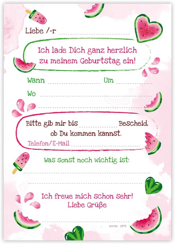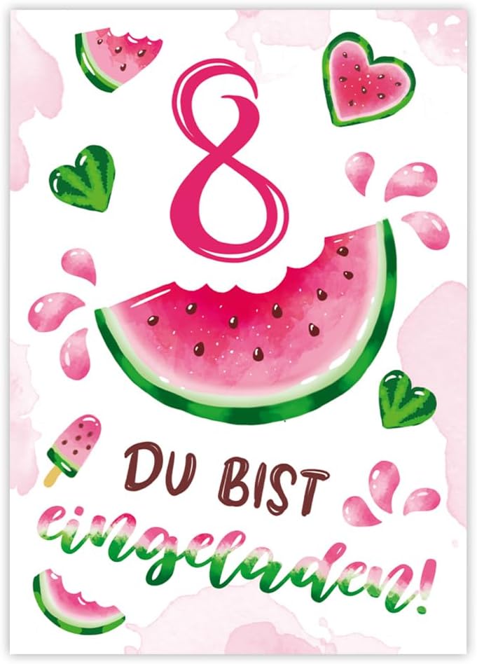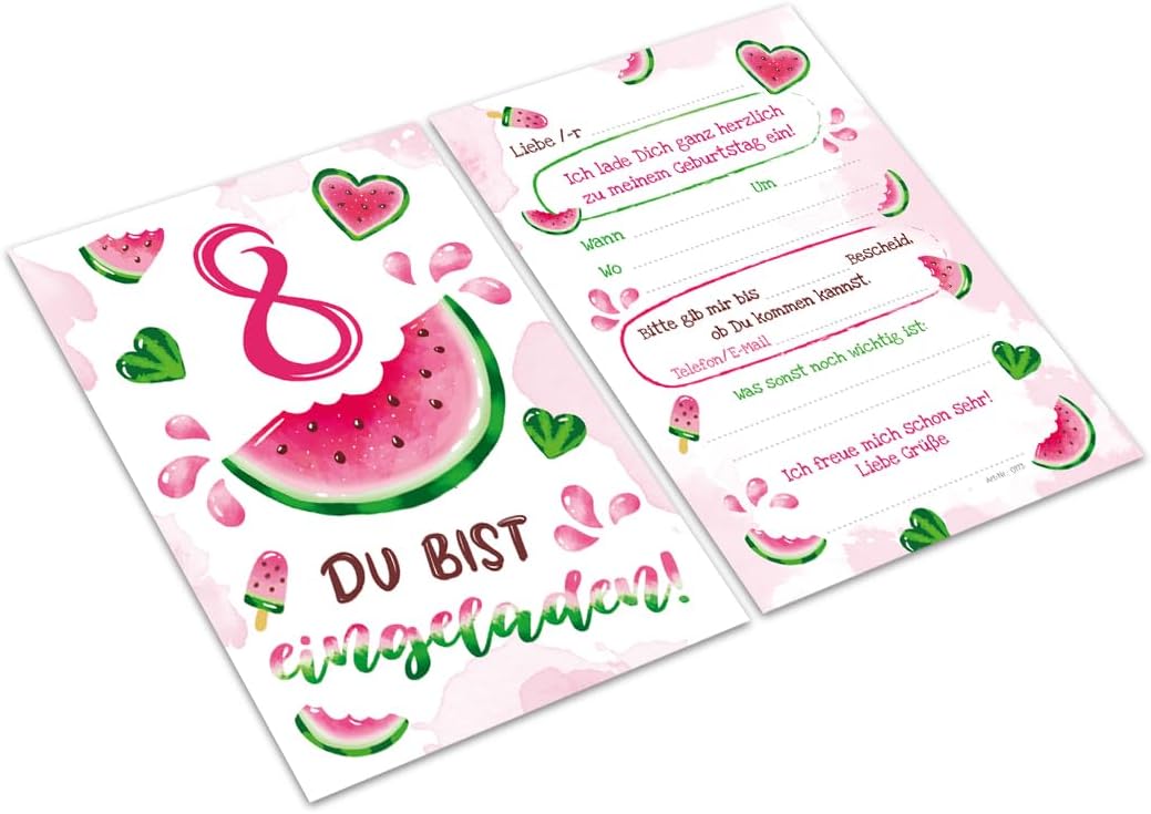 8 biglietti d'invito con 8 buste per 8° compleanno per bambini, motivo anguria, invito per l'ottavo compleanno, per ragazze, inviti di compleanno