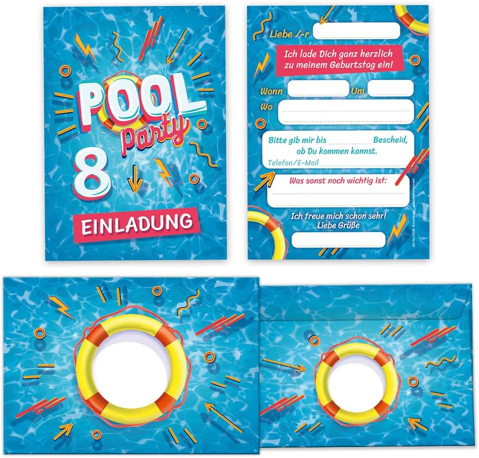 Contenuto: 8 biglietti d'invito + 8 buste Pratico: gli inviti sono moderni e progettati con molti dettagli. Sul retro troverete i campi prestampati da compilare. Biglietti: i biglietti d'invito sono molto robusti, hanno formato A6 (10,50 cm x 14,80 cm), stampa di alta qualità 300 g/m e sono rivestiti con vernice UV per la finitura. Buste autoadesive: la busta ha una dimensione di 11,40 cm x 16,20 cm, stampa da 80 g/m ed è adesiva (con striscia adesiva). Occasioni: i biglietti di invito sono molto adatti per una festa di compleanno o una festa di compleanno. È possibile utilizzare questi biglietti anche come inviti per battesimi, feste a tema, feste al cinema o feste in piscina. HAI BISOGNO DI UN ALTRO NUMERO? : da noi troverete anche biglietti e buste in set da 6, 10 o 12 pezzi. Altri motivi: nel nostro negozio troverete anche molti altri motivi di inviti, come lama, sirena, calcio, cinema, piscina, bowling. Prodotto in Germania: i biglietti e le buste sono stati prodotti in una tipografia tedesca.