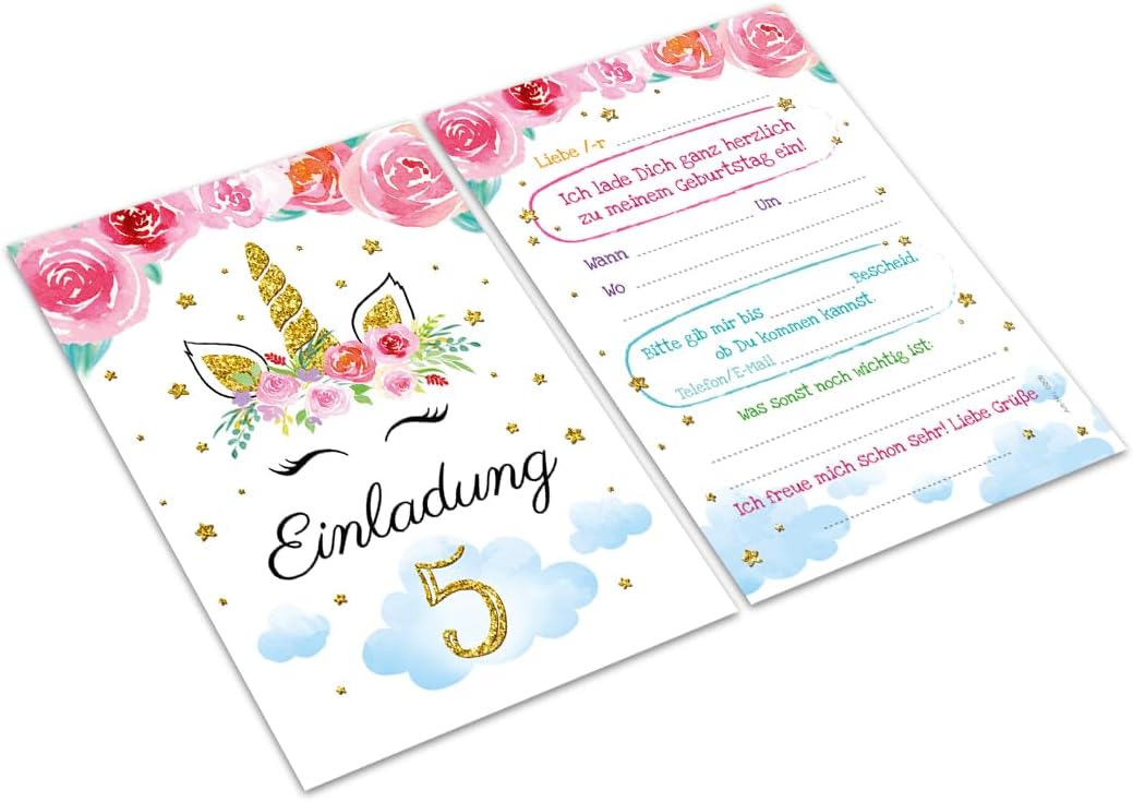 Contenuto: 8 biglietti d'invito + 8 buste Pratico: gli inviti sono moderni e progettati con molti dettagli. Sul retro troverete i campi prestampati da compilare. Biglietti: i biglietti d'invito sono molto robusti, hanno formato A6 (10,50 cm x 14,80 cm), stampa di alta qualità 300 g/m e sono rivestiti con vernice UV per la finitura. Buste autoadesive: la busta ha una dimensione di 11,40 cm x 16,20 cm, stampa da 80 g/m ed è adesiva (con striscia adesiva). Occasioni: i biglietti di invito sono molto adatti per una festa di compleanno o una festa di compleanno. È possibile utilizzare questi biglietti anche come inviti per battesimi, feste a tema, feste al cinema o feste in piscina. HAI BISOGNO DI UN ALTRO NUMERO? : da noi troverete anche biglietti e buste in set da 6, 10 o 12 pezzi. Altri motivi: nel nostro negozio troverete anche molti altri motivi di inviti, come lama, sirena, calcio, cinema, piscina, bowling. Prodotto in Germania: i biglietti e le buste sono stati prodotti in una tipografia tedesca.