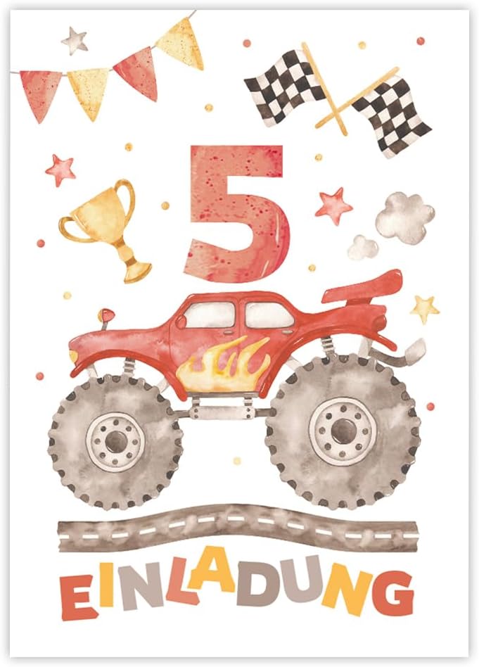 8 biglietti d'invito con 8 buste per il 5° compleanno dei bambini, per bambini, motivo: Monster-Truck, inviti per il quinto compleanno per bambini