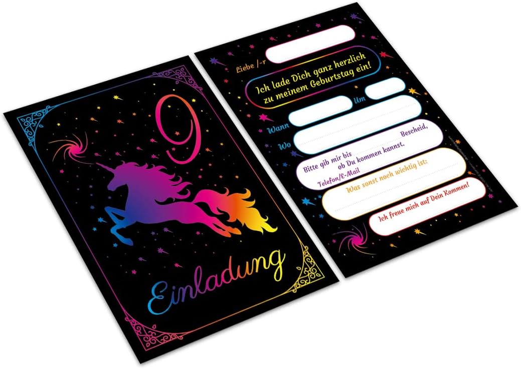 Contenuto: 8 biglietti d'invito + 8 buste Pratico: gli inviti sono moderni e progettati con molti dettagli. Sul retro troverete i campi prestampati da compilare. Biglietti: i biglietti d'invito sono molto robusti, hanno formato A6 (10,50 cm x 14,80 cm), stampa di alta qualità 300 g/m e sono rivestiti con vernice UV per la finitura. Buste autoadesive: la busta ha una dimensione di 11,40 cm x 16,20 cm, stampa da 80 g/m ed è adesiva (con striscia adesiva). Occasioni: i biglietti di invito sono molto adatti per una festa di compleanno o una festa di compleanno. È possibile utilizzare questi biglietti anche come inviti per battesimi, feste a tema, feste al cinema o feste in piscina. HAI BISOGNO DI UN ALTRO NUMERO? : da noi troverete anche biglietti e buste in set da 6, 10 o 12 pezzi. Altri motivi: nel nostro negozio troverete anche molti altri motivi di inviti, come lama, sirena, calcio, cinema, piscina, bowling. Prodotto in Germania: i biglietti e le buste sono stati prodotti in una tipografia tedesca.