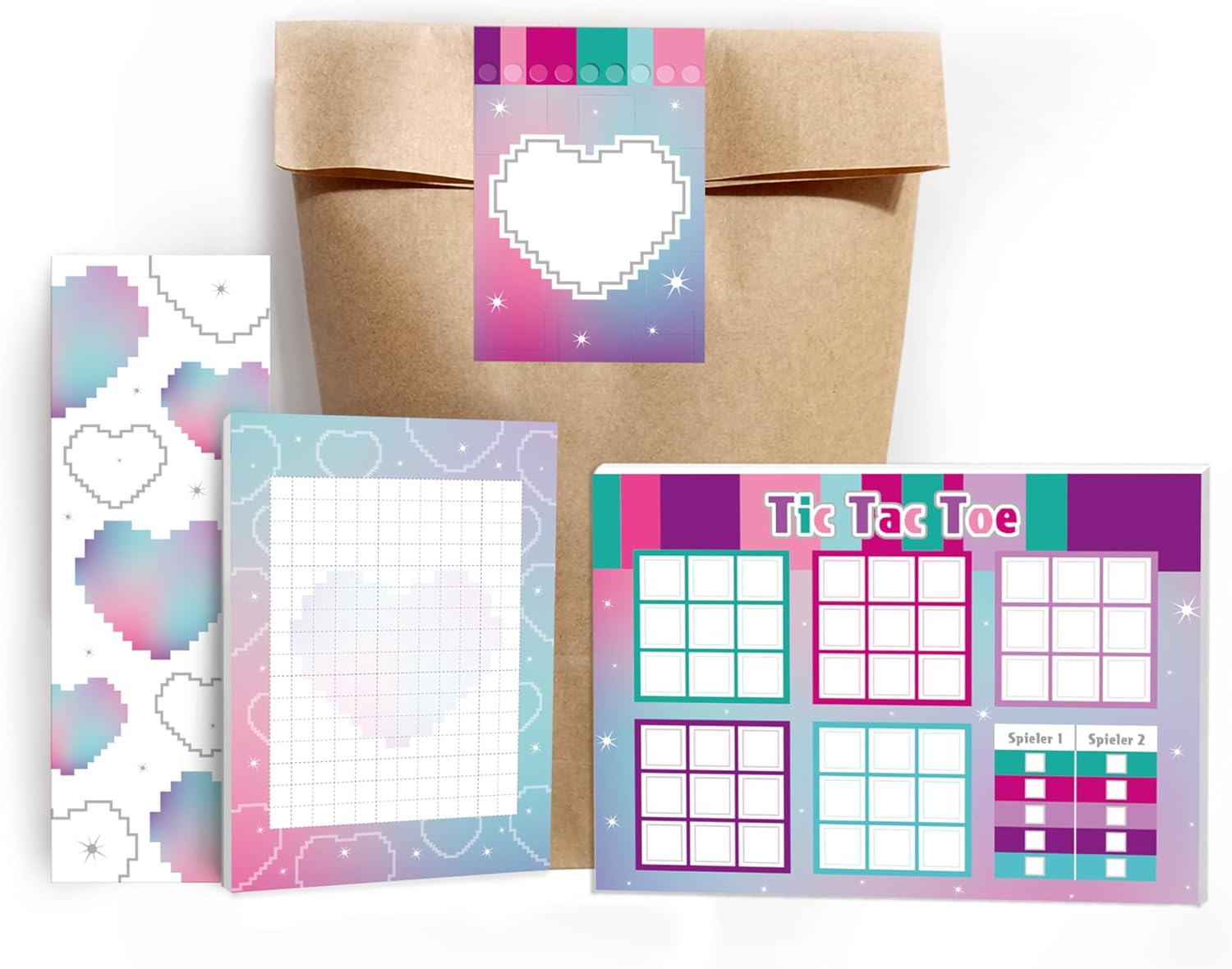CONTENUTO POPOLARE: 8 biglietti d'invito, 8 buste, 8 segnalibri, 8 mini taccuini, 8 Tic Tac Toe, 8 sacchetti con 8 adesivi in un set. FORMATO IDEALE: Il biglietto d'invito misura 10,5 x 14,8 cm / DIN A6, la busta misura 11,4 x 16,2 cm / DIN C6 (adesiva con striscia staccabile), la busta misura 14 x 22 cm, l'adesivo e il segnalibro misurano 5,2 x 14,80 cm, il mini blocco note misura 7,4 x 10,5 cm / DIN A7 e contiene 25 fogli, il Tic Tac Toe misura 14,8 x 10,5 cm/DIN A6 e contiene 25 fogli. QUALITÀ SUPERIORE: il biglietto d'invito: stampa di immagini di alta qualità da 300 g/m², rifinita con vernice UV. La busta: stampa di immagini di alta qualità da 80 g/m² ed è autoadesiva. La borsa: carta kraft naturale di alta qualità. L'adesivo: stampa di immagini di alta qualità, autoadesiva, scrivibile. Il segnalibro: stampa di immagini di alta qualità da 300 g/m², rivestita su entrambi i lati con vernice UV. I blocchi: carta bianca naturale da 80 g/m², incollata nella parte superiore, rinforzata con cartoncino grigio compatto sul retro. Prodotto in Germania. DESIGN E INDIVIDUALIZZAZIONE: I biglietti d'invito hanno sul retro campi prestampati da compilare e personalizzare.
