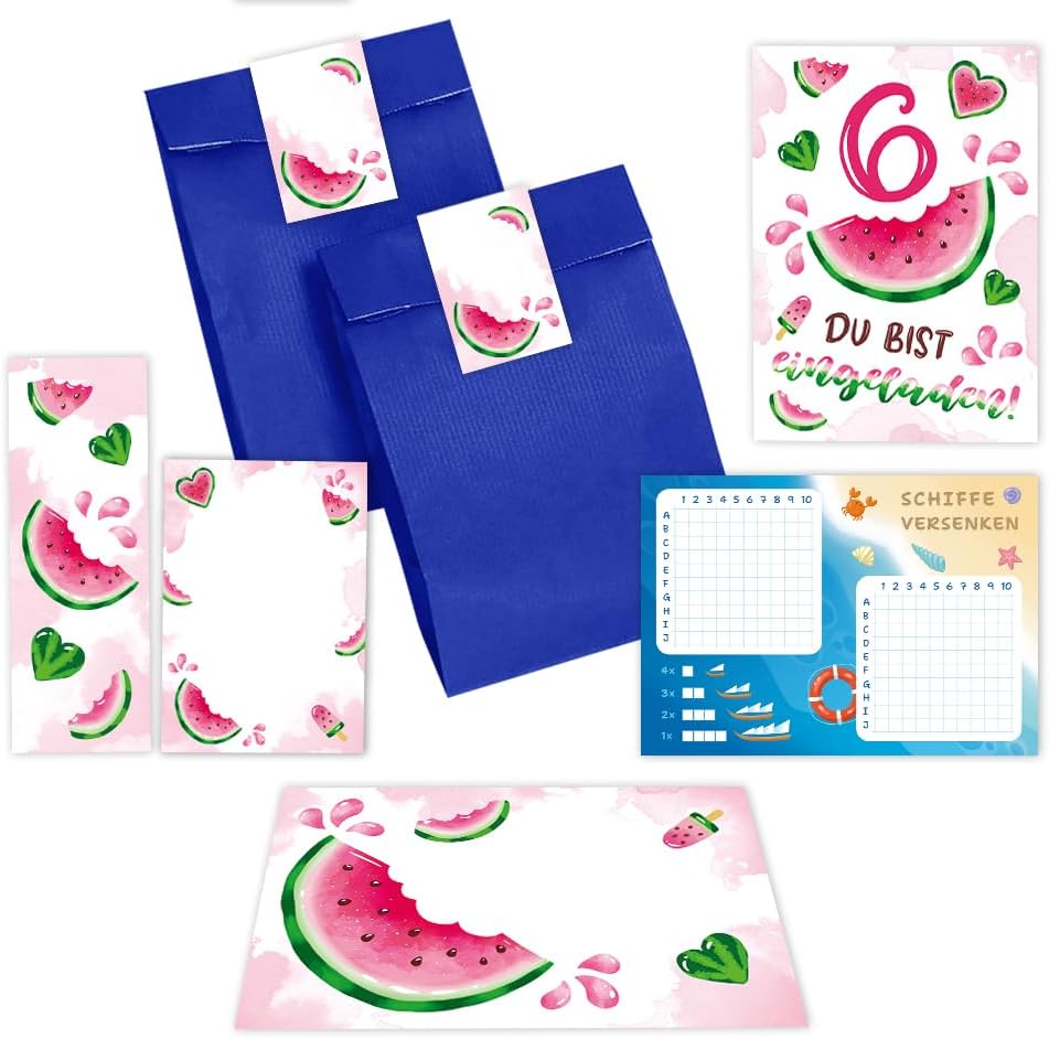 CONTENUTO: 8 biglietti d'invito + 8 buste + 8 sacchetti per feste/blu + 8 adesivi + 8 segnalibri + 8 quaderni + 8 navi affondate PRATICO: con questo set avrete non solo inviti con buste abbinate, sacchetti regalo per bomboniere e fantastici adesivi regalo da etichettare, ma anche quaderni, segnalibri e il gioco "Navi affondate" come bomboniere. BIGLIETTI E BUSTE: gli inviti sono moderni e curati nei dettagli. Sul retro troverai i campi prestampati da compilare. I biglietti d'invito sono molto stabili, hanno formato A6 (10,50 cm x 14,80 cm), stampa di immagini di alta qualità da 300 g/m² e sono rivestiti con vernice UV per la finitura. La busta ha una dimensione di 11,40 cm x 16,20 cm, stampa 80 g/m ed è autoadesiva (con strisce staccabili). SACCHETTI REGALO E ADESIVI: i sacchetti di carta misurano 12 x 19 cm. I sacchetti per feste sono molto adatti per confezionare piccole bomboniere o dolci per gli ospiti. ADESIVI: gli adesivi misurano 5,2 x 14,8 cm. Tu o tuo figlio potete scrivere "Grazie" e "Piacere che tu fossi lì!" sugli adesivi. oppure scrivi il nome dell'ospite. SEGNALIBRI E BLOCCHI: il segnalibro ha una dimensione di 5,2 x 14,80 cm, stampa immagine 300 g/m ed è rivestito con vernice UV (lucida) su entrambi i lati. Il blocco note ha una dimensione di 7,4 x 10,5 cm (DIN A7) e contiene 25 fogli. NAVI Affondate: il blocco “Navi Affondate” ha una dimensione di 14,80 x 10,5 cm (DIN A6) ed è composto da 25 fogli. OCCASIONE: il set da festa è molto adatto per una festa di compleanno o una festa di compleanno. Puoi utilizzare questi biglietti anche come inviti a battesimi, feste notturne, feste a tema, cinema o feste in piscina.