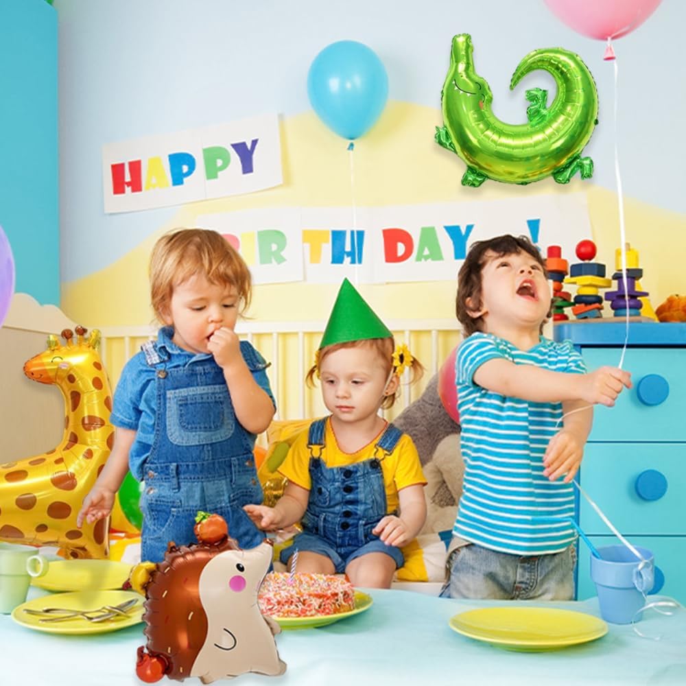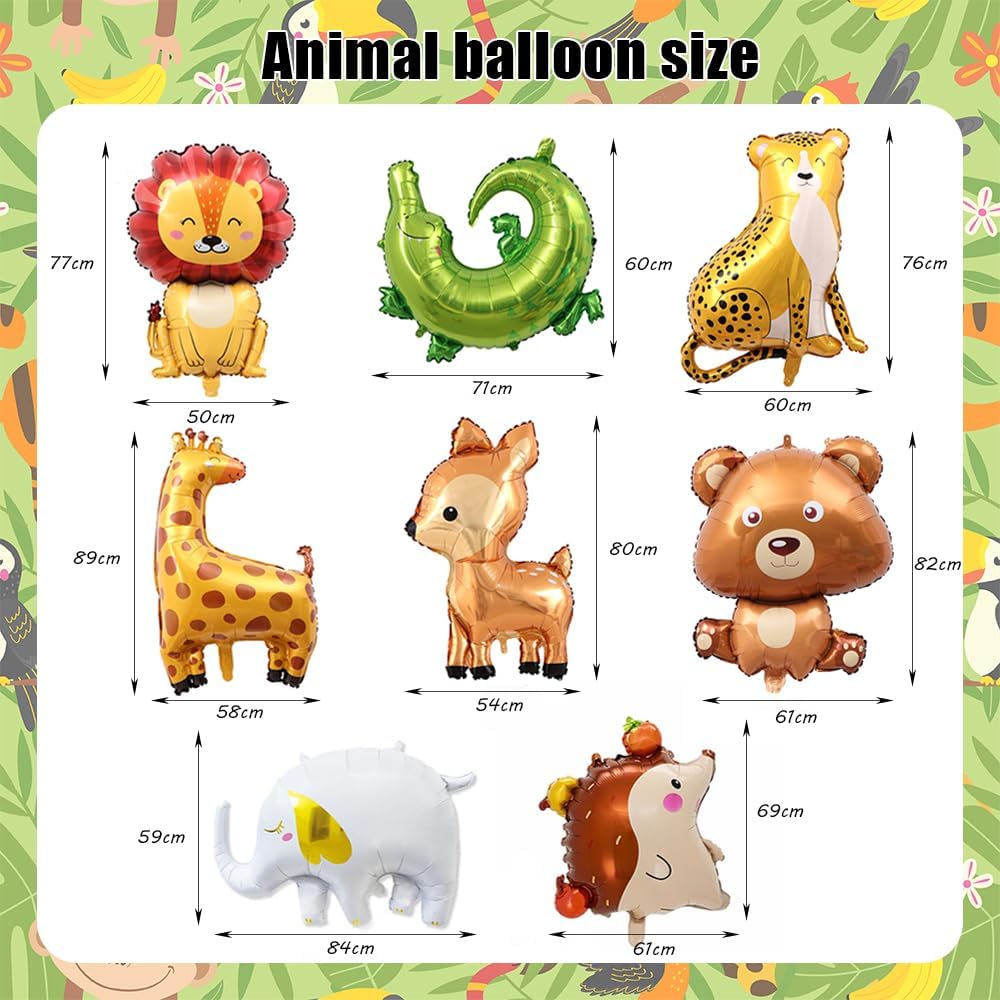 【Set completo】 Confezione da 8 diversi palloncini in foil per safari e animali della giungla con ricci, cervi, orsi, leoni, leopardi, elefanti, coccodrilli e giraffe Qualità premium: realizzati in resistente foglio di alluminio che mantiene forma e vivacità durante la celebrazione Decorazione versatile: perfetta per feste a tema giungla, celebrazioni safari, eventi a tema zoo e feste di compleanno per bambini Diversità degli animali: adorabile mix di simpatiche creature della foresta e maestosi animali da safari crea un'atmosfera di festa coinvolgente. Utilizzo pratico: compatibile con riempimento ad elio e aria, utilizzabile per spettacolari allestimenti per feste