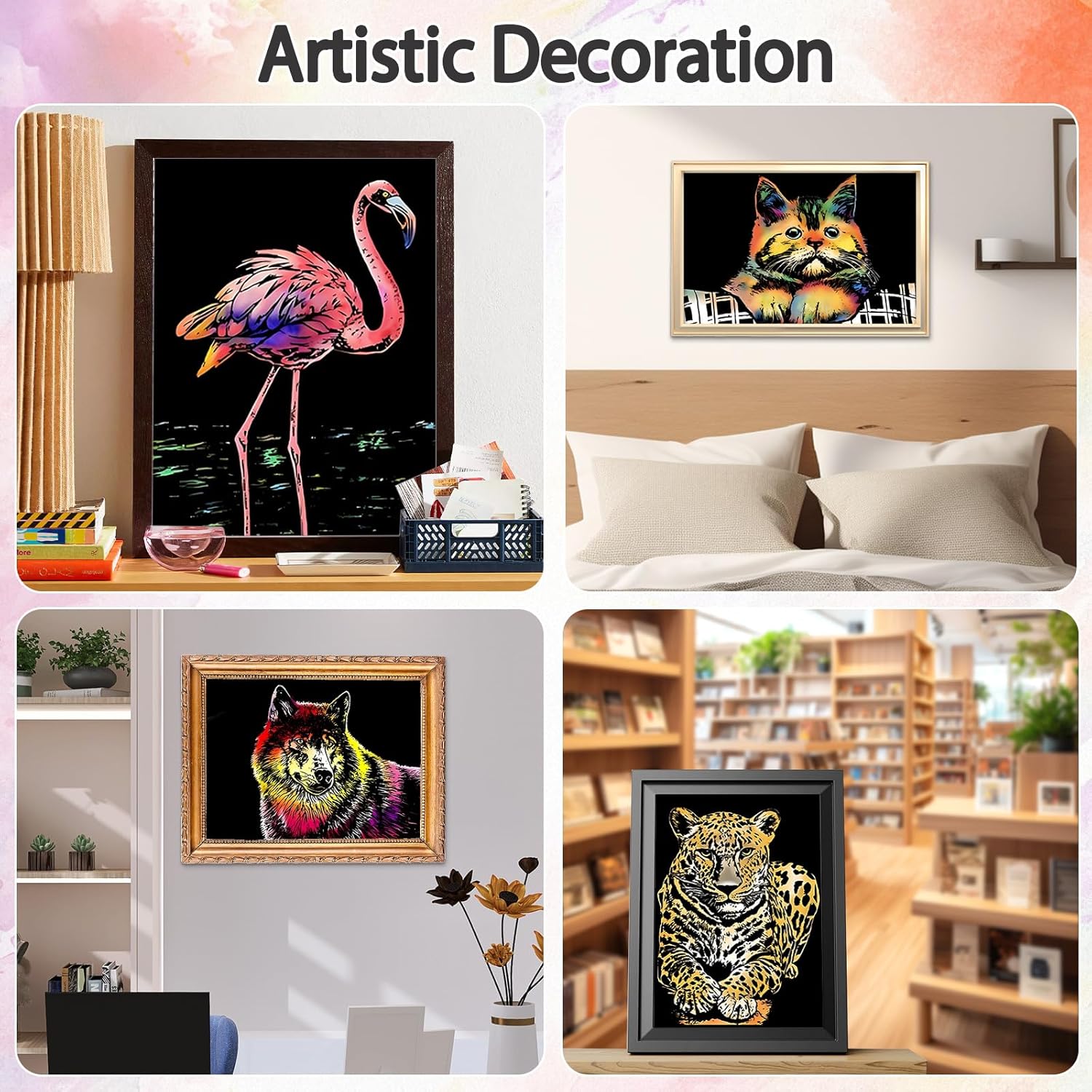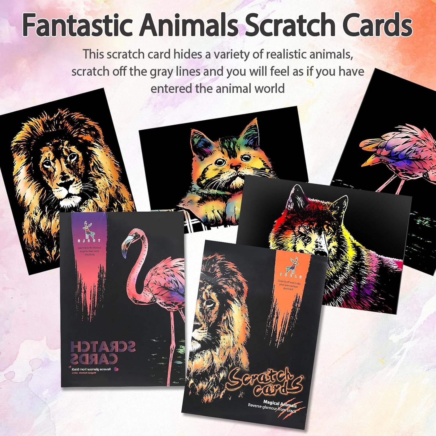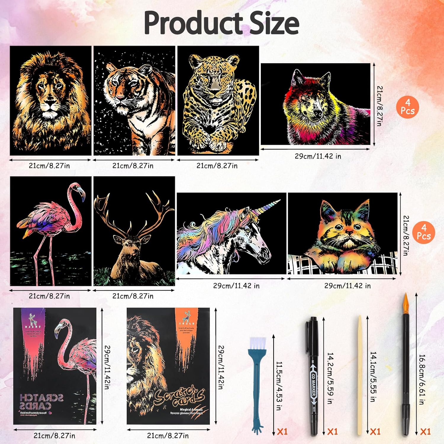 Set per grattacieli: riceverete 8 immagini da grattare per adulti, tra cui scratch Pen, spazzole per la pulizia, penne di riparazione e penne in legno, con motivi ricchi e strumenti completi, adatti per adulti e bambini per creare arte. MATERIALI SICURI E DI ALTA QUALITÀ: i graffi painting sono realizzati in cartone atossico ed ecologico con un rivestimento nero sulla superficie. Questo set di carta antigraffio è sicuro per le persone, in modo da poter godere del divertimento dell'arte da grattare per adulti e allo stesso tempo un'esperienza interessante e sana. FACILE E ARTISTICO DA USARE: la pittura a graffi utilizza colori vivaci e motivi realistici di animali nascosti sotto il rivestimento opaco. Basta utilizzare una penna in legno per raschiare il rivestimento nero e rivelare il motivo colorato sottostante. Facile da usare, ideale per i principianti e per tutti coloro che vogliono occuparsi dell'arte dell'incisione o dei graffi per bambini. Rilassamento senza stress: con le carte da graffio creative potrete trovare attività creative di artigianato nella vostra vita lavorativa intensa e risparmiare tempo e offrire a adolescenti e artisti adulti una piacevole esperienza creativa e sensazioni di successo. Questo set di arte antigraffio è ideale per i bambini per sviluppare la creatività e per gli adulti per rilassarsi. Regalo creativo: il libro per scarabocchi è un ottimo regalo per compleanno, festa dei bambini, festa della mamma e del papà, San Valentino, matrimonio, festa di anniversario, ecc. Puoi anche montarlo con una cornice. Appeso alla parete o posizionato sulla scrivania, aumenta l'atmosfera artistica e decora la casa.