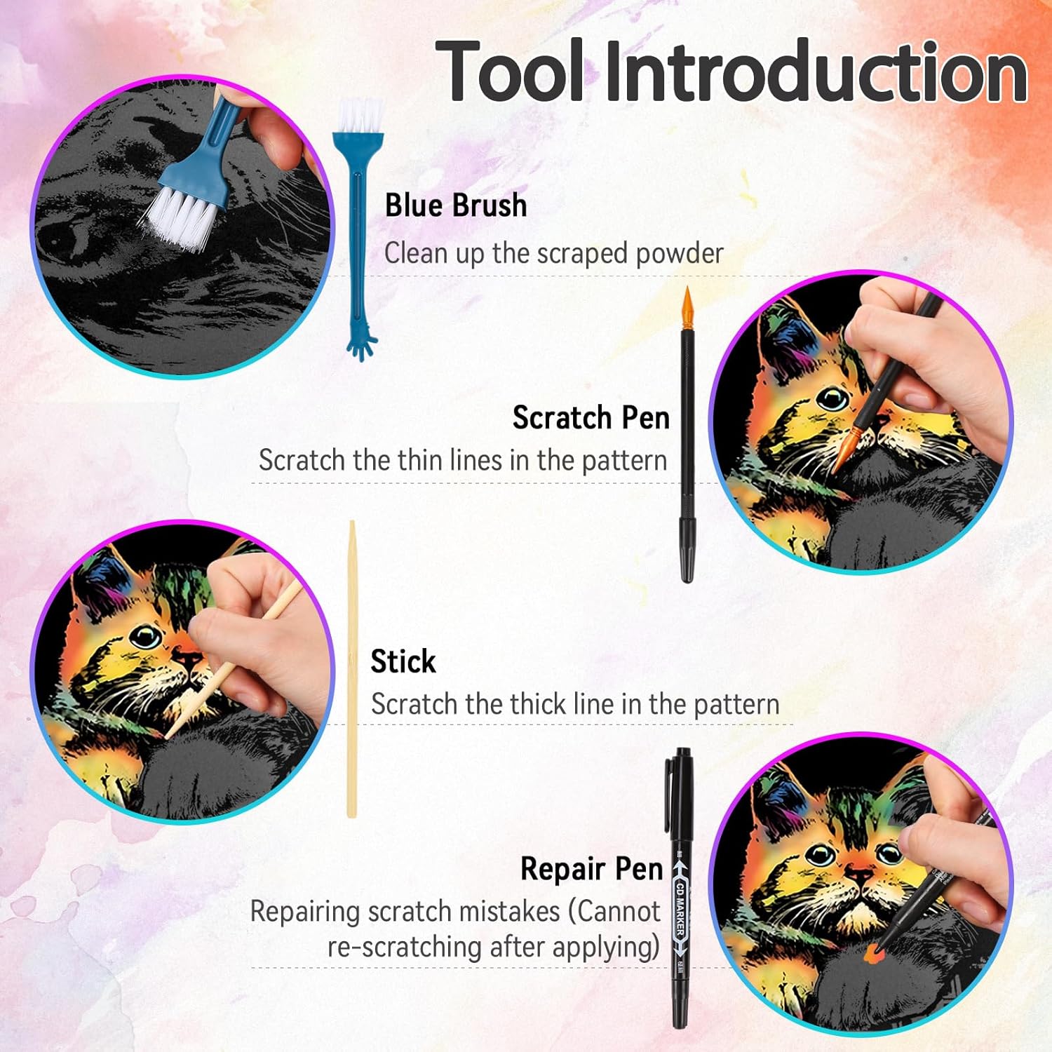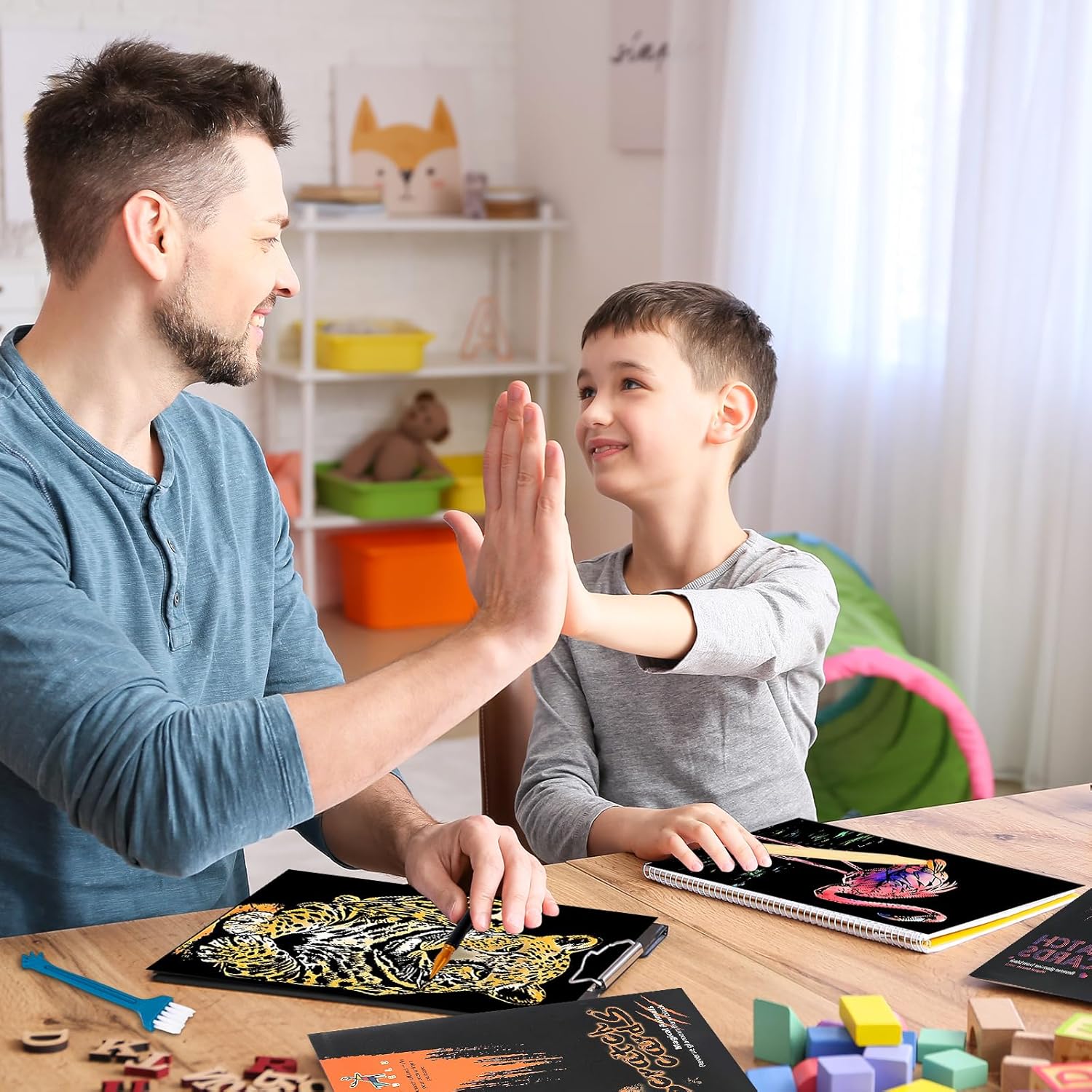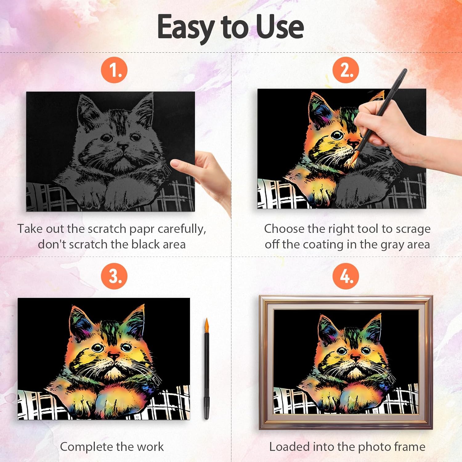 Set per grattacieli: riceverete 8 immagini da grattare per adulti, tra cui scratch Pen, spazzole per la pulizia, penne di riparazione e penne in legno, con motivi ricchi e strumenti completi, adatti per adulti e bambini per creare arte. MATERIALI SICURI E DI ALTA QUALITÀ: i graffi painting sono realizzati in cartone atossico ed ecologico con un rivestimento nero sulla superficie. Questo set di carta antigraffio è sicuro per le persone, in modo da poter godere del divertimento dell'arte da grattare per adulti e allo stesso tempo un'esperienza interessante e sana. FACILE E ARTISTICO DA USARE: la pittura a graffi utilizza colori vivaci e motivi realistici di animali nascosti sotto il rivestimento opaco. Basta utilizzare una penna in legno per raschiare il rivestimento nero e rivelare il motivo colorato sottostante. Facile da usare, ideale per i principianti e per tutti coloro che vogliono occuparsi dell'arte dell'incisione o dei graffi per bambini. Rilassamento senza stress: con le carte da graffio creative potrete trovare attività creative di artigianato nella vostra vita lavorativa intensa e risparmiare tempo e offrire a adolescenti e artisti adulti una piacevole esperienza creativa e sensazioni di successo. Questo set di arte antigraffio è ideale per i bambini per sviluppare la creatività e per gli adulti per rilassarsi. Regalo creativo: il libro per scarabocchi è un ottimo regalo per compleanno, festa dei bambini, festa della mamma e del papà, San Valentino, matrimonio, festa di anniversario, ecc. Puoi anche montarlo con una cornice. Appeso alla parete o posizionato sulla scrivania, aumenta l'atmosfera artistica e decora la casa.