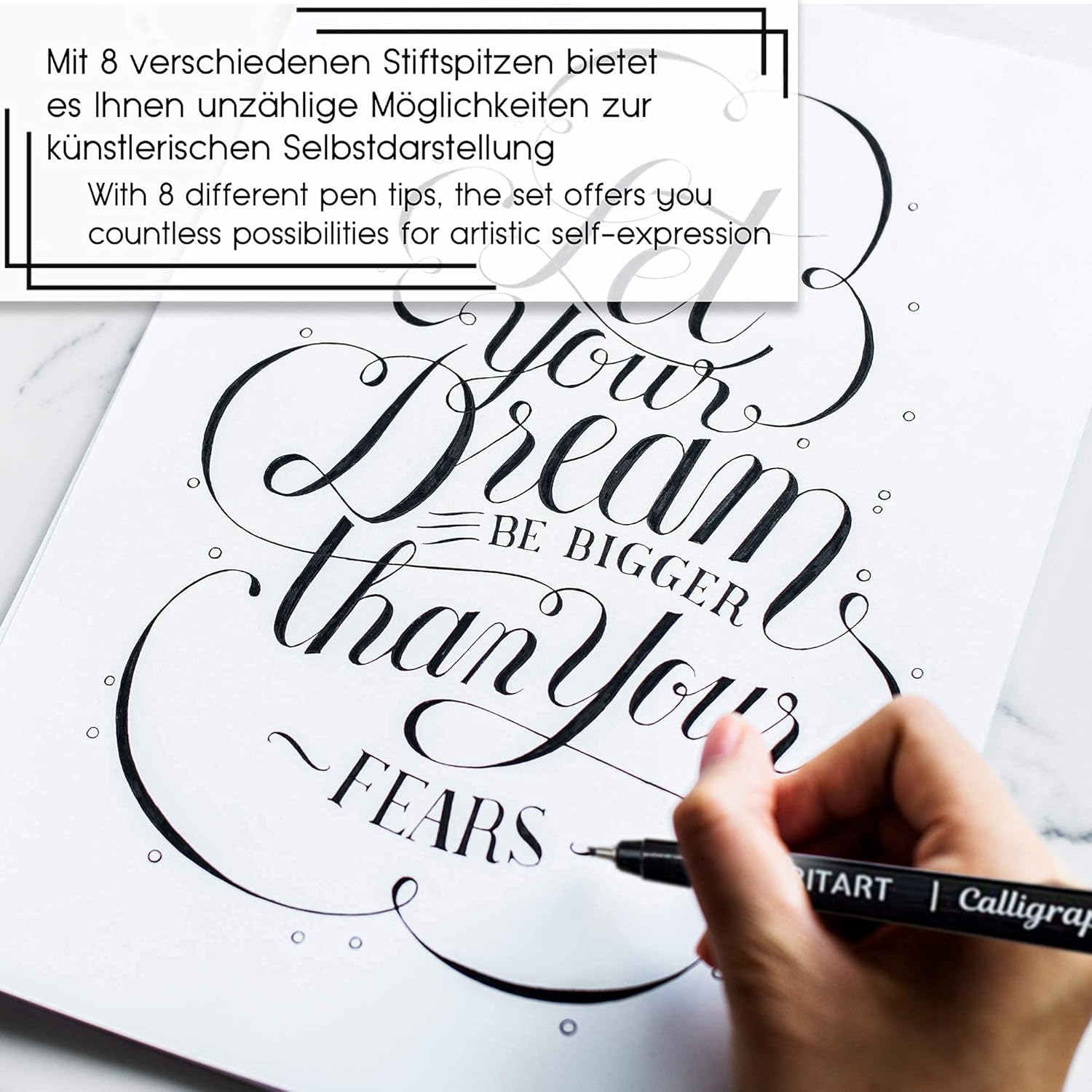 8 punti di forza: in questo set di penne a pennello troverete la penna giusta per disegnare o per la calligrafia, perché queste penne hanno 8 spessori di tratto da extra fine fino a 3 mm. Le penne a pennello consentono anche il passaggio da linee spesse a sottili con il cambiamento della pressione della penna. Penna a pennello durevole: le nostre penne per calligrafia hanno una punta flessibile che garantisce linee ricche e continue, con molta precisione. Le penne a pennello con elegante punta giapponese sono robuste e non si sfilacciano rapidamente. Inchiostro Giappone di alta qualità: ogni pennarello è riempito con inchiostro nero fine. Il colore dei pennarelli copre bene ed è resistente alla luce e non sbiadisce. Questo inchiostro pigmentato a base d'acqua delle matite in fibra è indelebile e impermeabile. Uso versatile: le penne per pennelli sono adatte sia per principianti che per calligrafi avanzati. La penna per calligrafia nera è adatta per scrapbooking, disegno e pittura. Il set di pennarelli è ideale anche per un Bullet Journal. REGALO CREATIVO: le matite da colorare per adulti sono perfette anche come regalo per amici creativi e familiari e per tutti coloro che amano realizzare la calligrafia e i progetti di scrittura a mano.