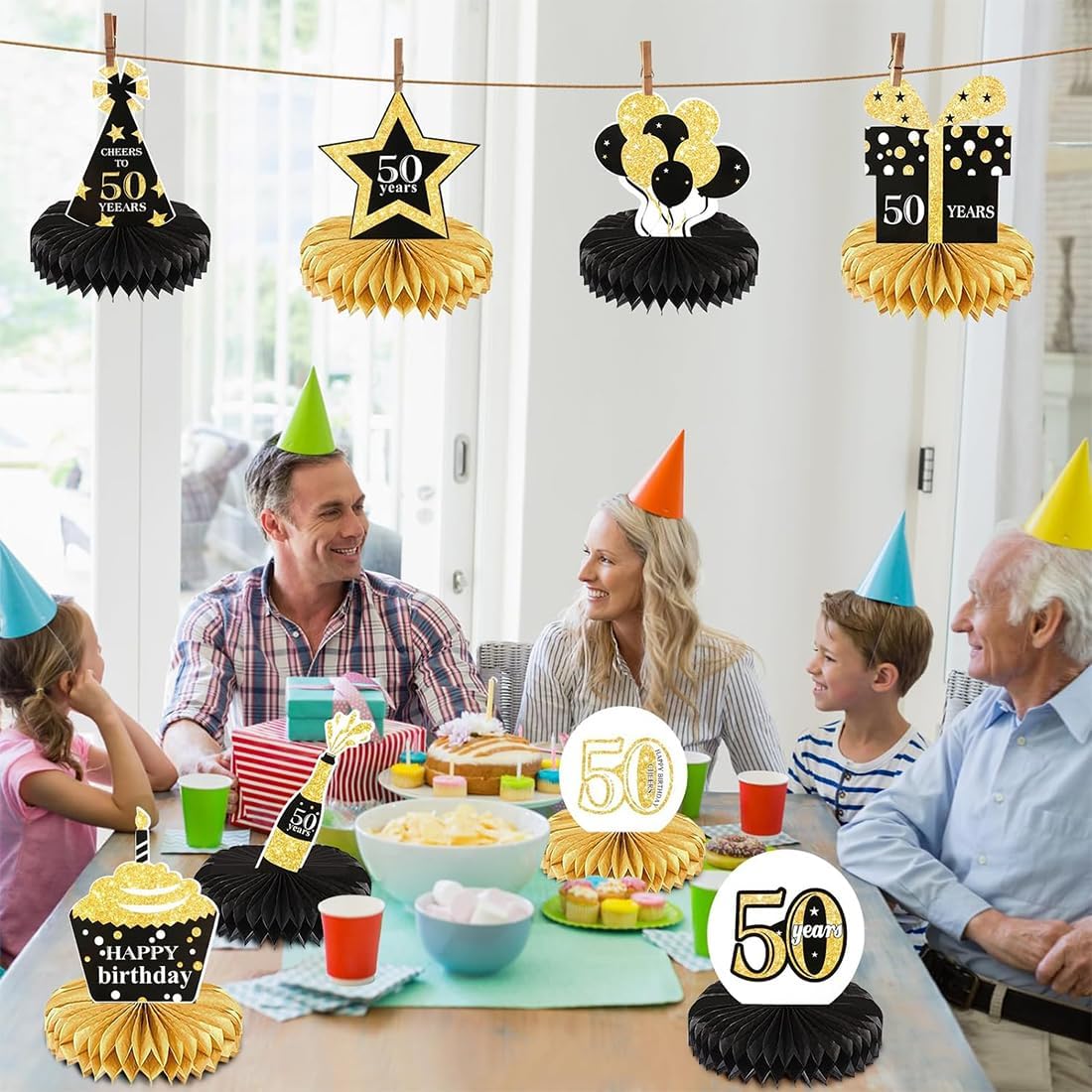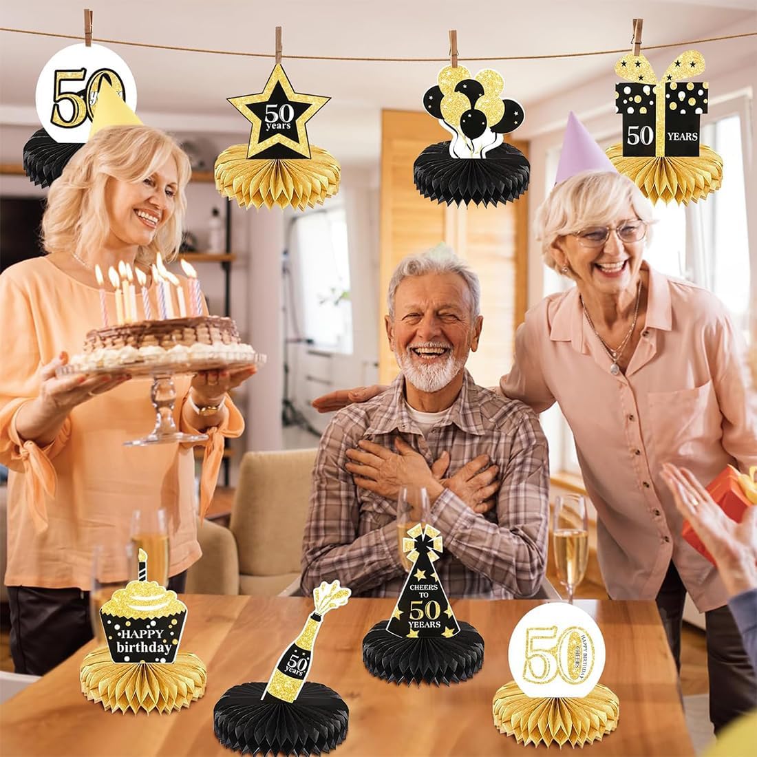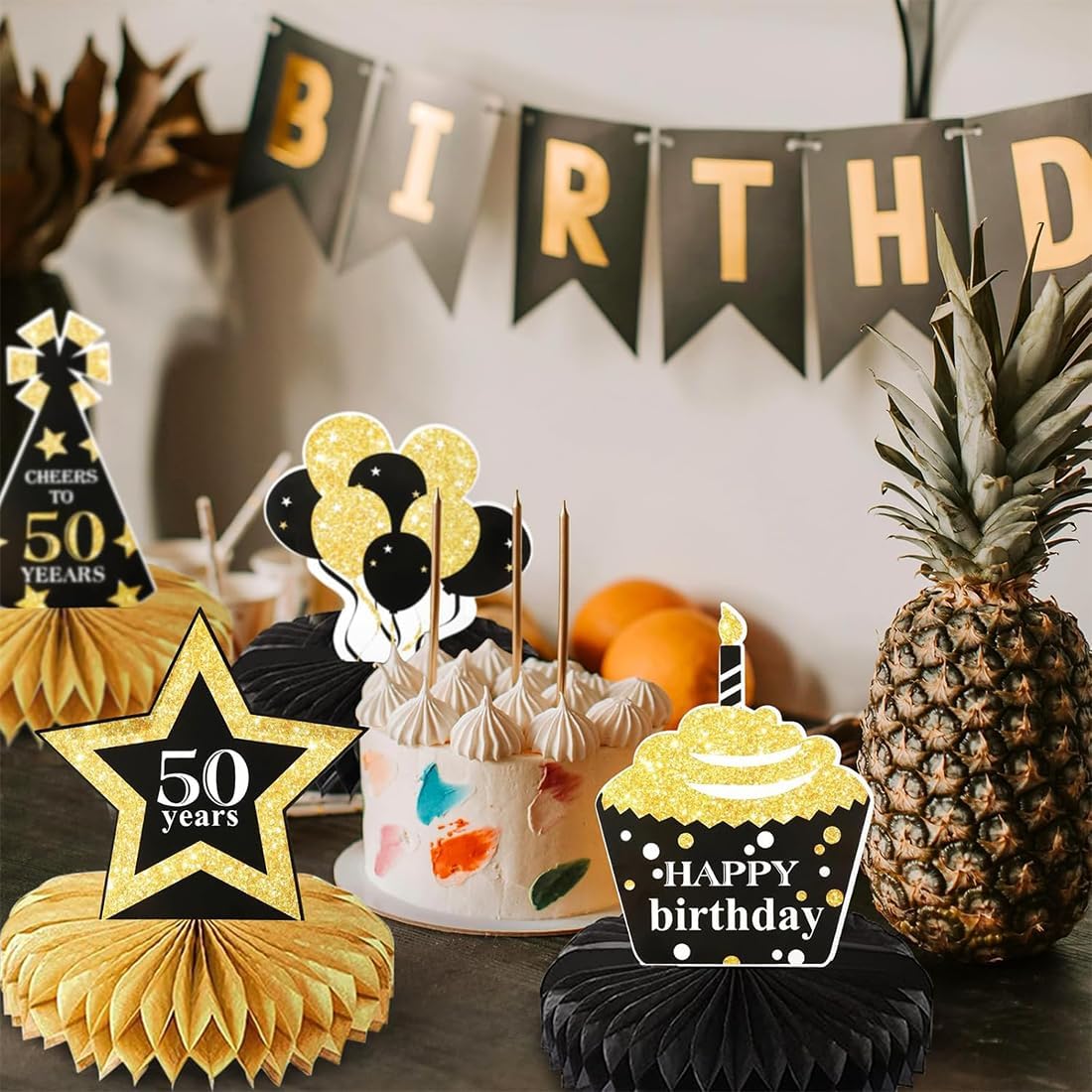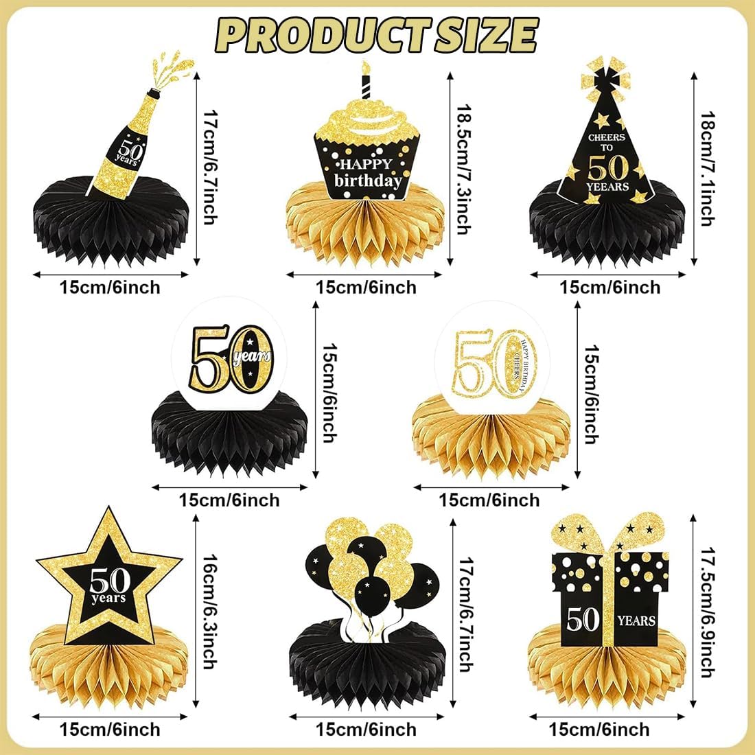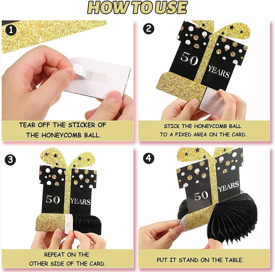 Decorazioni esclusive per il 50° compleanno Vernice in polvere nera, oro e oro 11 forme, tra cui bottiglie di champagne e cappellini da festa La base a nido d'ape è tridimensionale e semplice per creare un'atmosfera lussuosa e gioiosa Chicche accattivanti per la festa di compleanno Facile da montare Staccare l'adesivo a forma di sfera a nido d'ape e attaccarlo al portacarte Ripetere il procedimento su entrambi i lati per montare il tavolo Non sono necessari strumenti complicati Le persone disabili possono montare il tavolo rapidamente Risparmia tempo di preparazione Adatto a una varietà di occasioni Può essere posizionato sul tavolo da pranzo Corde appese per decorare lo sfondo Riunioni di famiglia e feste con gli amici e altre occasioni possono essere incluse per rendere colorato lo stile della festa di compleanno Realizzato in cartone spesso e carta a nido d'ape, non si deforma e non si strappa facilmente, polvere d'oro massiccio, alta qualità, dimensioni adatte per il tavolo, stabile e riutilizzabile, buon rapporto qualità-prezzo. Un set per soddisfare una varietà di esigenze. Elementi di modellazione che coprono il compleanno per arricchire il livello visivo. Struttura a nido d'ape leggera e senso tridimensionale di solidità, per creare un senso di rituali esclusivi per regalare all'ospite del compleanno un'esperienza indimenticabile.