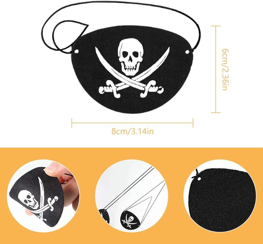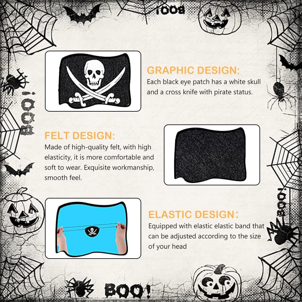 Patch Occhio Pirata: La benda sull'occhio del pirata è realizzata in feltro, che è morbido e può essere applicato ripetutamente. Benda Pirata: La dimensione di ogni benda sull'occhio dei pirati è di 8 * 6 cm. La corda elastica con design flessibile può essere estesa, il che significa che adulti o bambini possono indossarli senza sentirsi stretti. Benda per Occhi Pirata: La maschera per gli occhi dell'accessorio pirata è stampata con un motivo a teschio bianco e coltello a croce, che aumenta il significato divertente e simbolico dell'identità dei pirati, Dell'occhio regolabile patch rende il gioco di ruolo più vivido e ti consente di divertirti! Occhio Pirata: Condividi con amici e familiari, fai finta di navigare in alto mare con questa benda sull'occhio in feltro, prova la sensazione eccitante ed elettrizzante di trovare un tesoro. Accessori Pirati: Questa è una maschera per gli occhi da pirata molto bella e accattivante per adulti/bambini, perfetta per eventi festivi come Halloween, Natale, feste in maschera e cosplay. Allo stesso tempo, è anche il regalo perfetto per amici o familiari che amano i personaggi dei pirati.