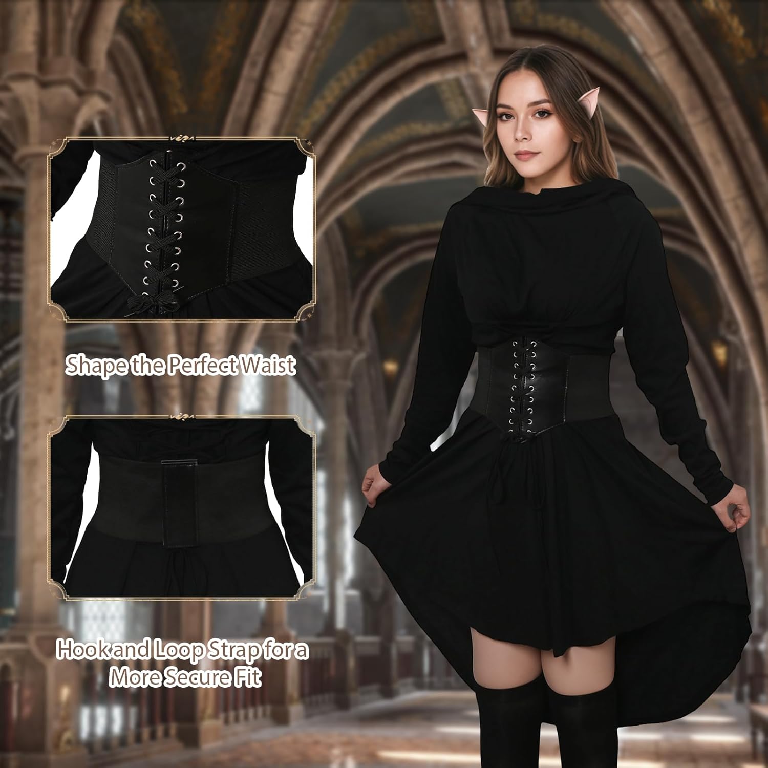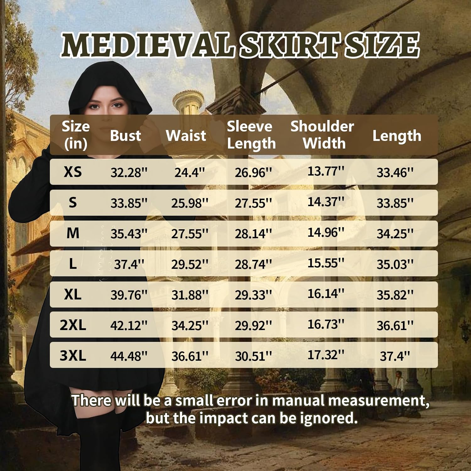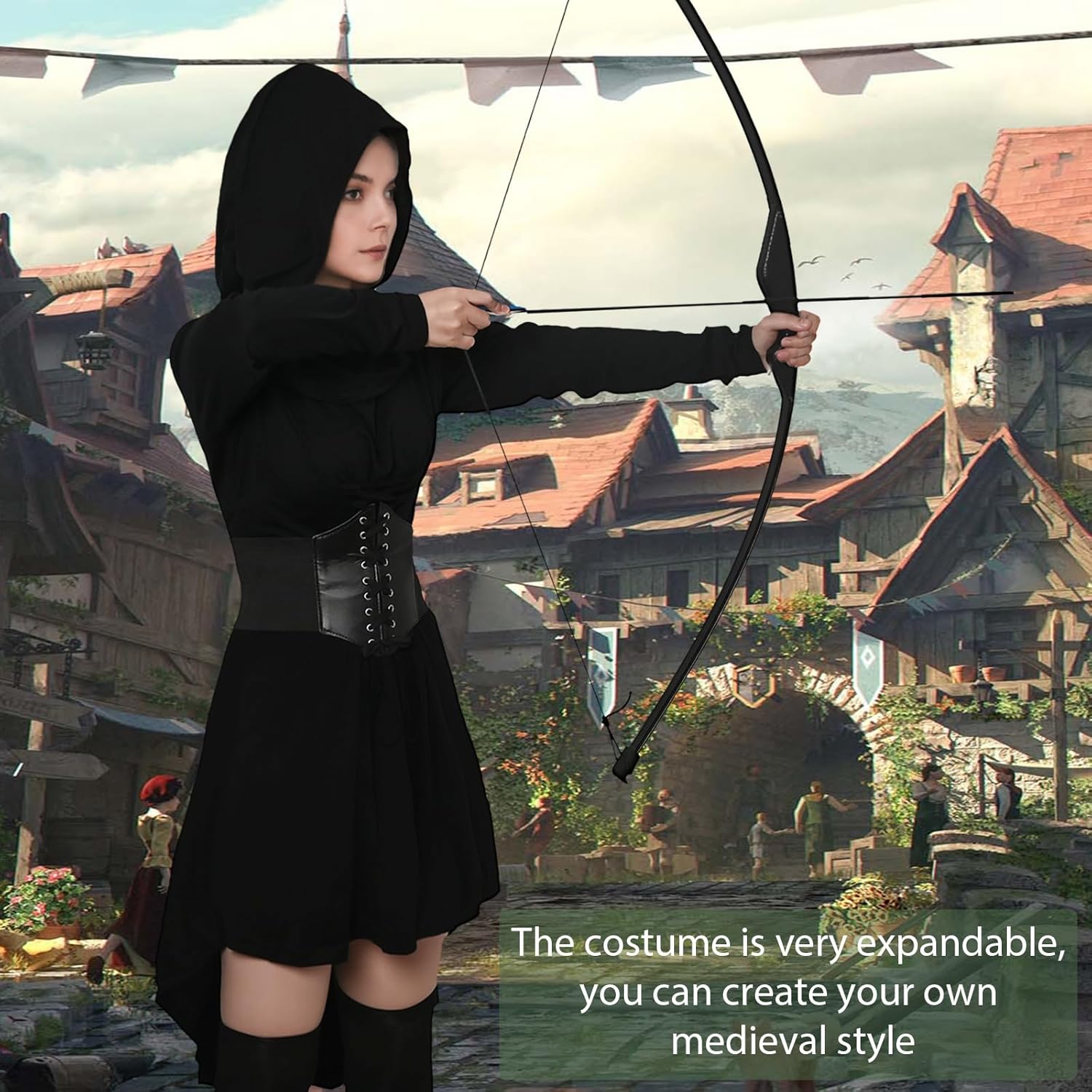 Descrizione prodotto 4 pezzi, costume rinascimentale da donna, stile gotico, abbigliamento medievale, vestito con cappuccio e corsetto, per feste di Halloween Avviso di sicurezza Da utilizzare sotto la supervisione di un adulto